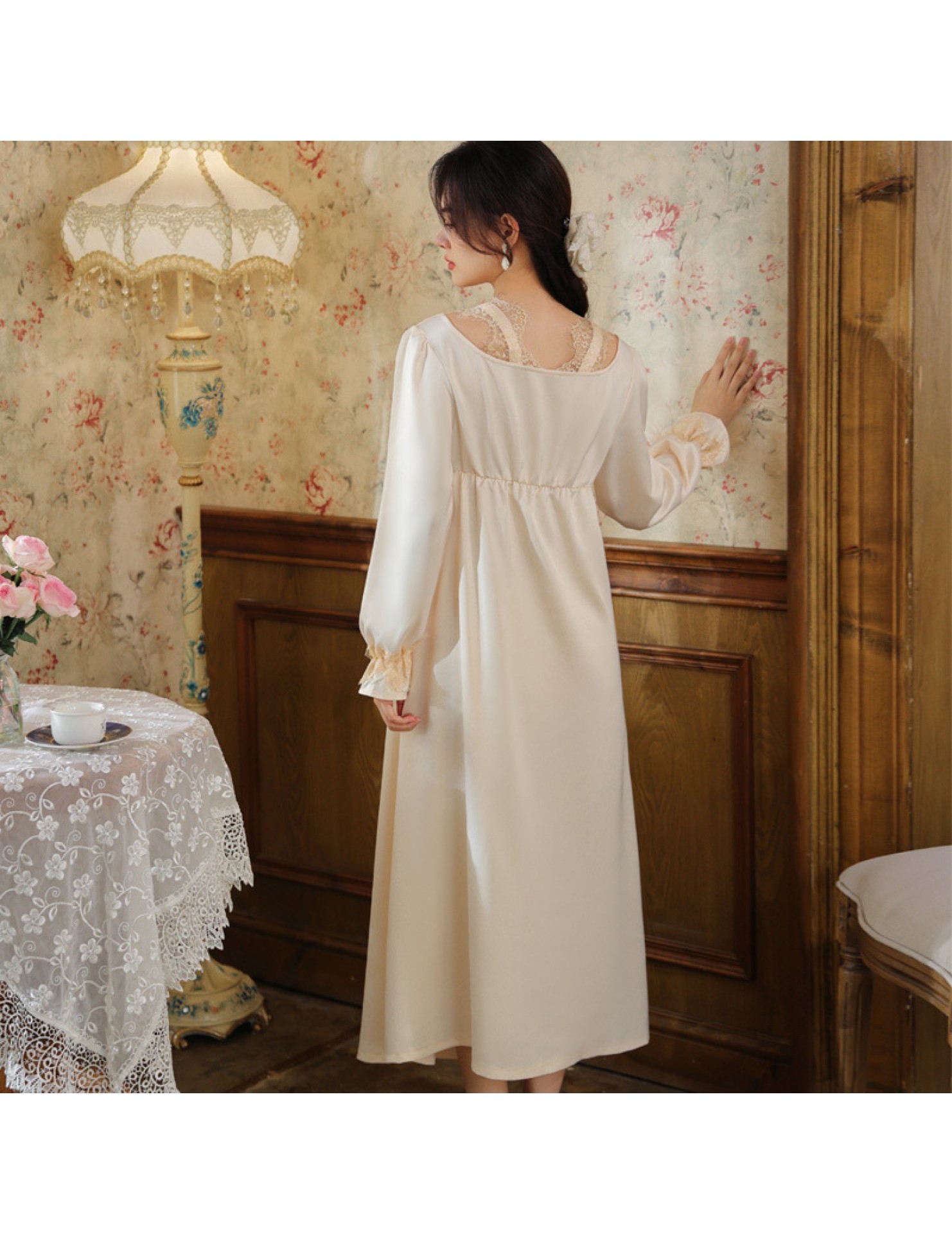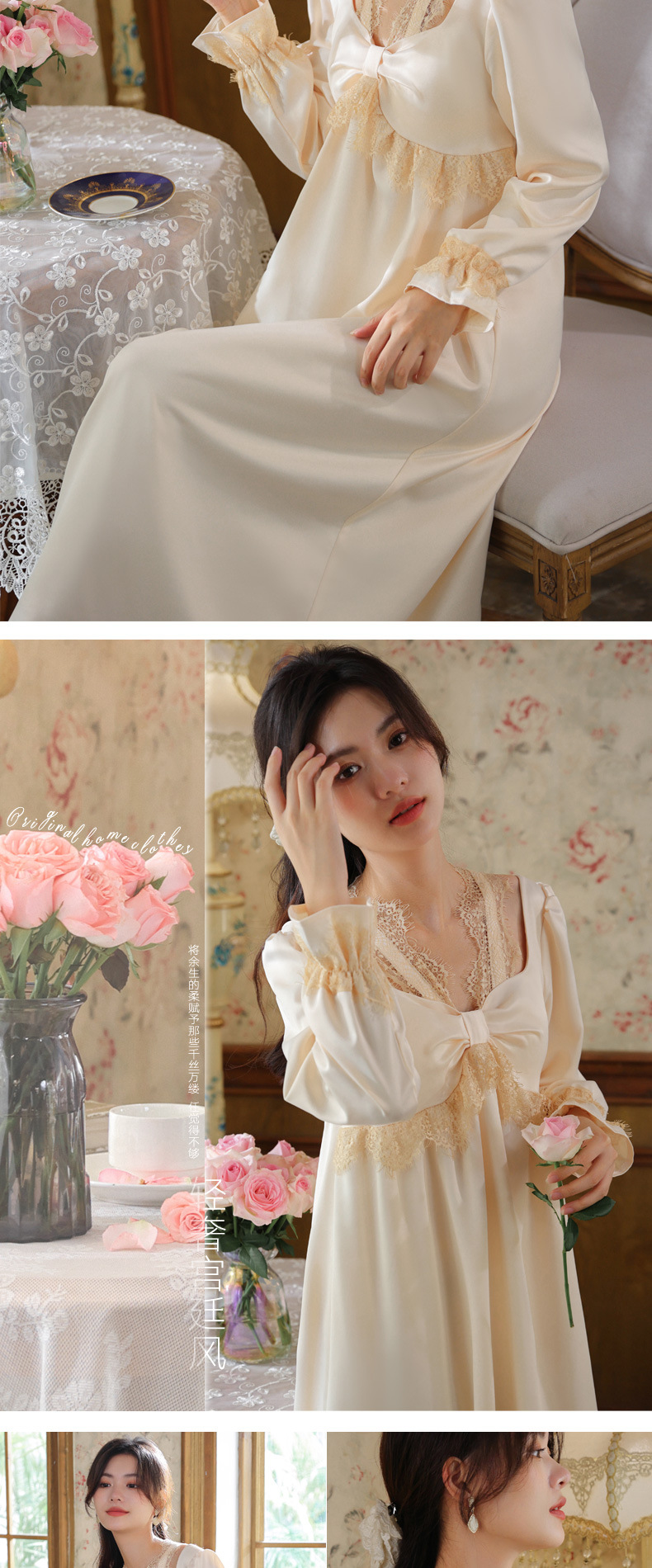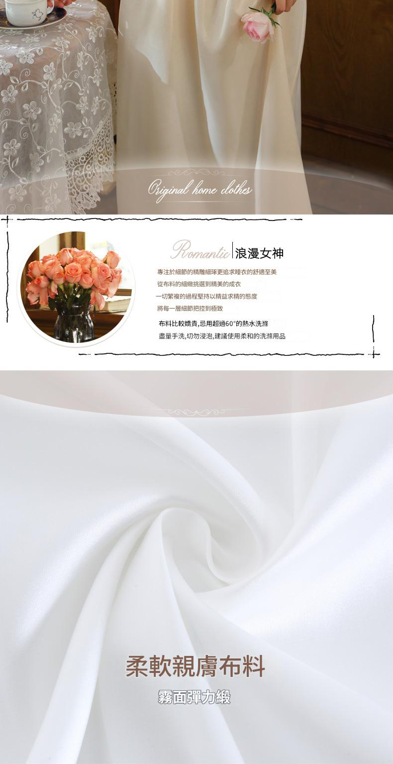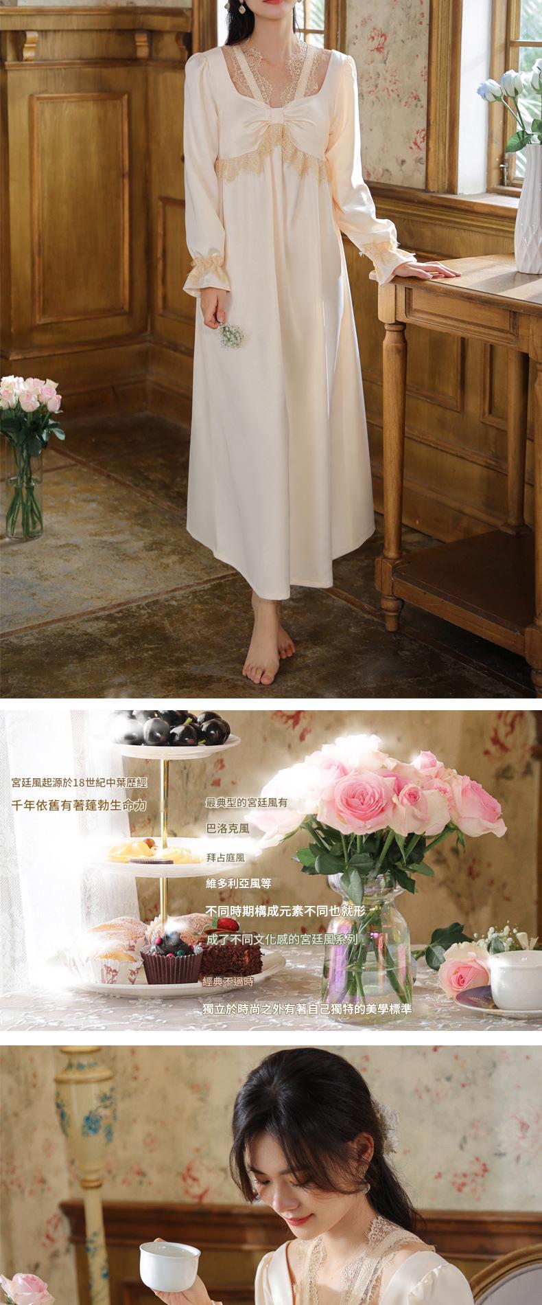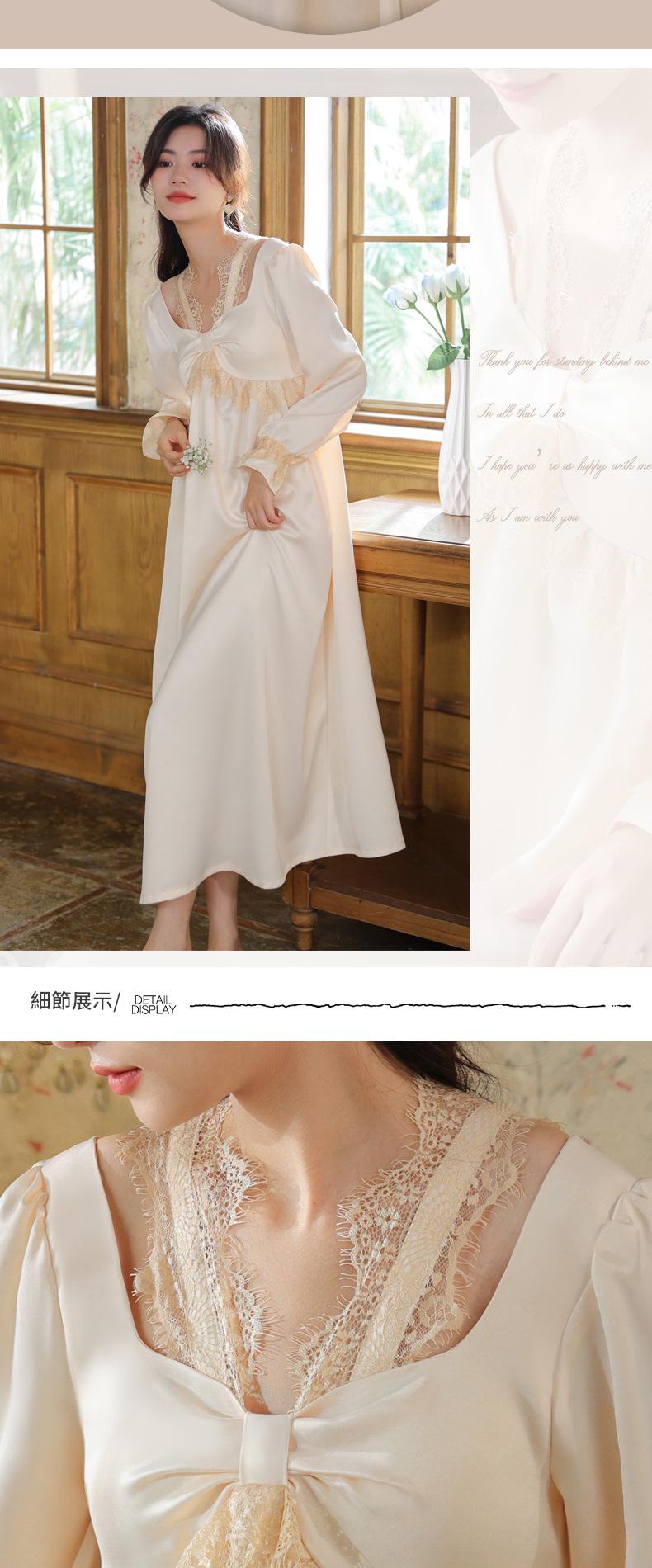 PRDN121100075 長袖睡裙女春仿真絲宮廷復古風蕾絲冰絲睡衣胸墊可外穿家居服秋冬