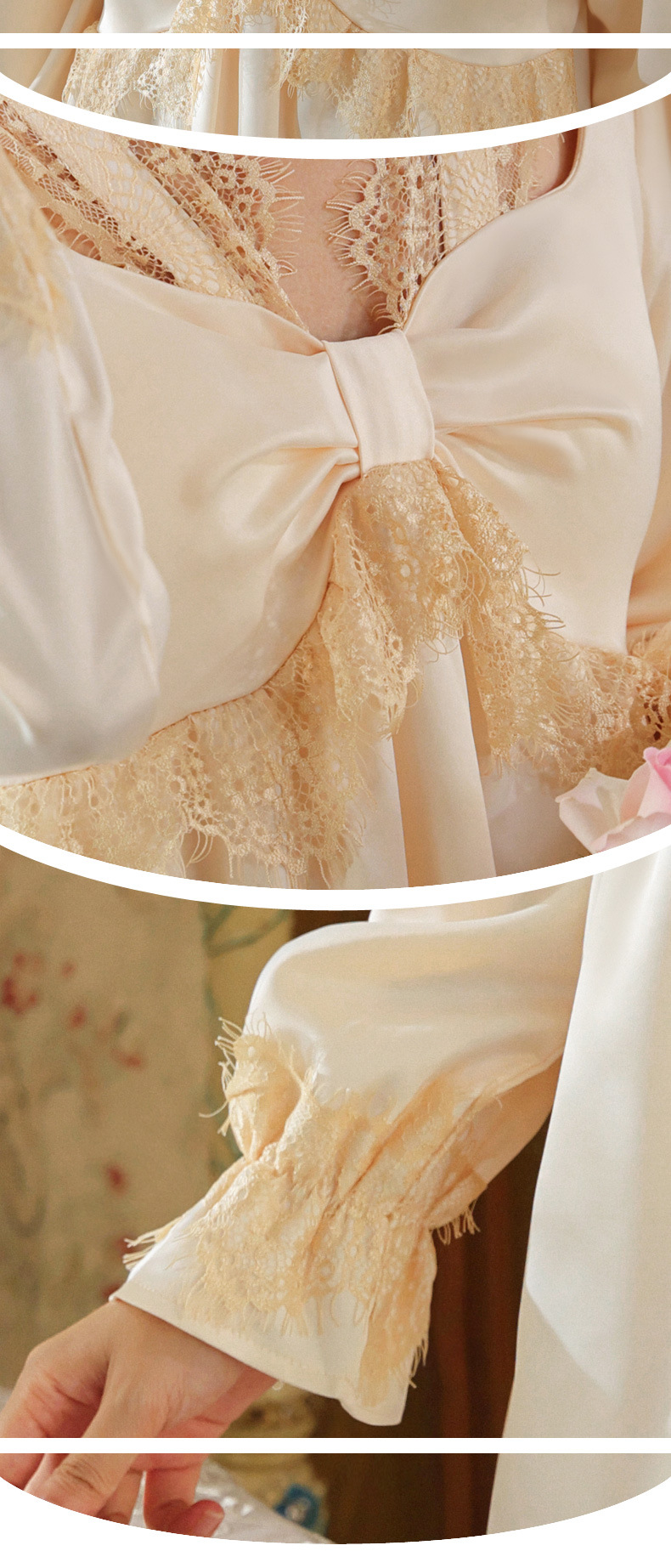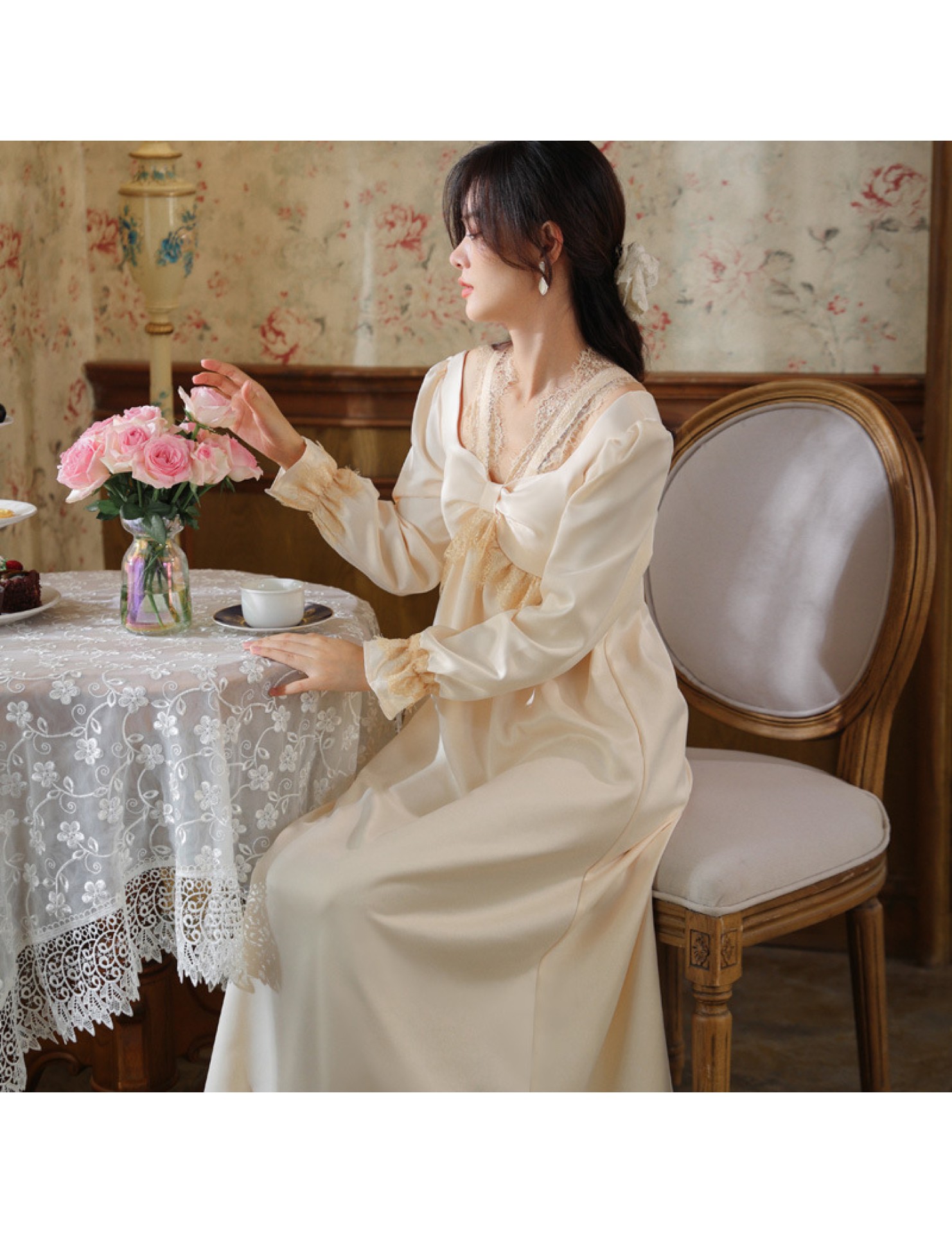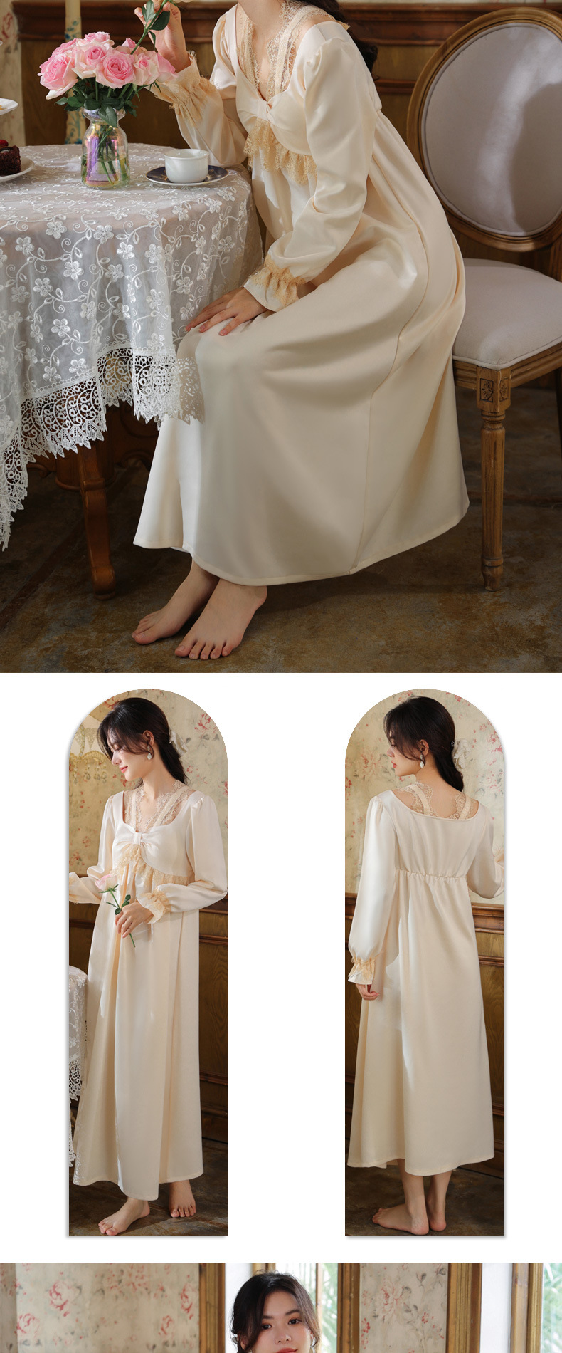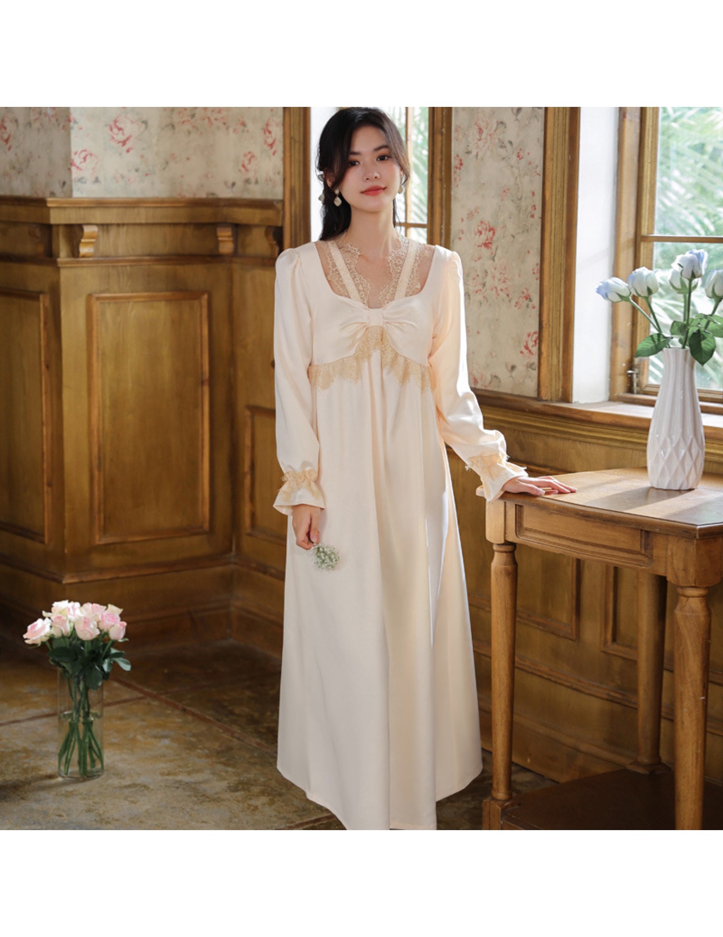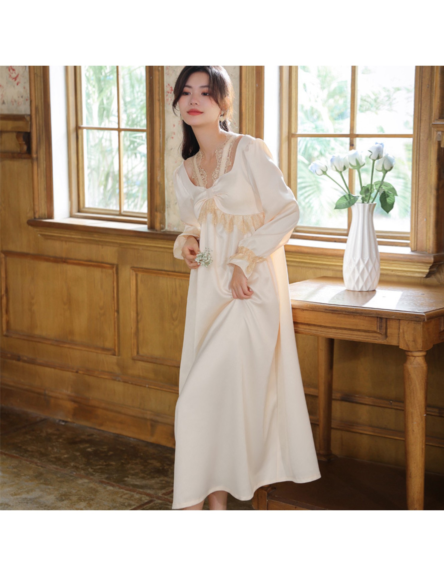PRDN121100075 長袖睡裙女春仿真絲宮廷復古風蕾絲冰絲睡衣胸墊可外穿家居服秋冬