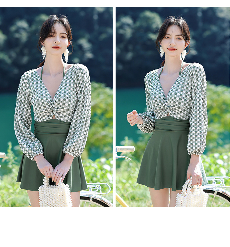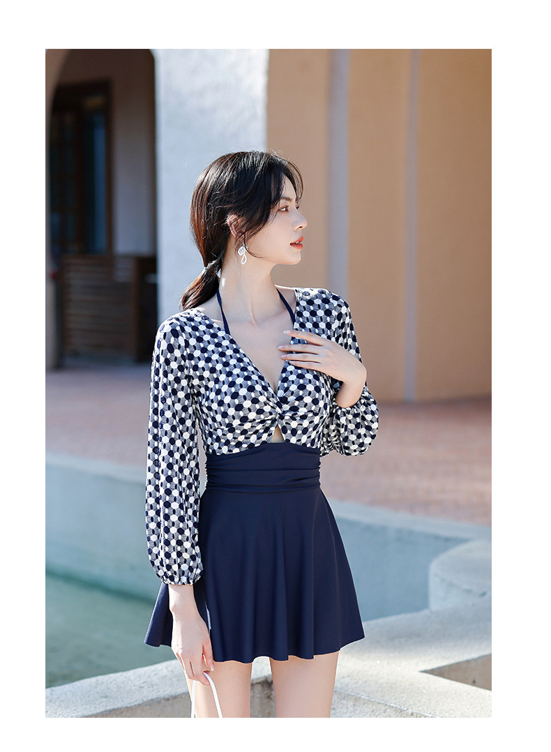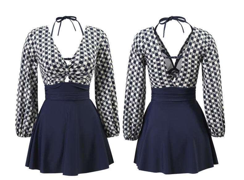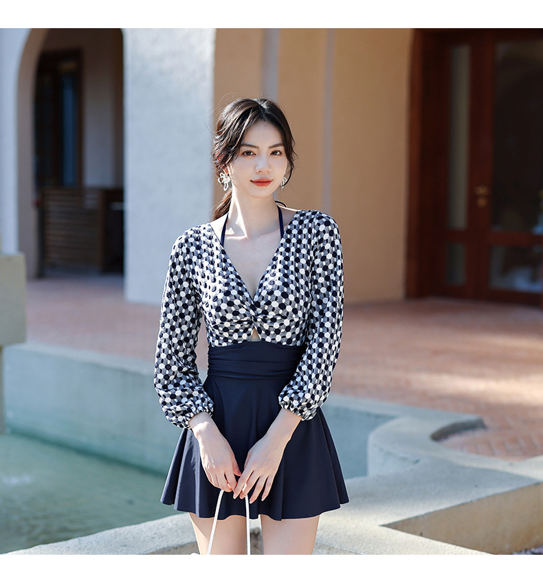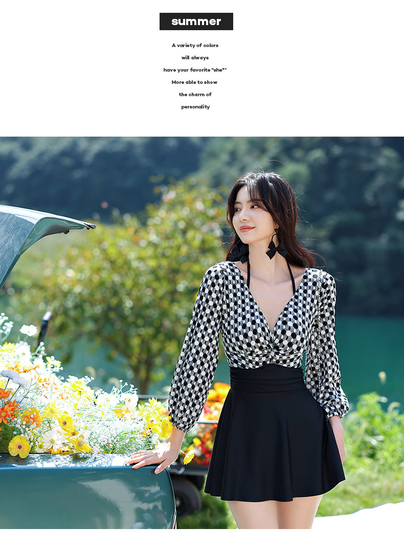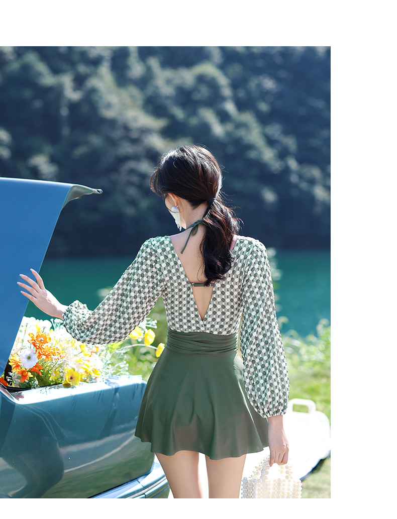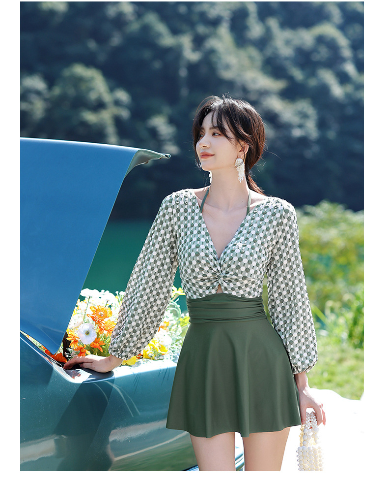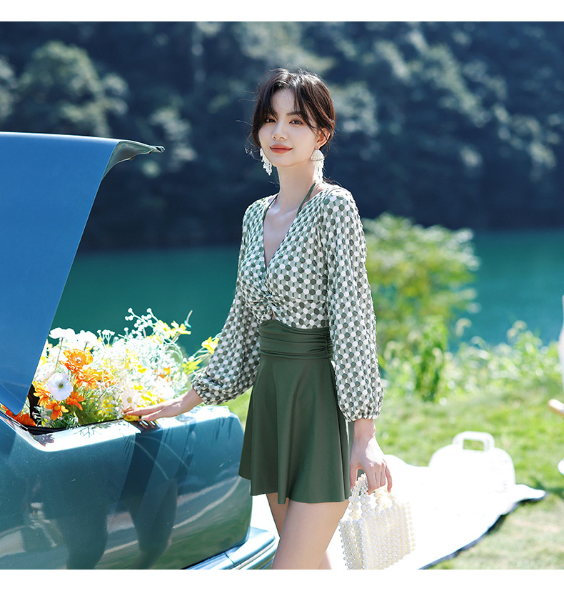 LFWN121100004 2025新款大碼長袖連體泳衣女裙式遮肚顯瘦保守游泳衣泡溫泉泳裝女