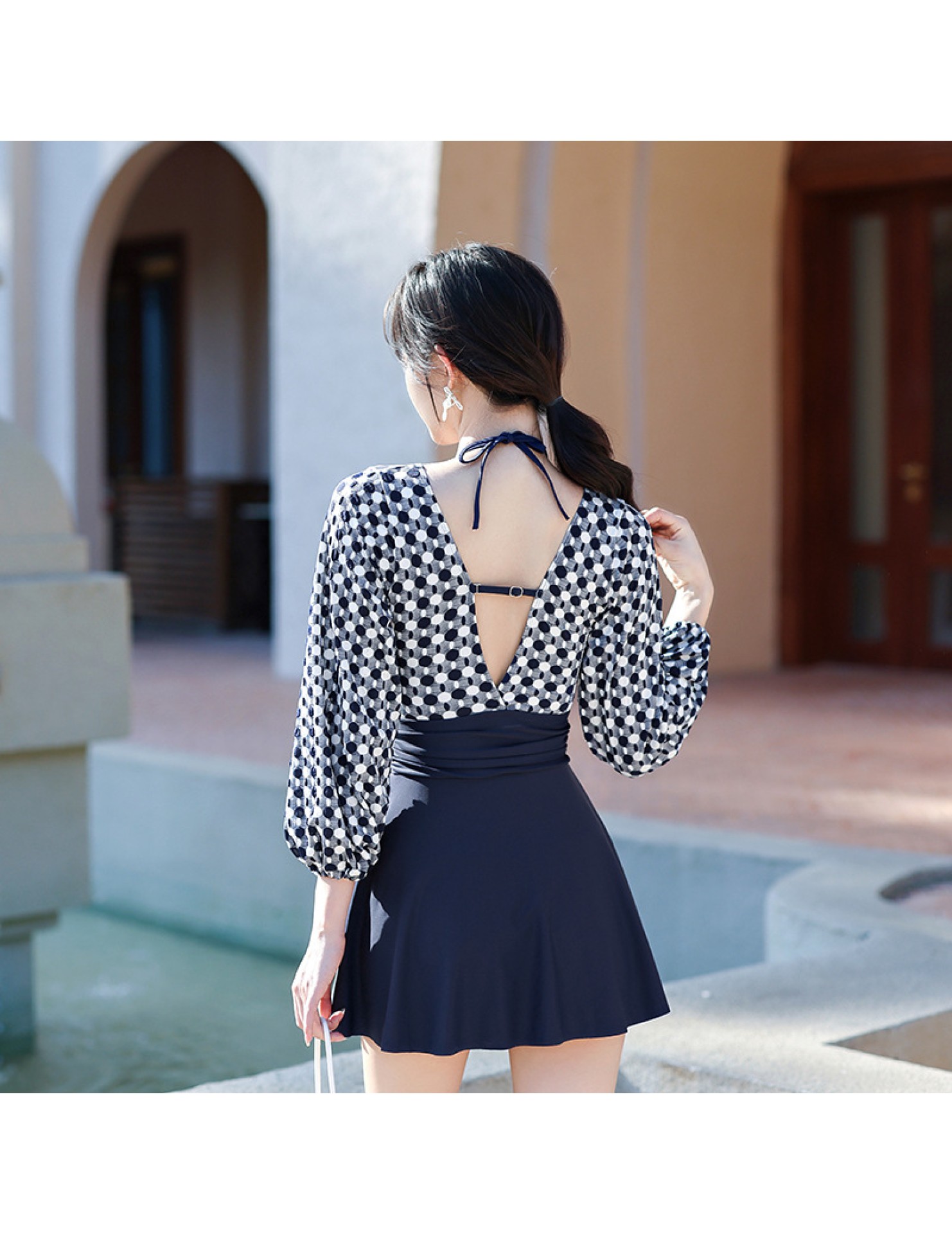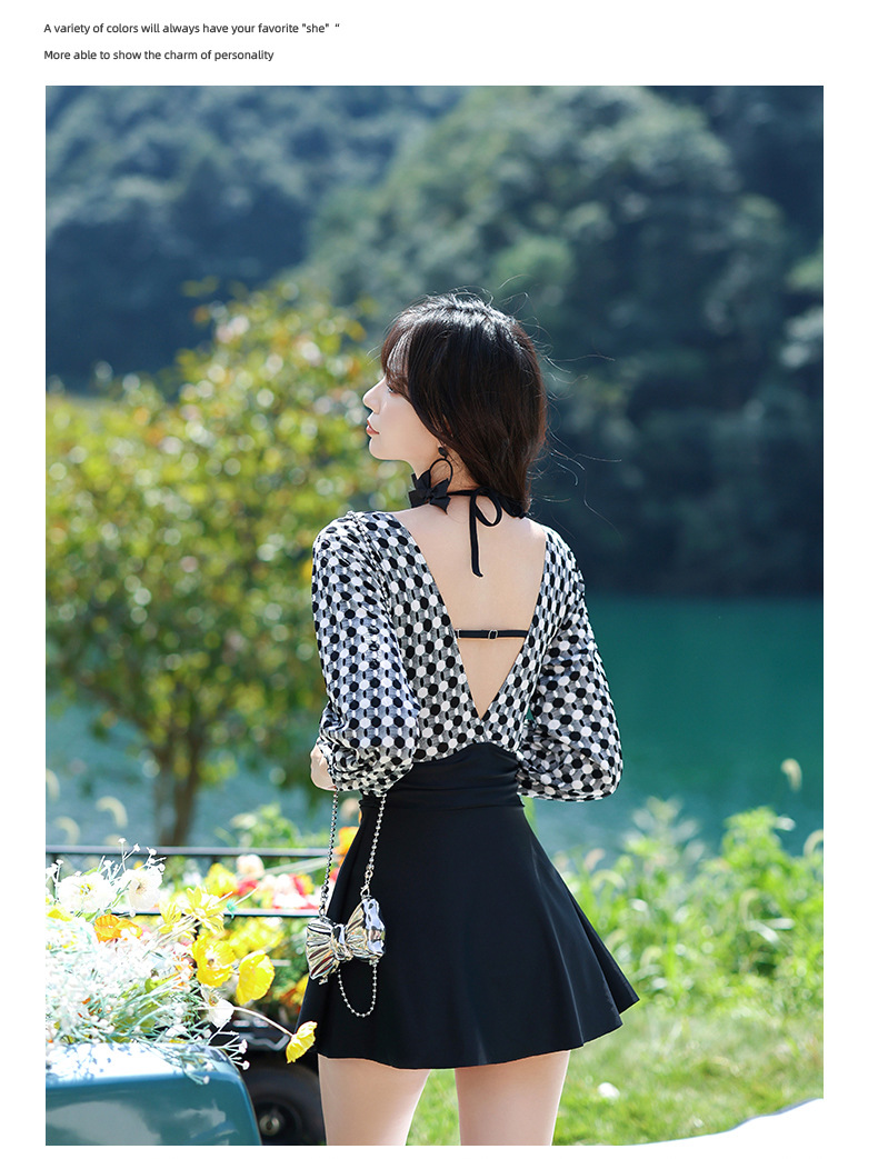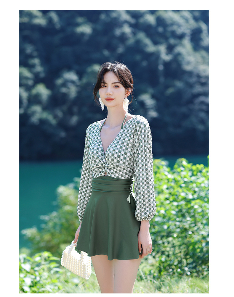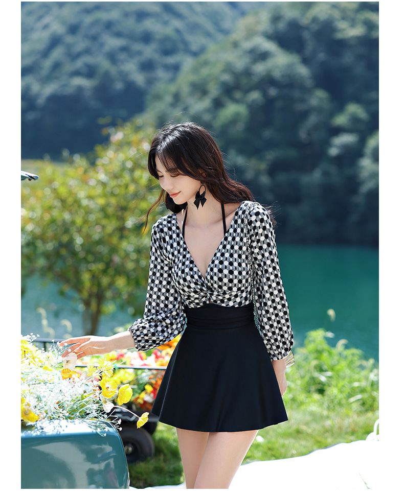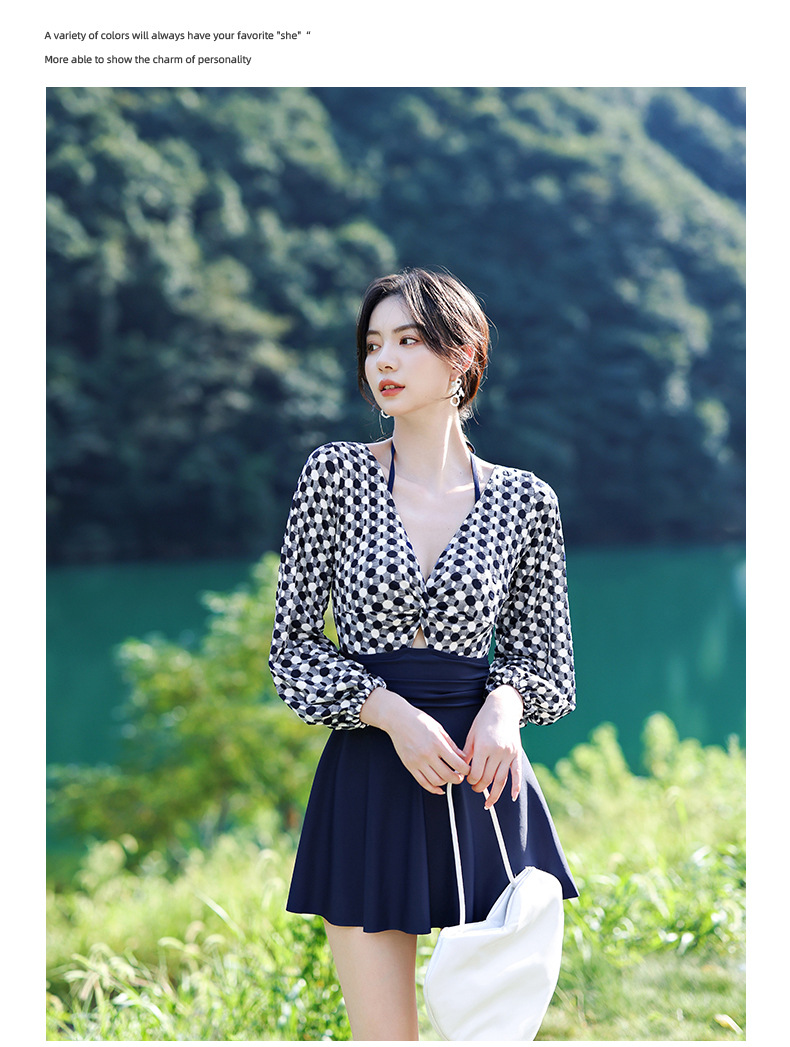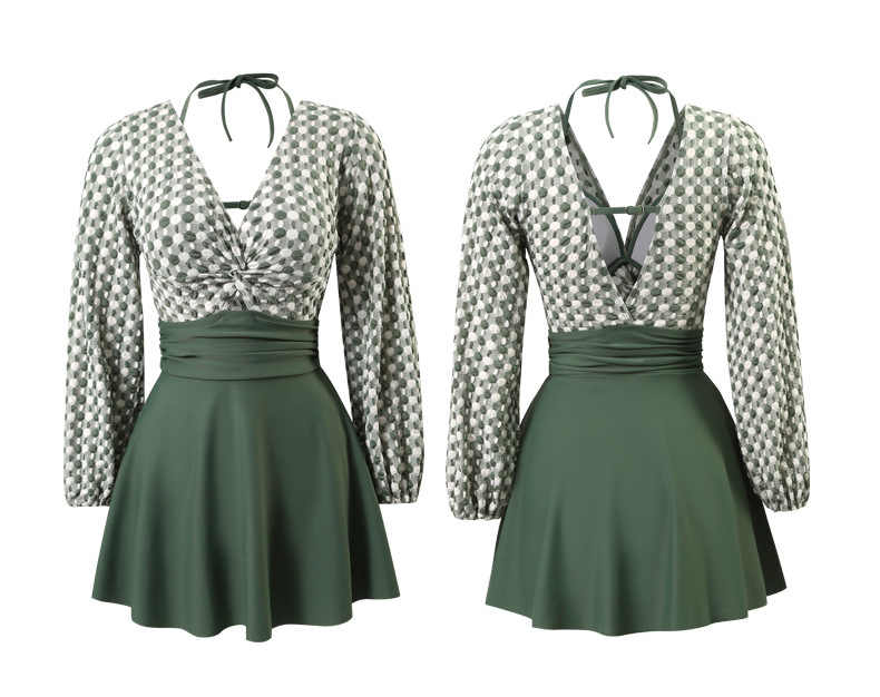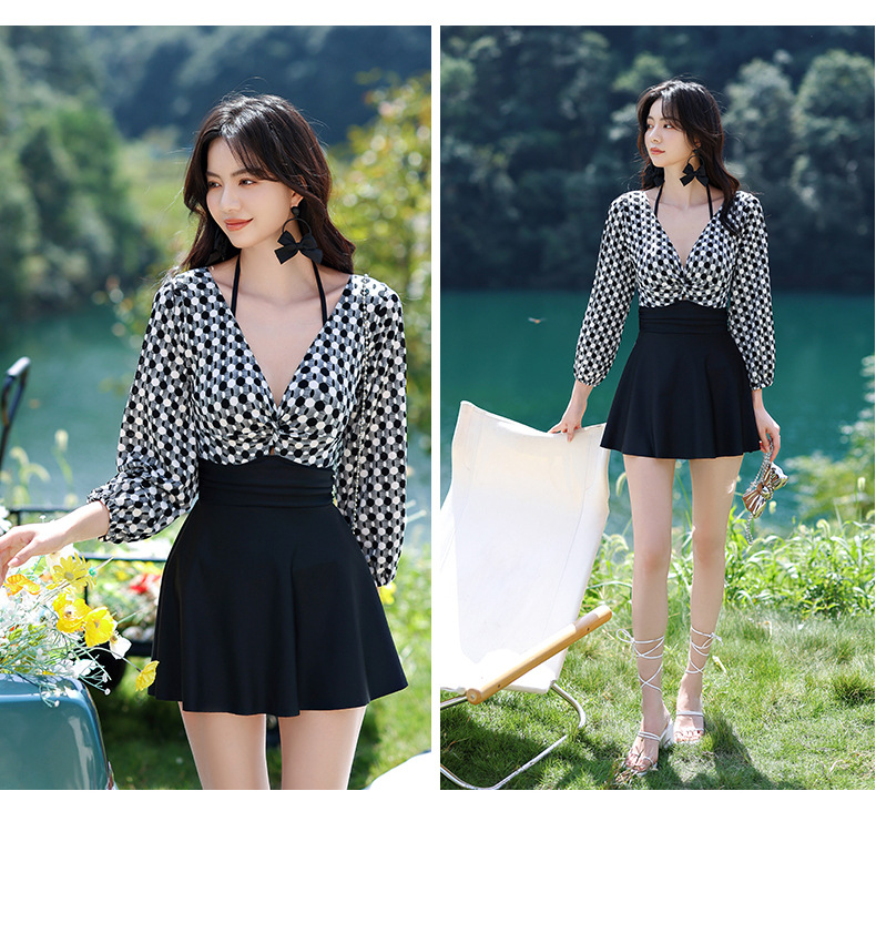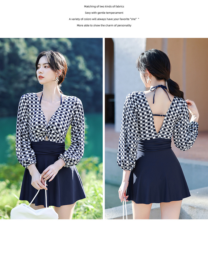 LFWN121100004 2025新款大碼長袖連體泳衣女裙式遮肚顯瘦保守游泳衣泡溫泉泳裝女