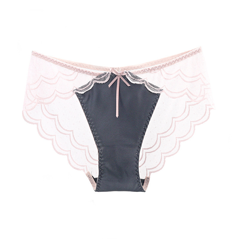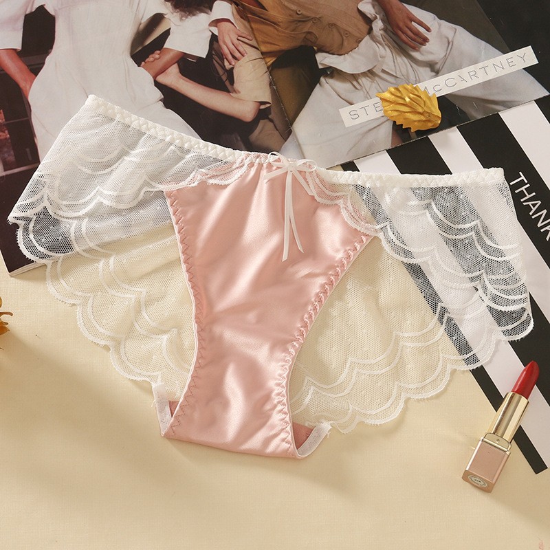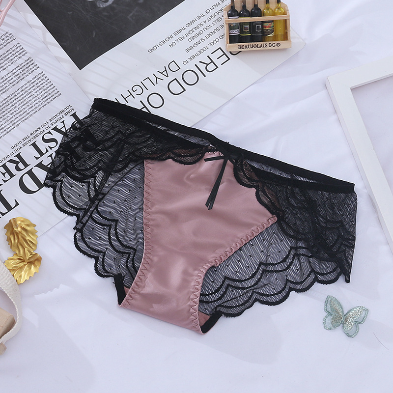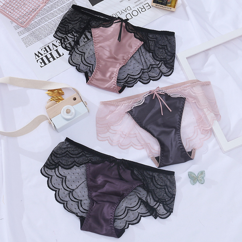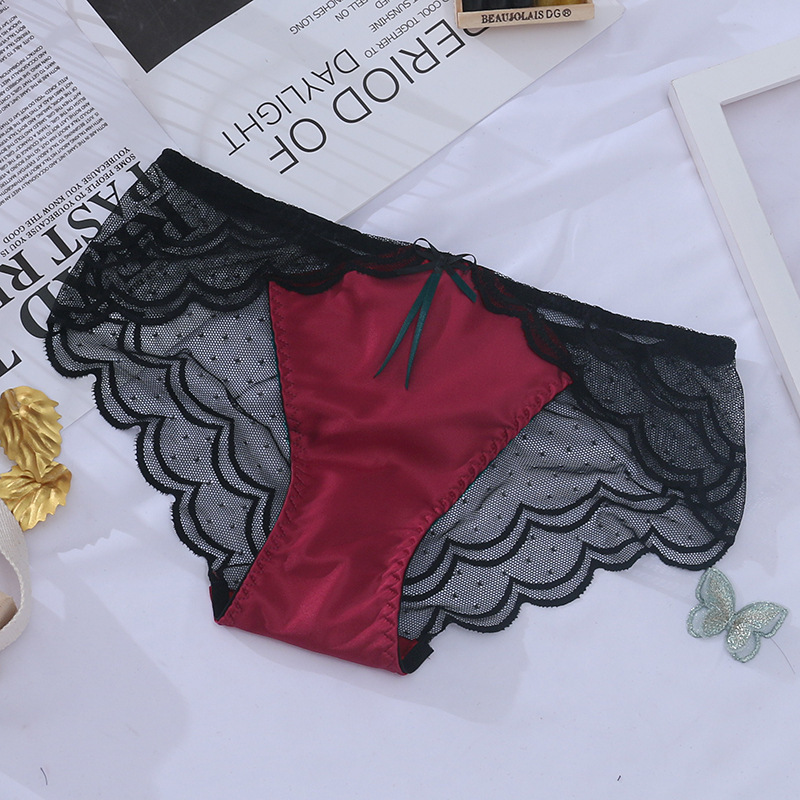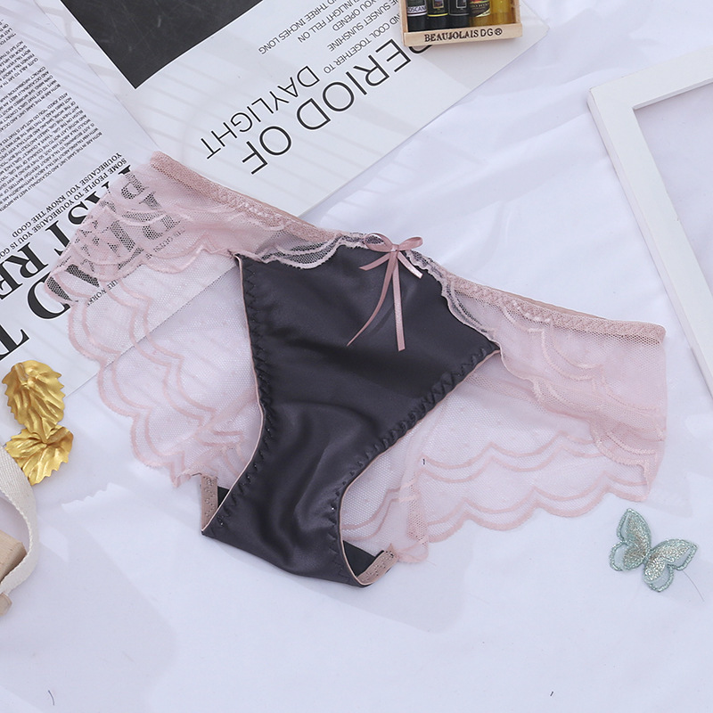 WLMZ113100349 性感內褲女法式薄款緞面拼接蕾絲內褲純棉襠部提臀低腰三角褲