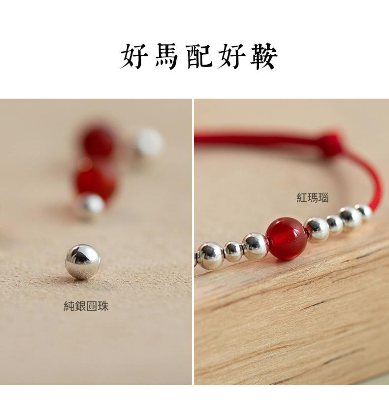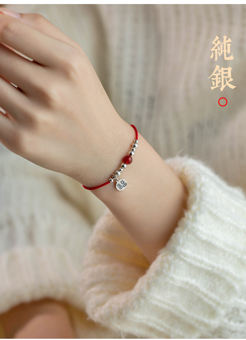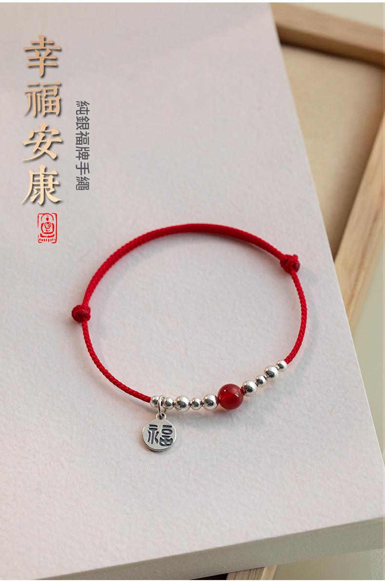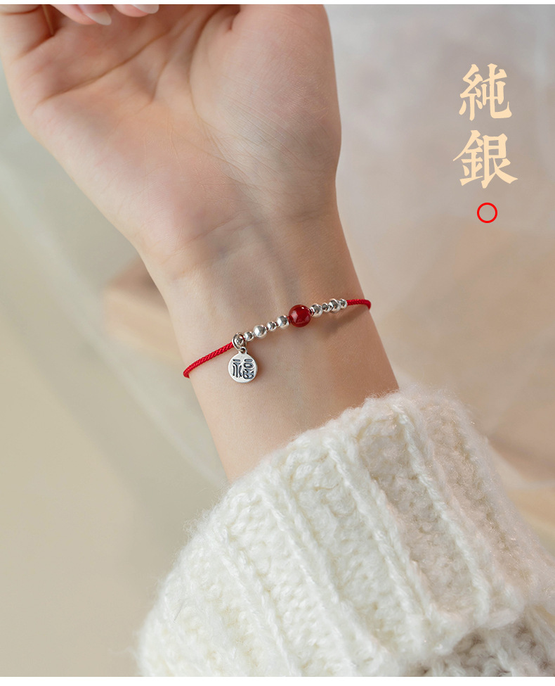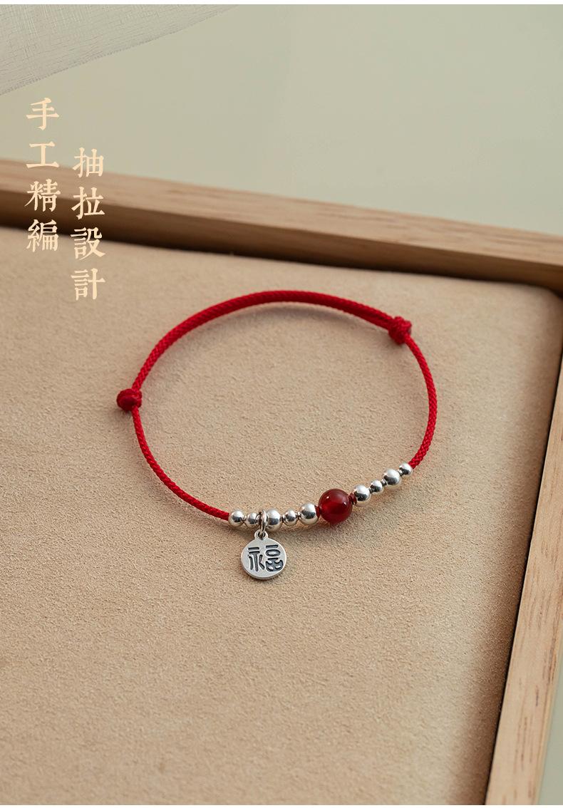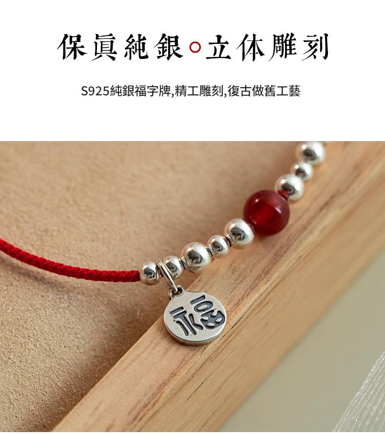 SATN122100011 S925純銀福字圓牌紅繩手鏈女銀珠紅瑪瑙氣質手環本命年中國風手飾