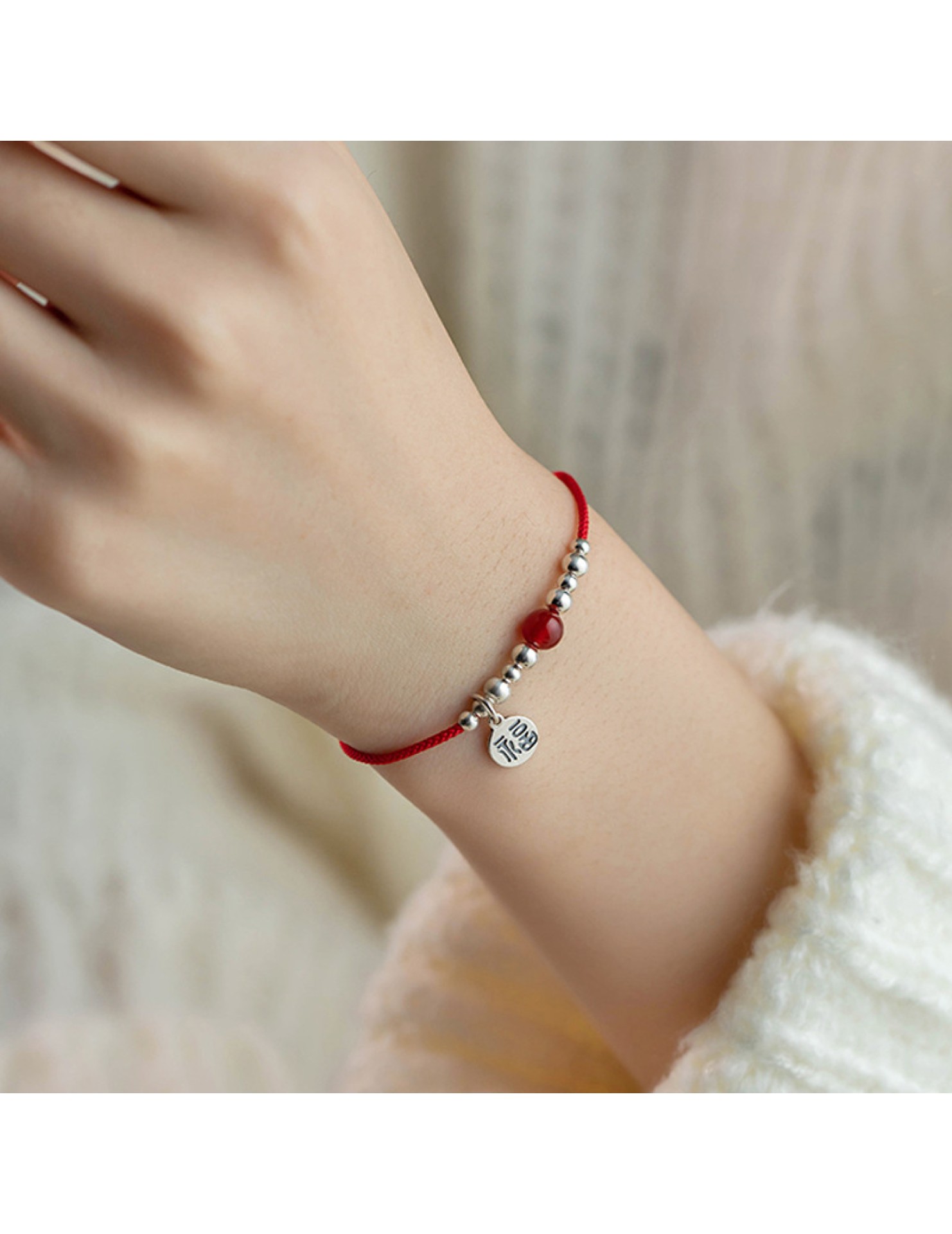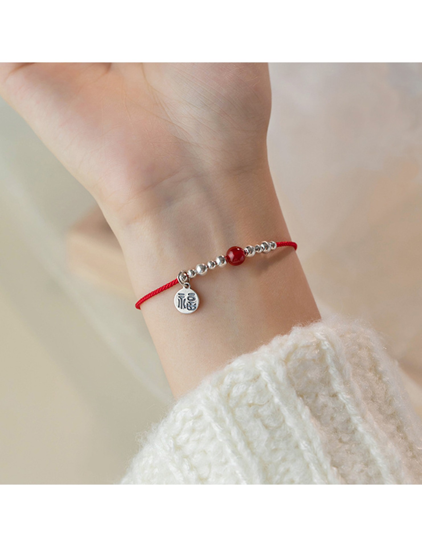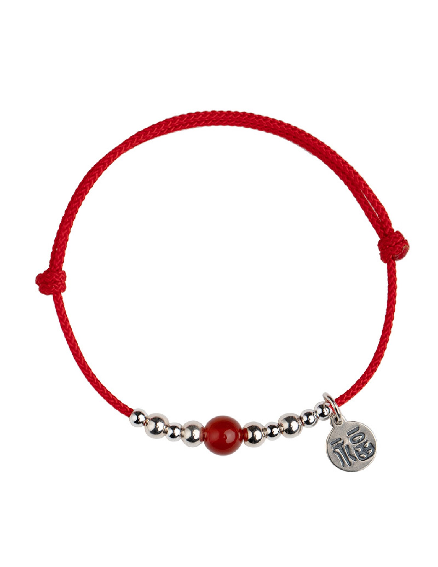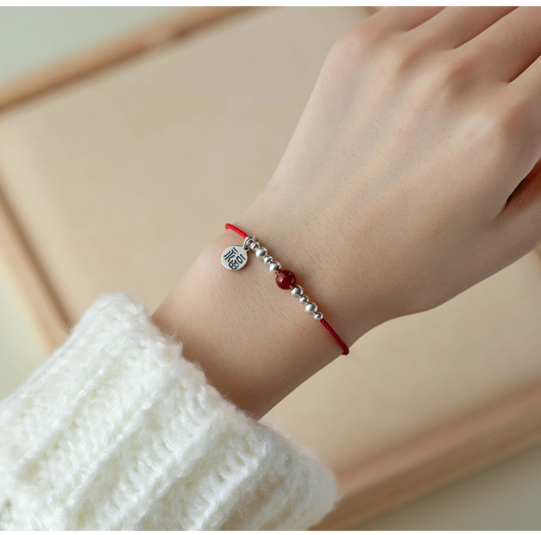 SATN122100011 S925純銀福字圓牌紅繩手鏈女銀珠紅瑪瑙氣質手環本命年中國風手飾