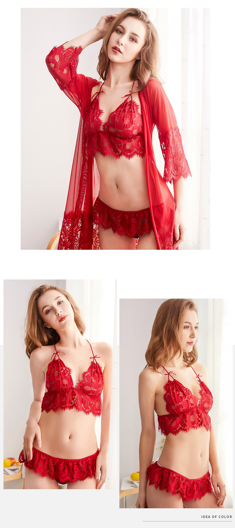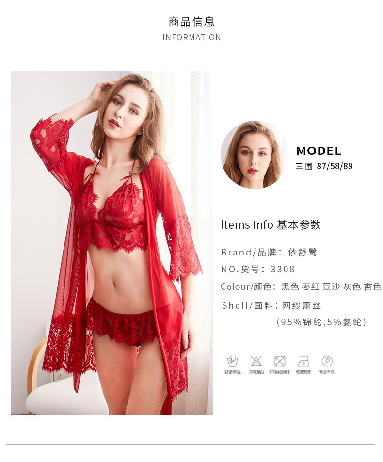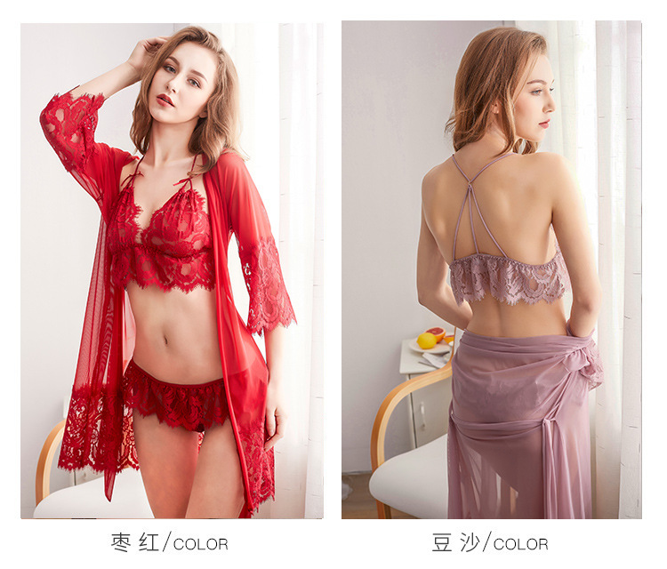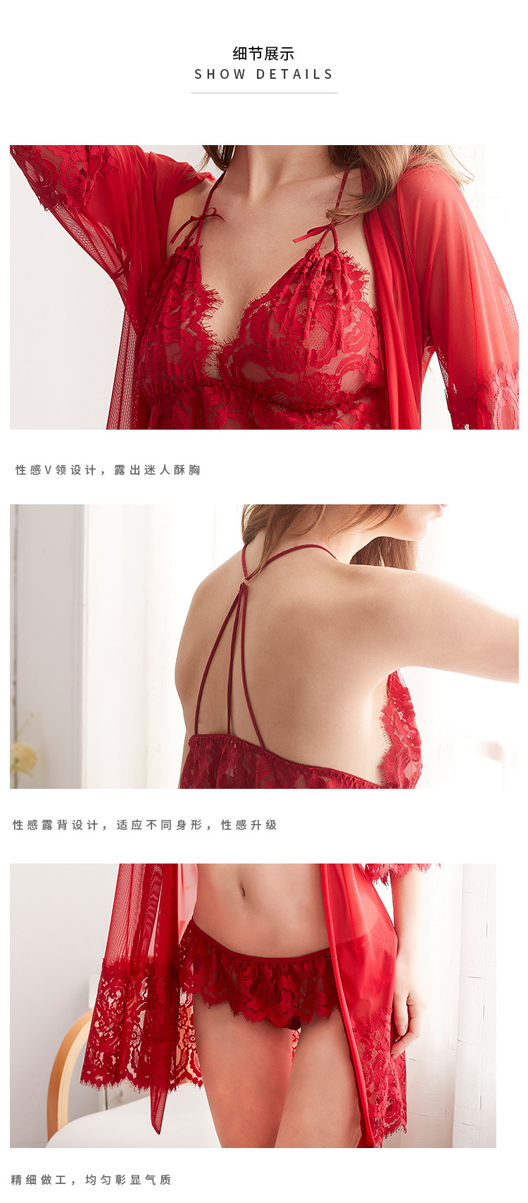 三點式情趣內衣套裝女性感蕾絲睡袍歐美曼妙透明網紗吊帶睡衣