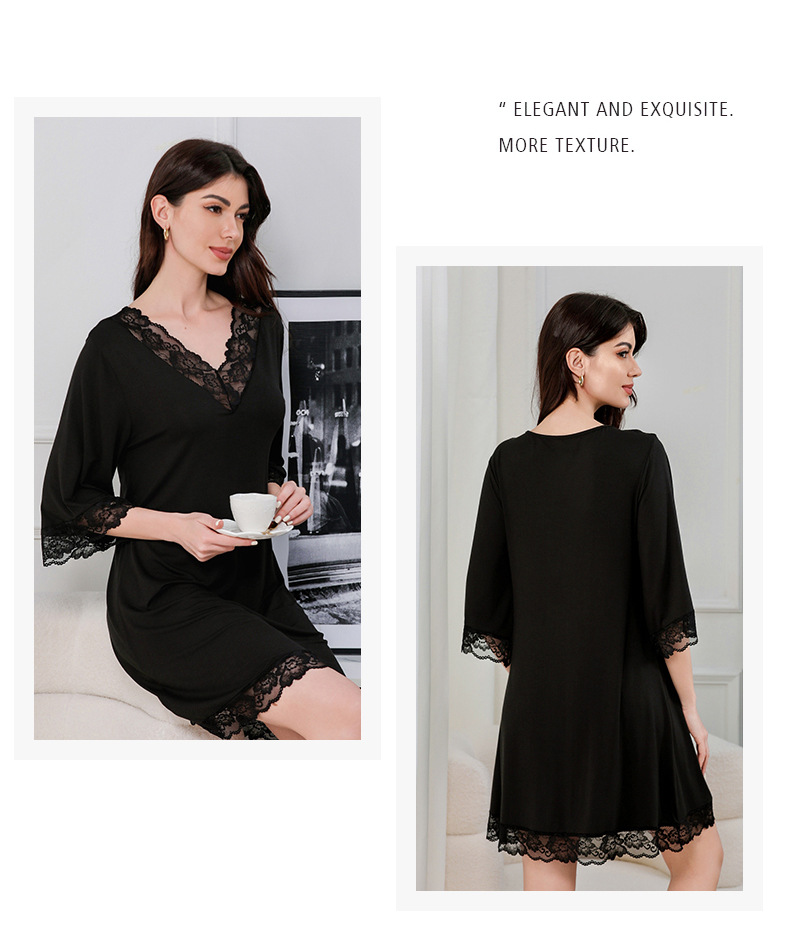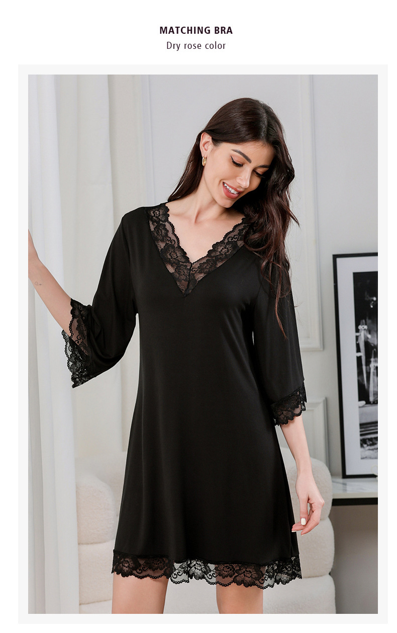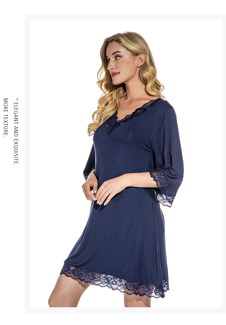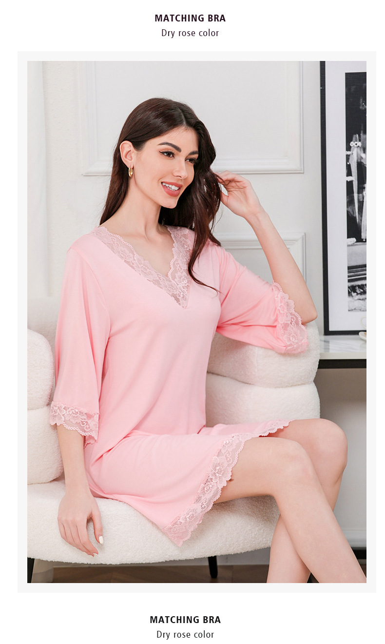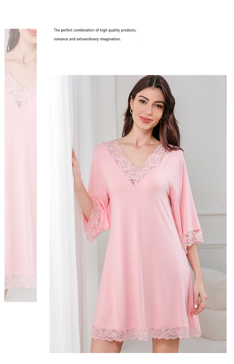 蕾絲性感V領純莫代爾棉居家服睡衣女大碼寬松七分袖睡裙 LCBN