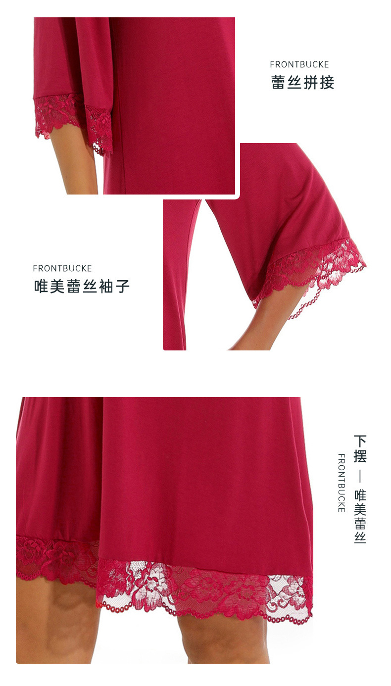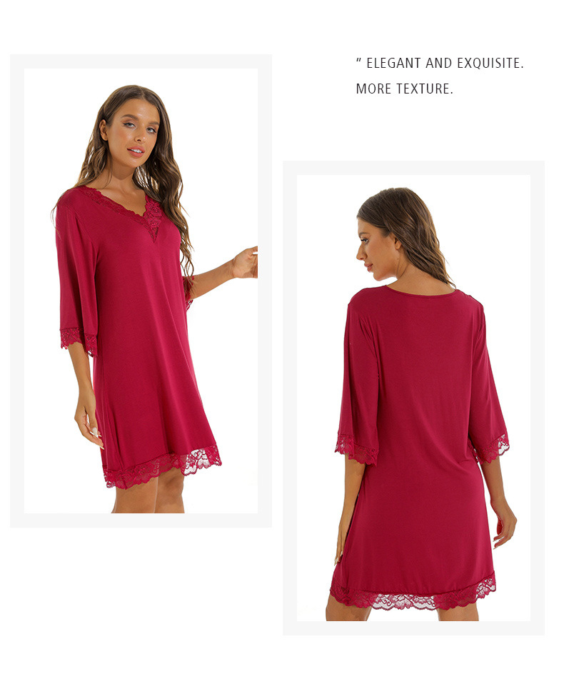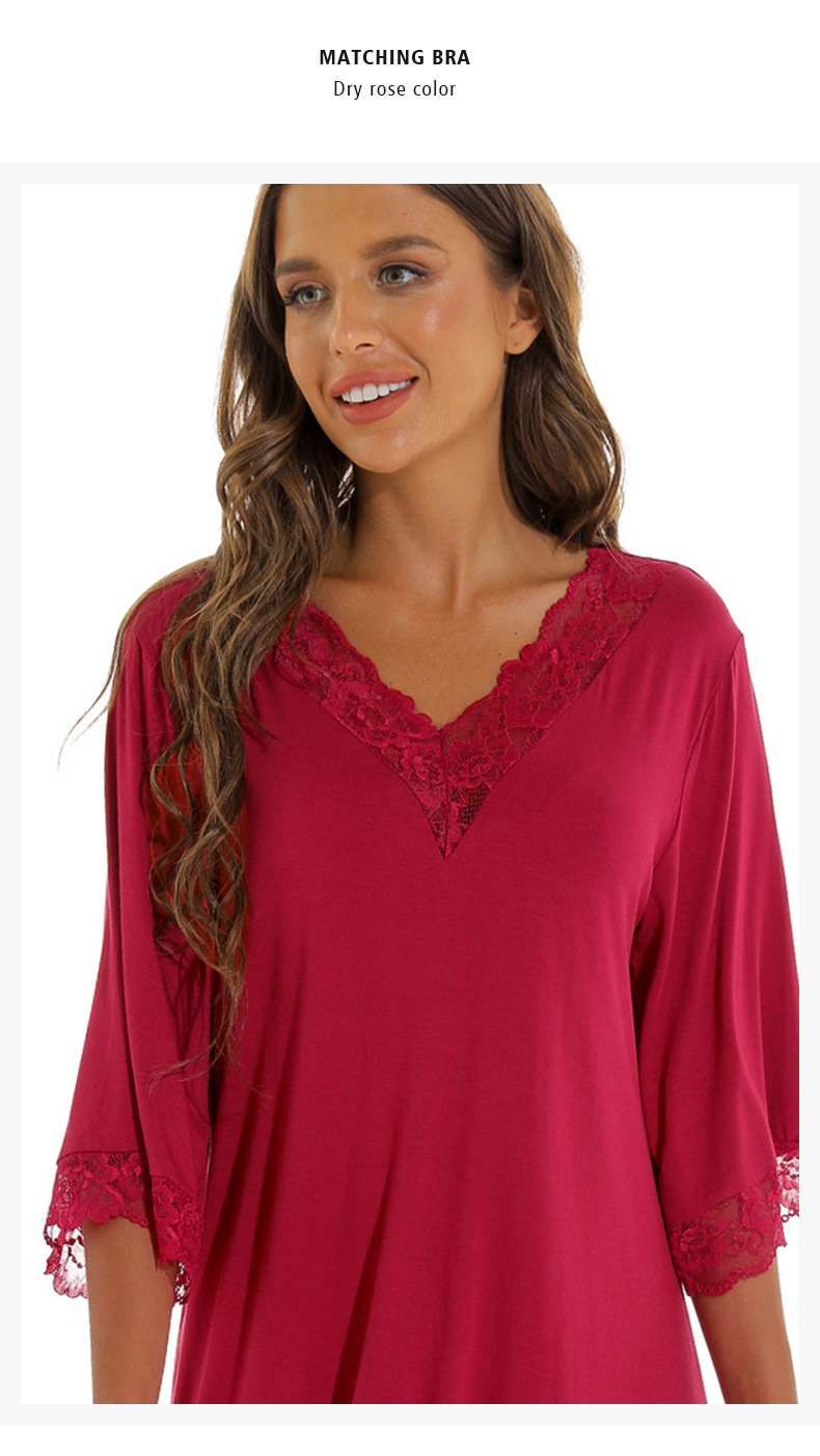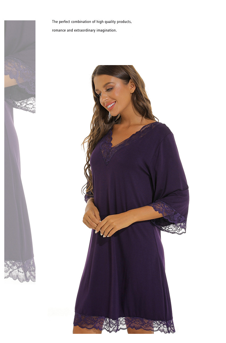 蕾絲性感V領純莫代爾棉居家服睡衣女大碼寬松七分袖睡裙 LCBN