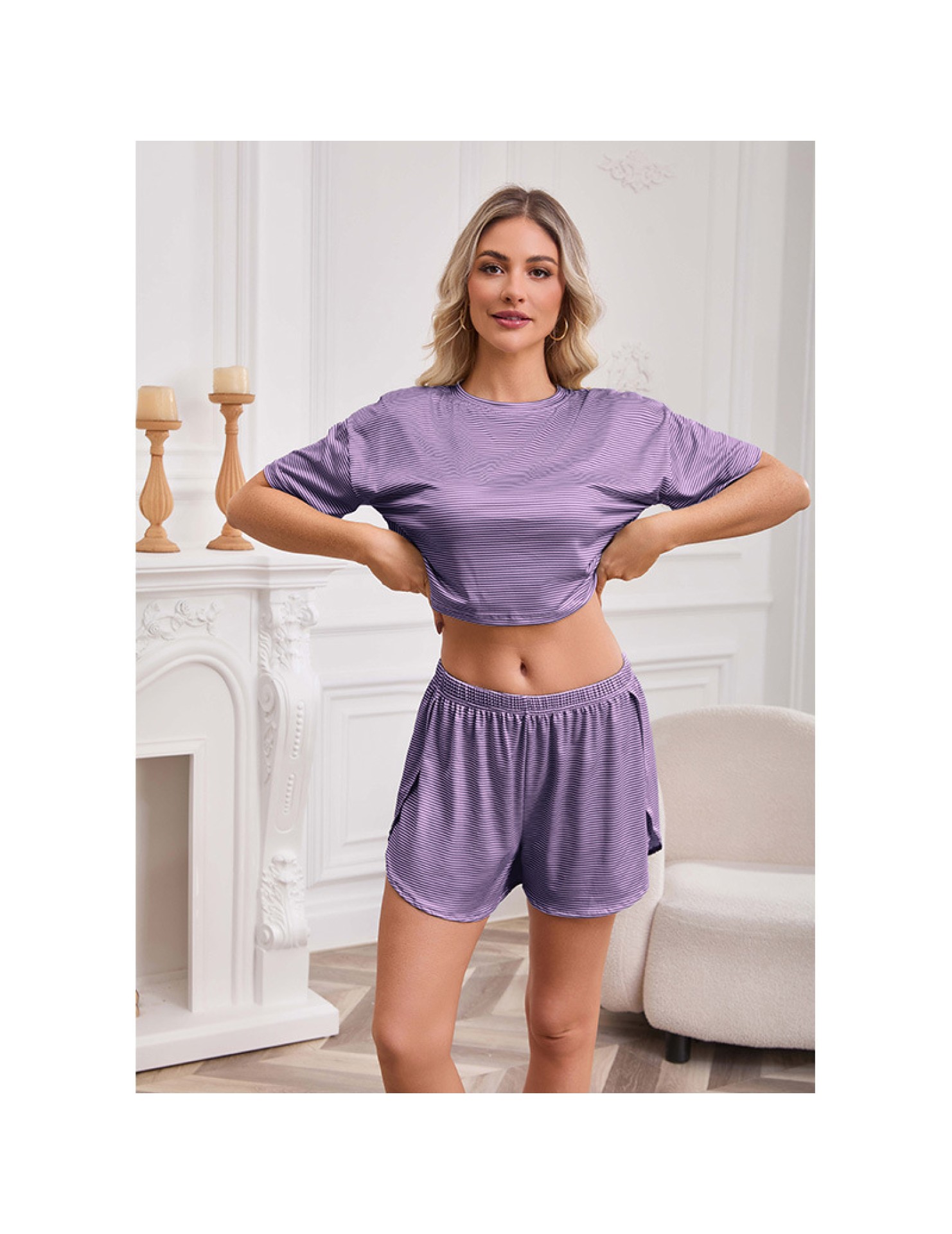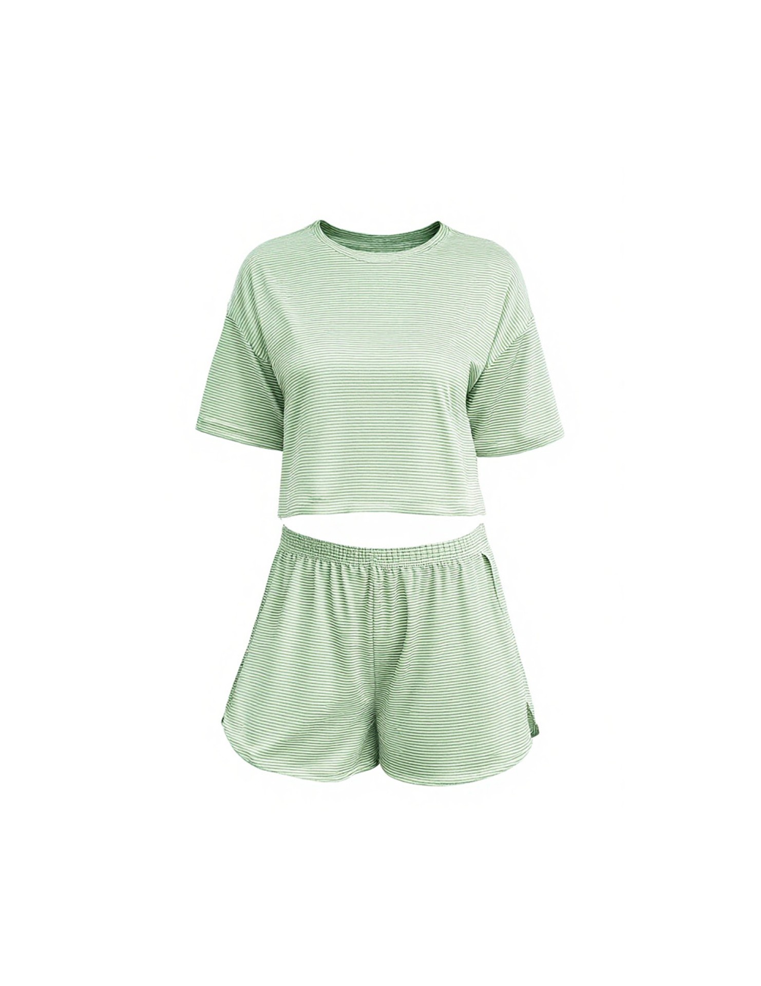 2025 歐美春季新款針織圓領長袖短褲睡衣兩件套條紋透氣女士家居服 LCBN
