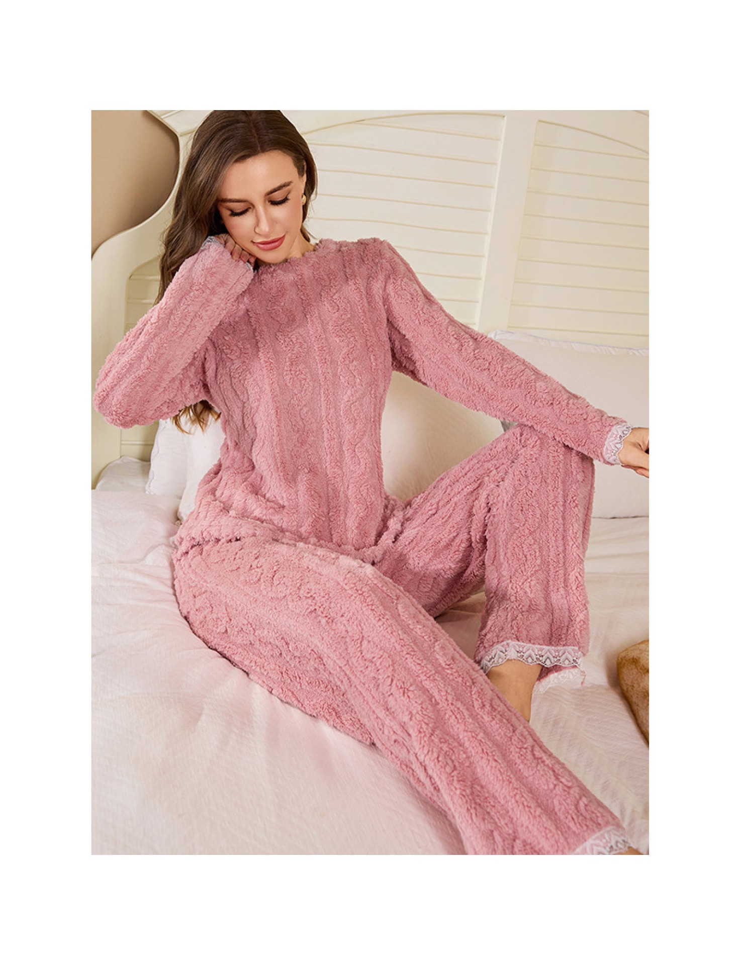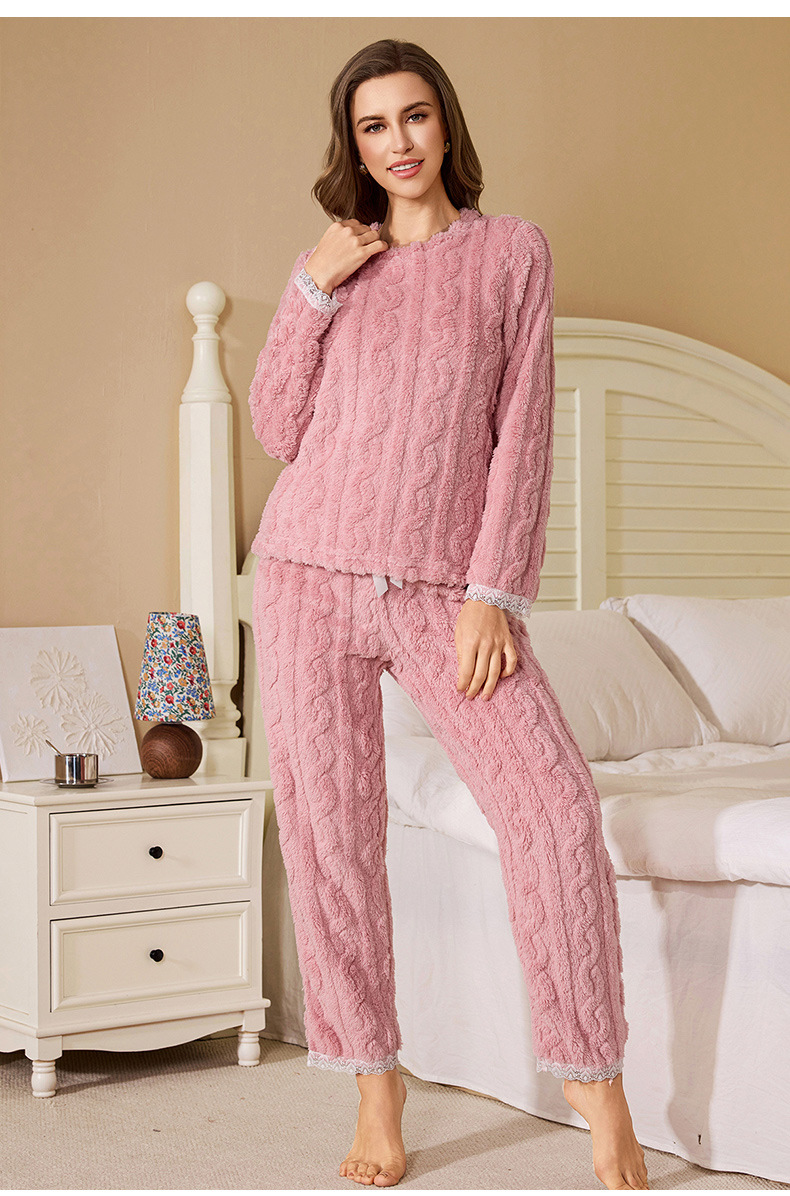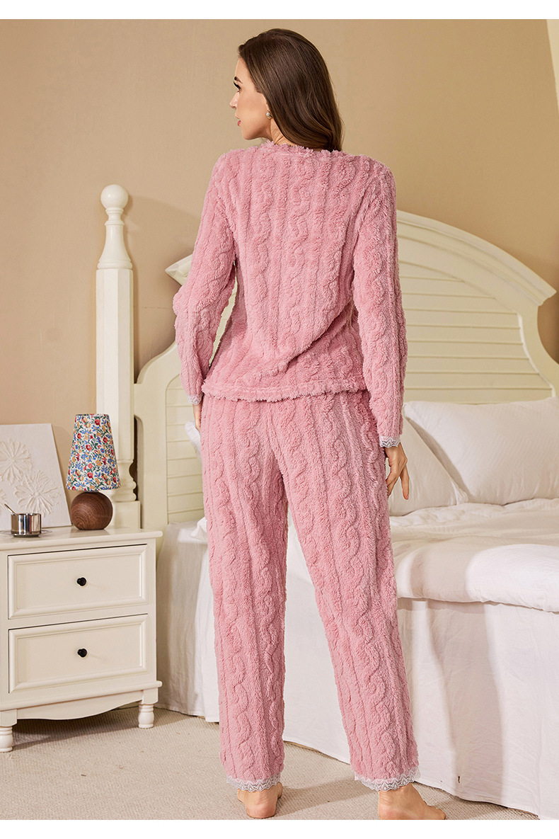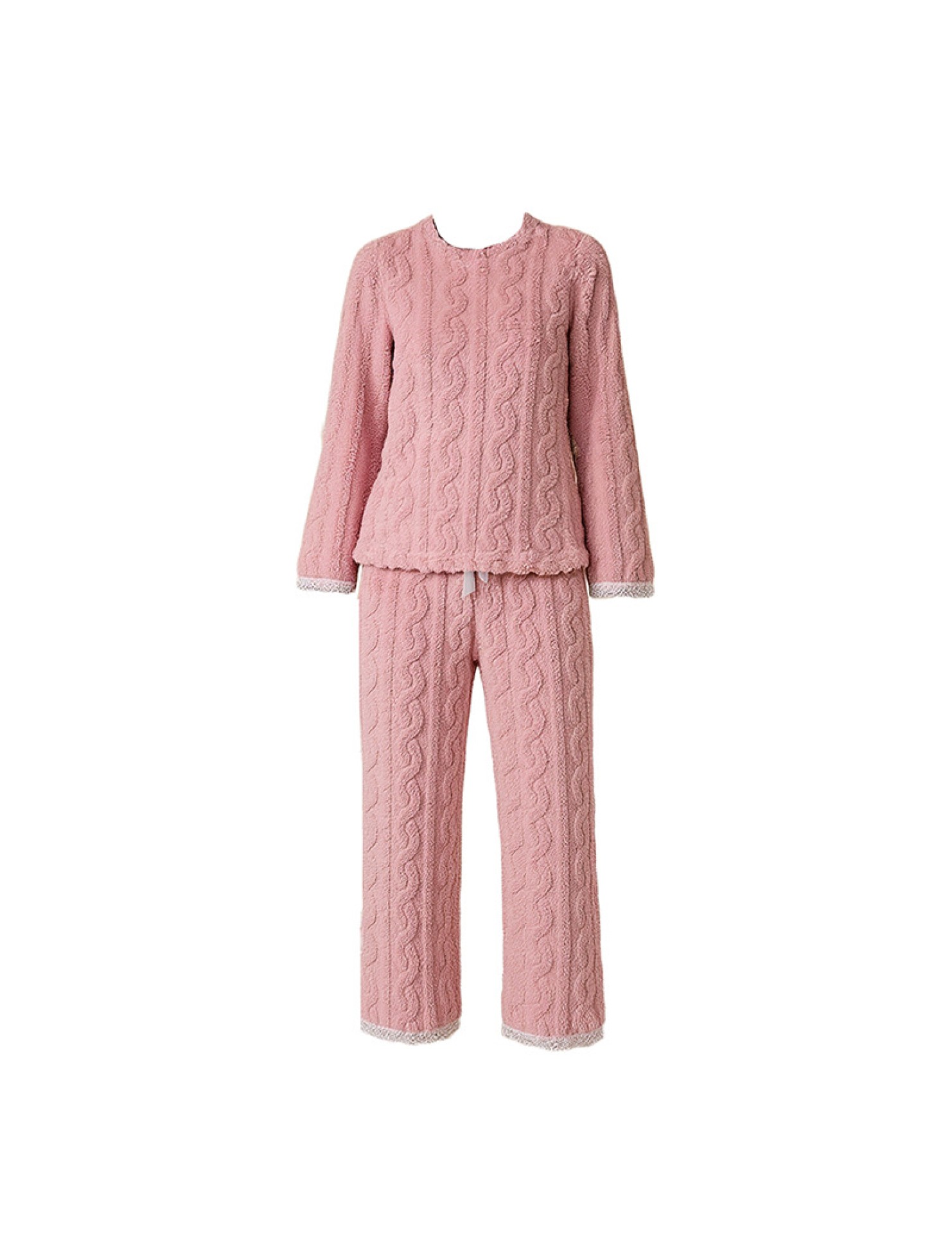 珊瑚絨提花睡衣套裝女冬季純色加厚寬松休閑保暖粉色家居服兩件套 LCBN