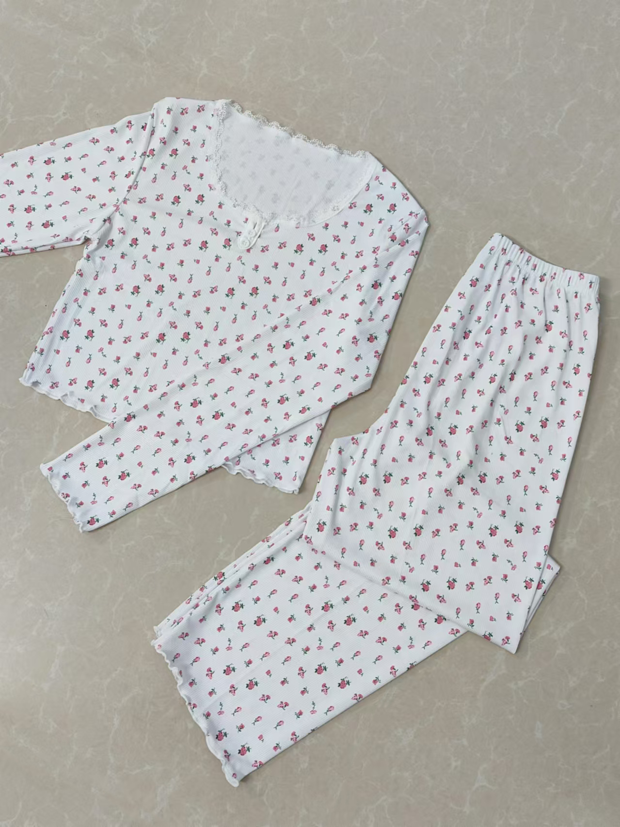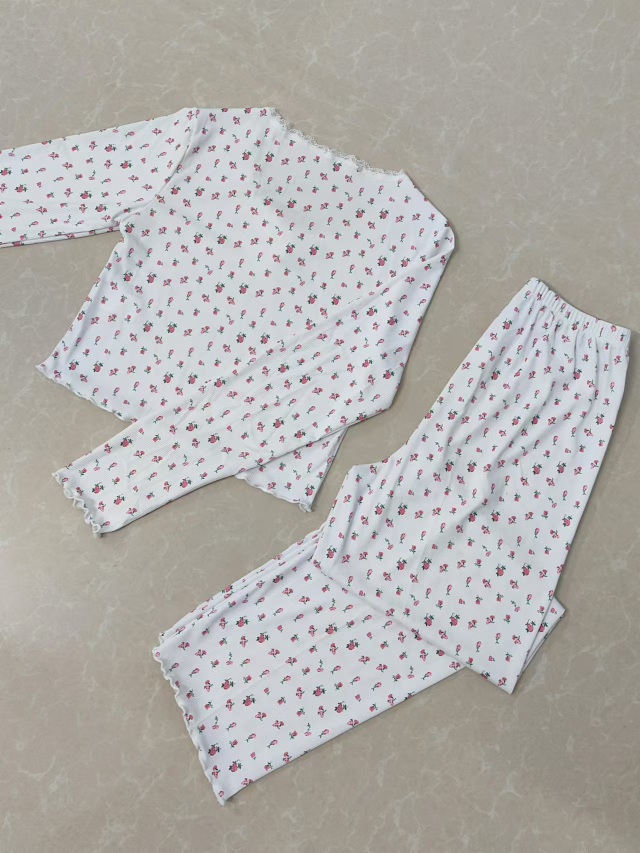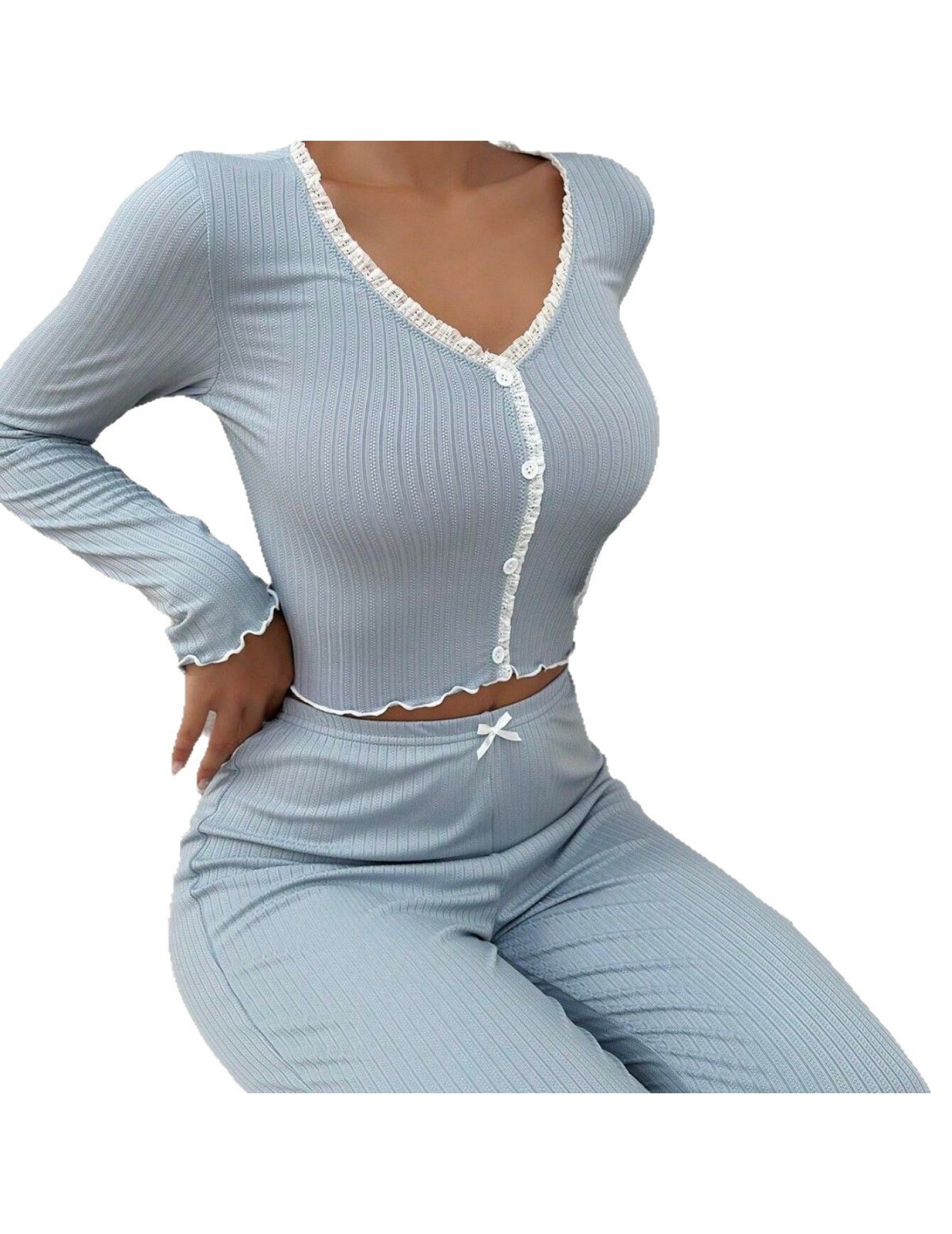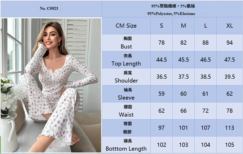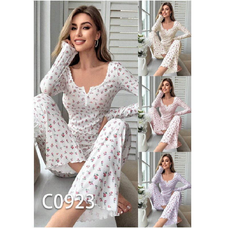 新款歐美家居服睡衣長袖長褲修身性感花邊雙長套裝Pajamas LCBN