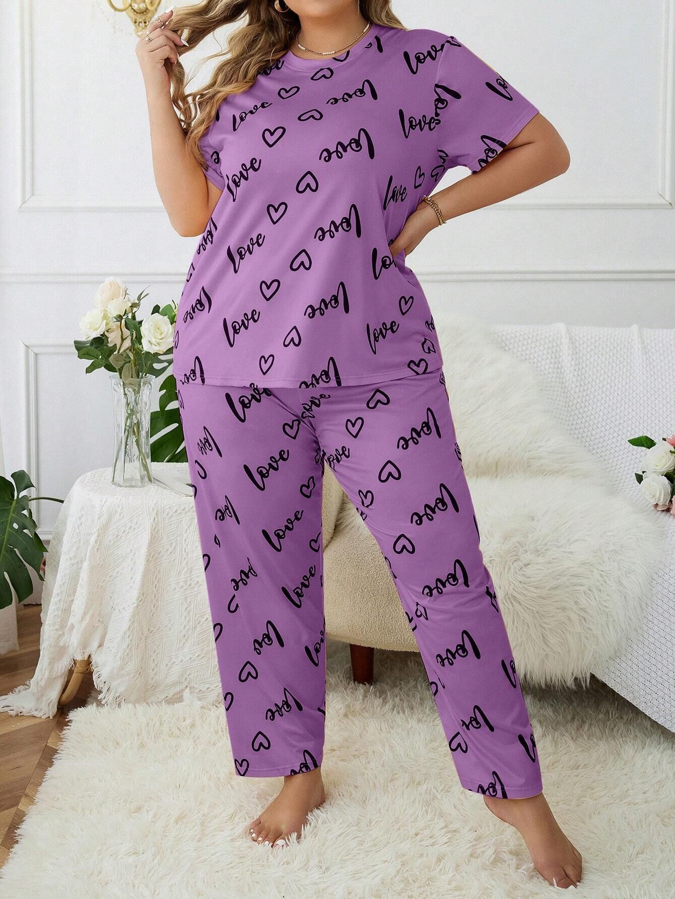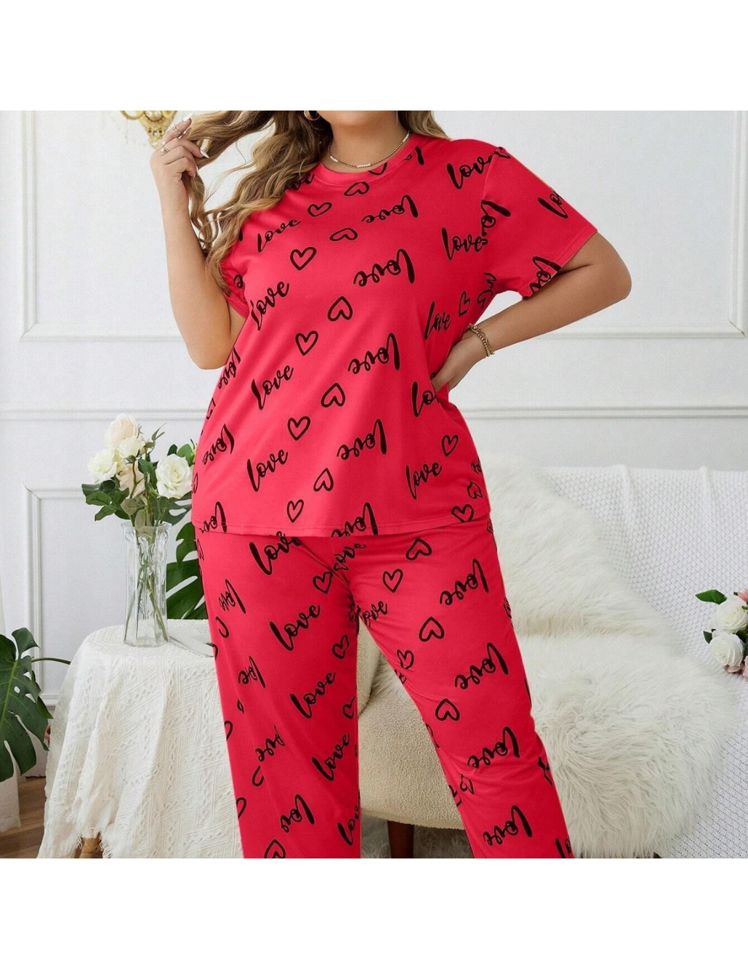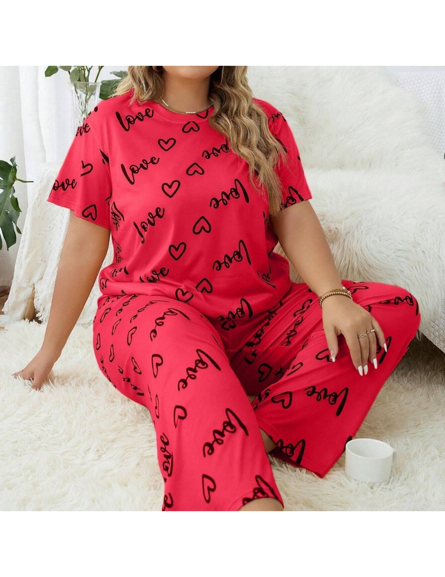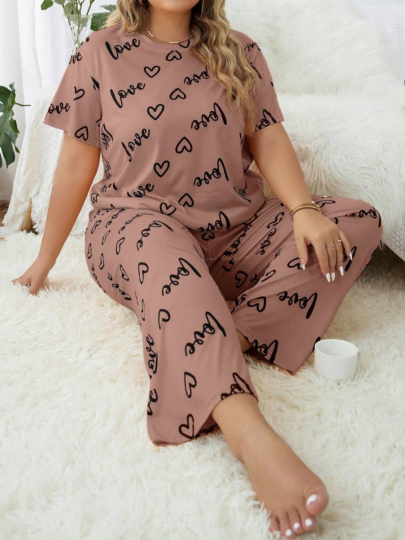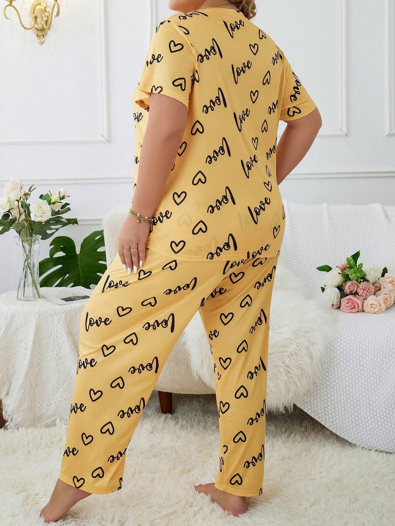 歐美風大碼家居服加大加肥愛心圓領短袖長褲女式睡衣套裝 LCBN