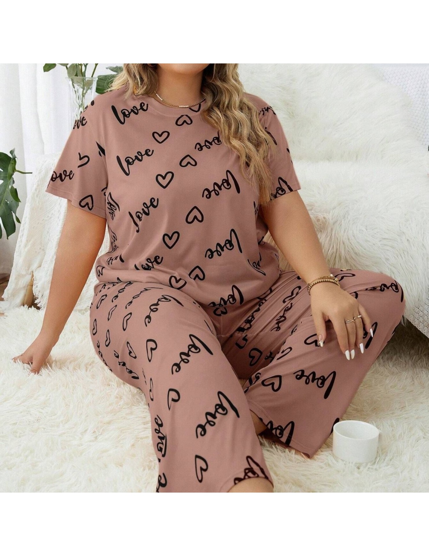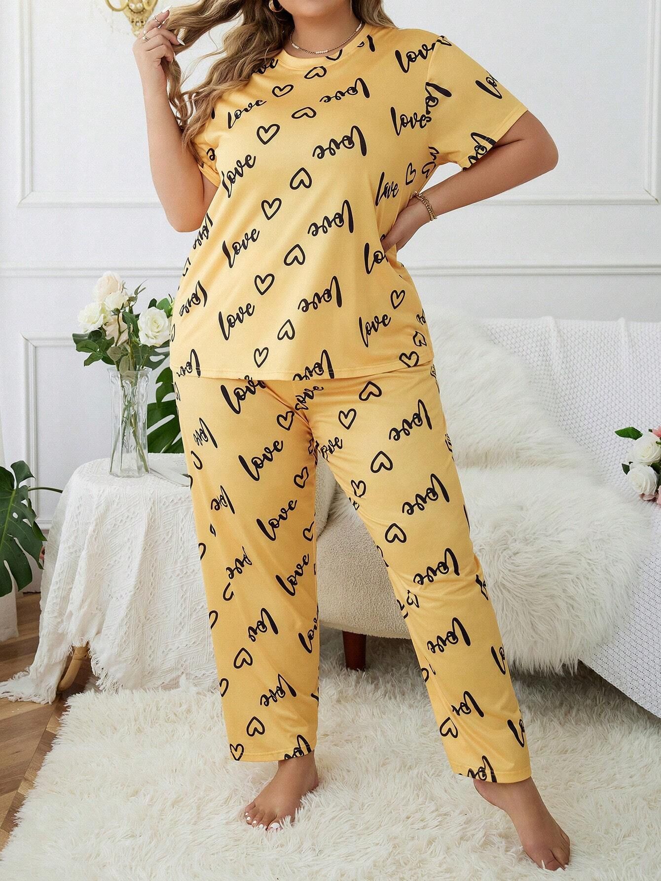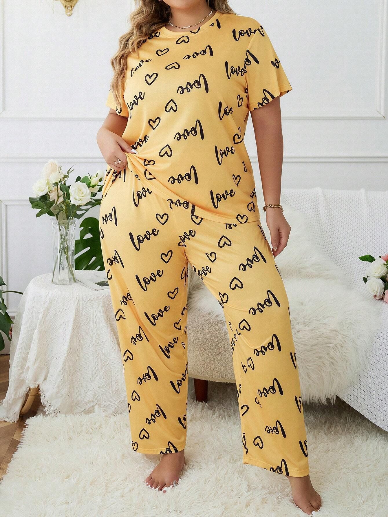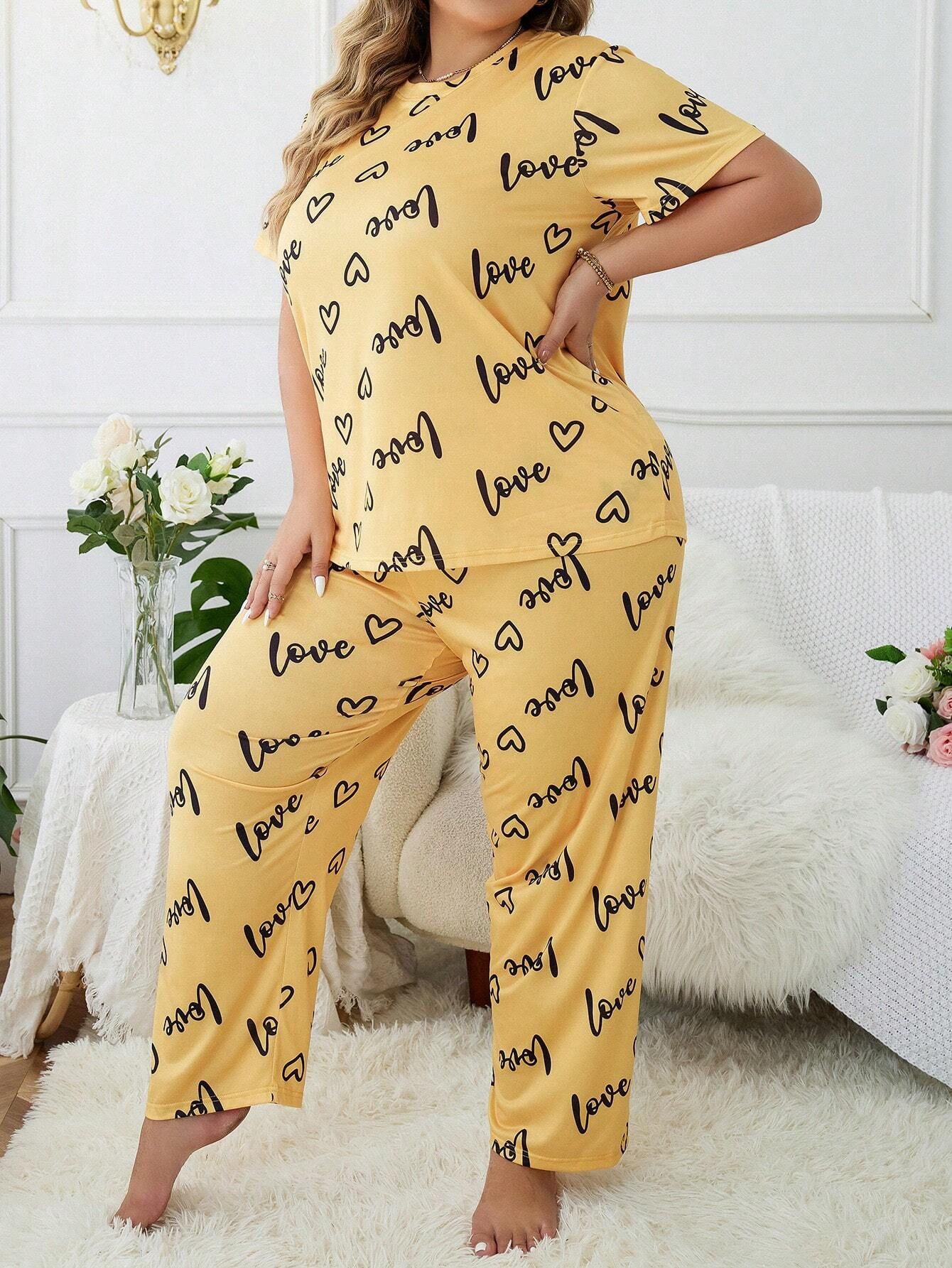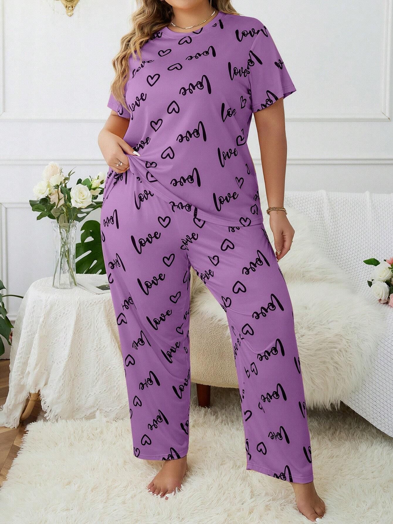 歐美風大碼家居服加大加肥愛心圓領短袖長褲女式睡衣套裝 LCBN