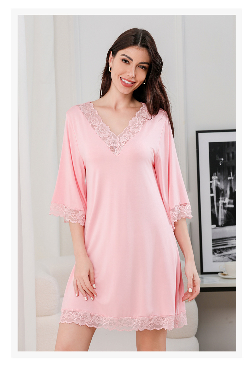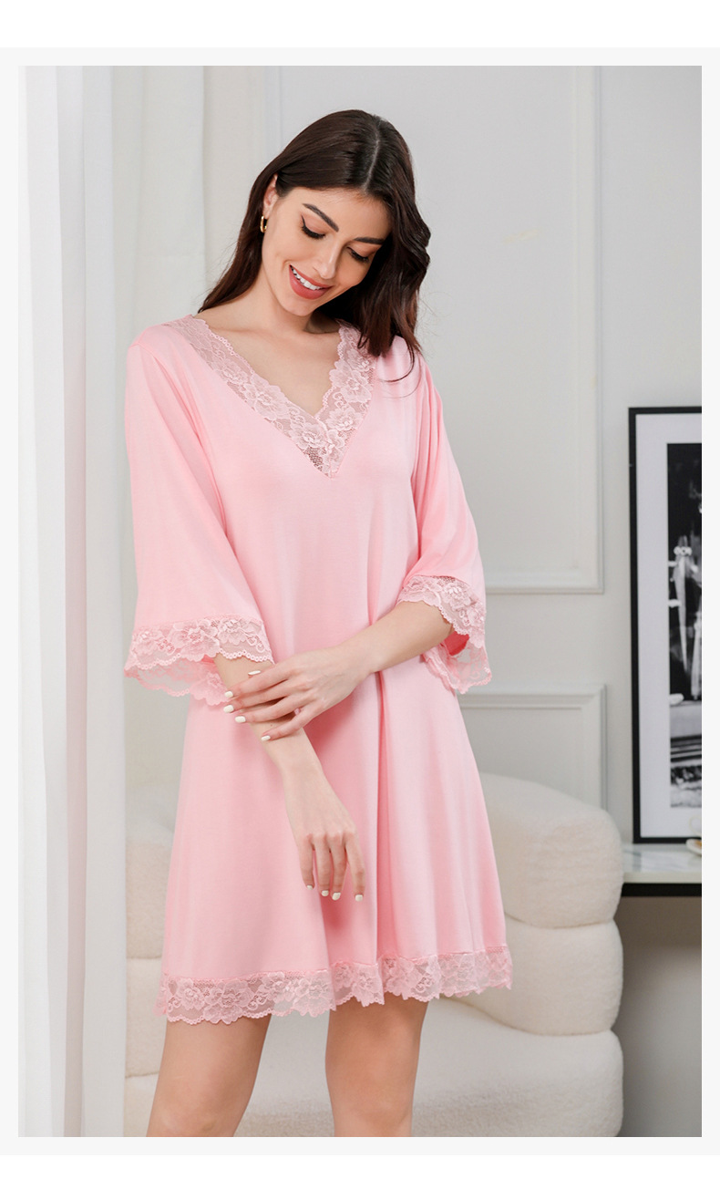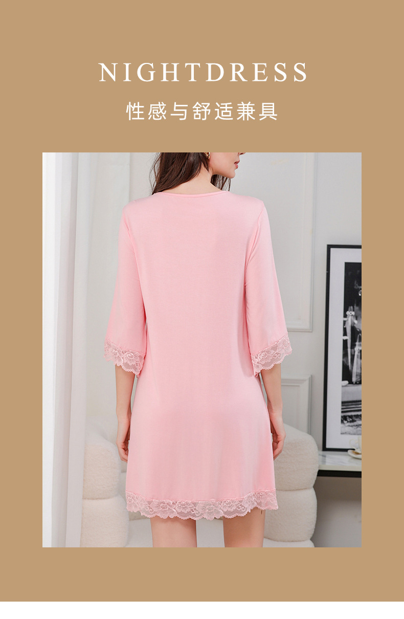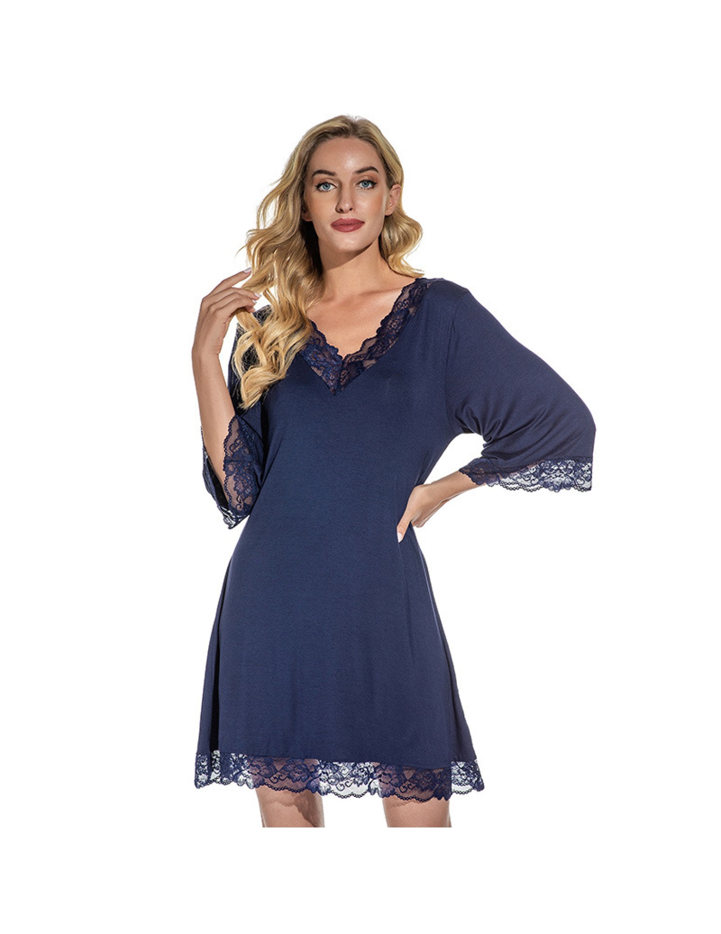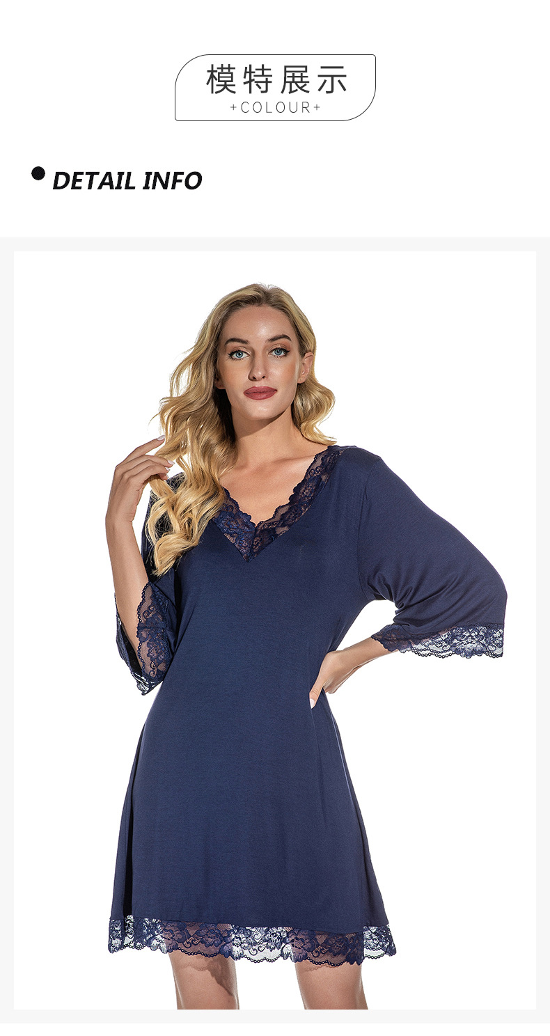 蕾絲性感V領純棉居家服睡衣女款大碼寬松七分袖睡裙 LCBN