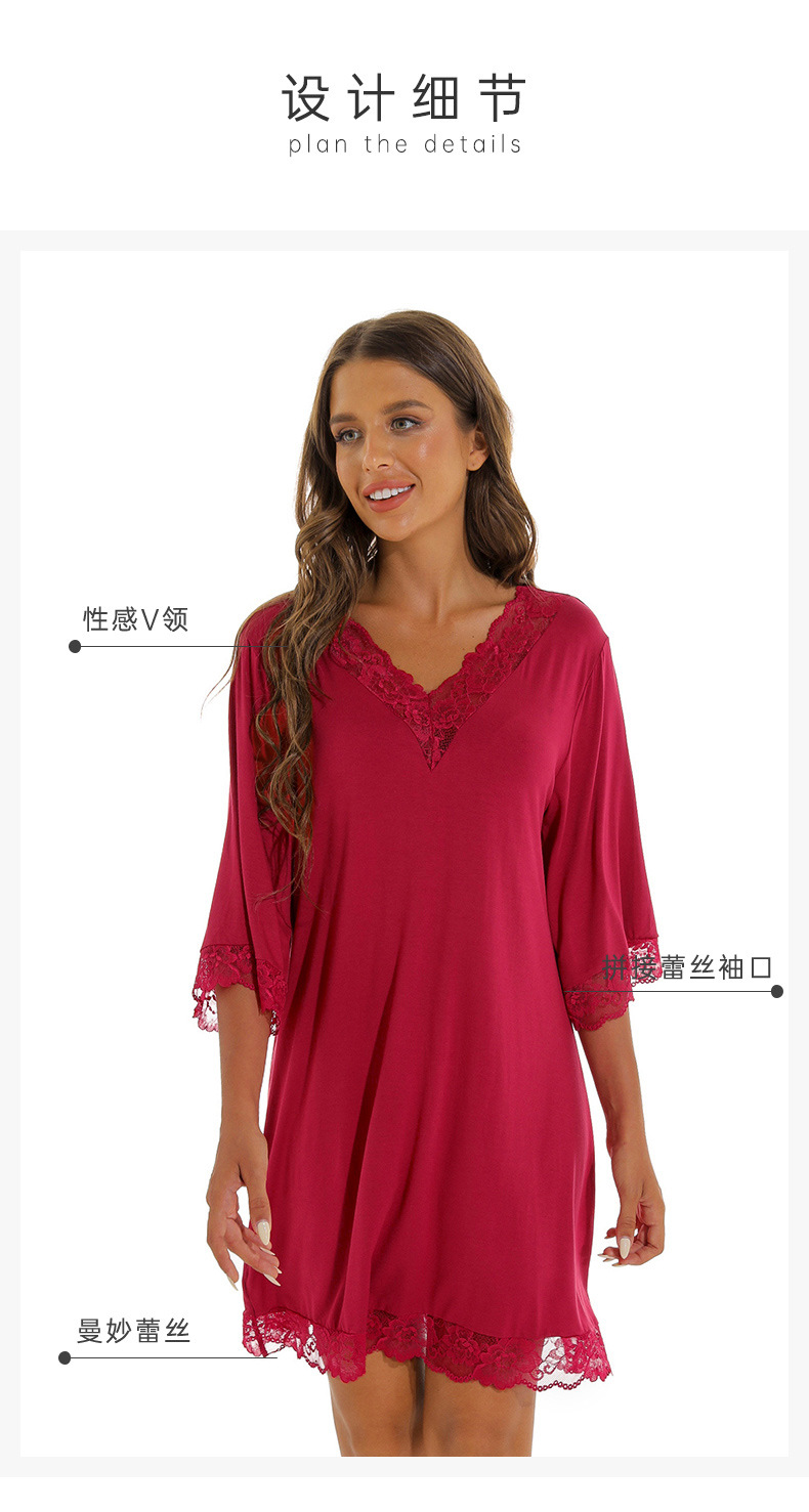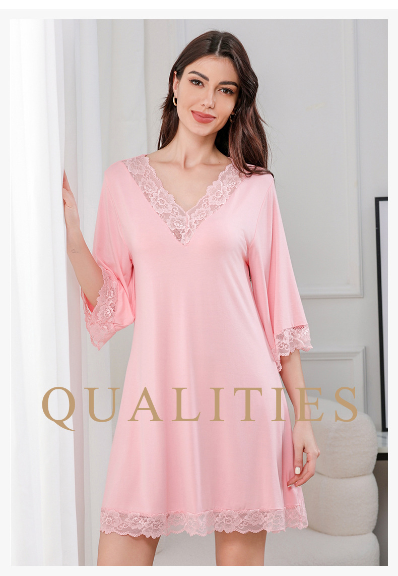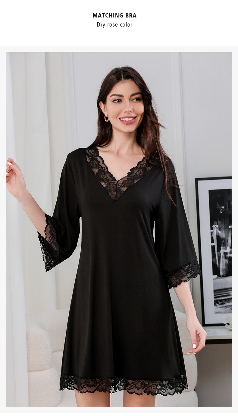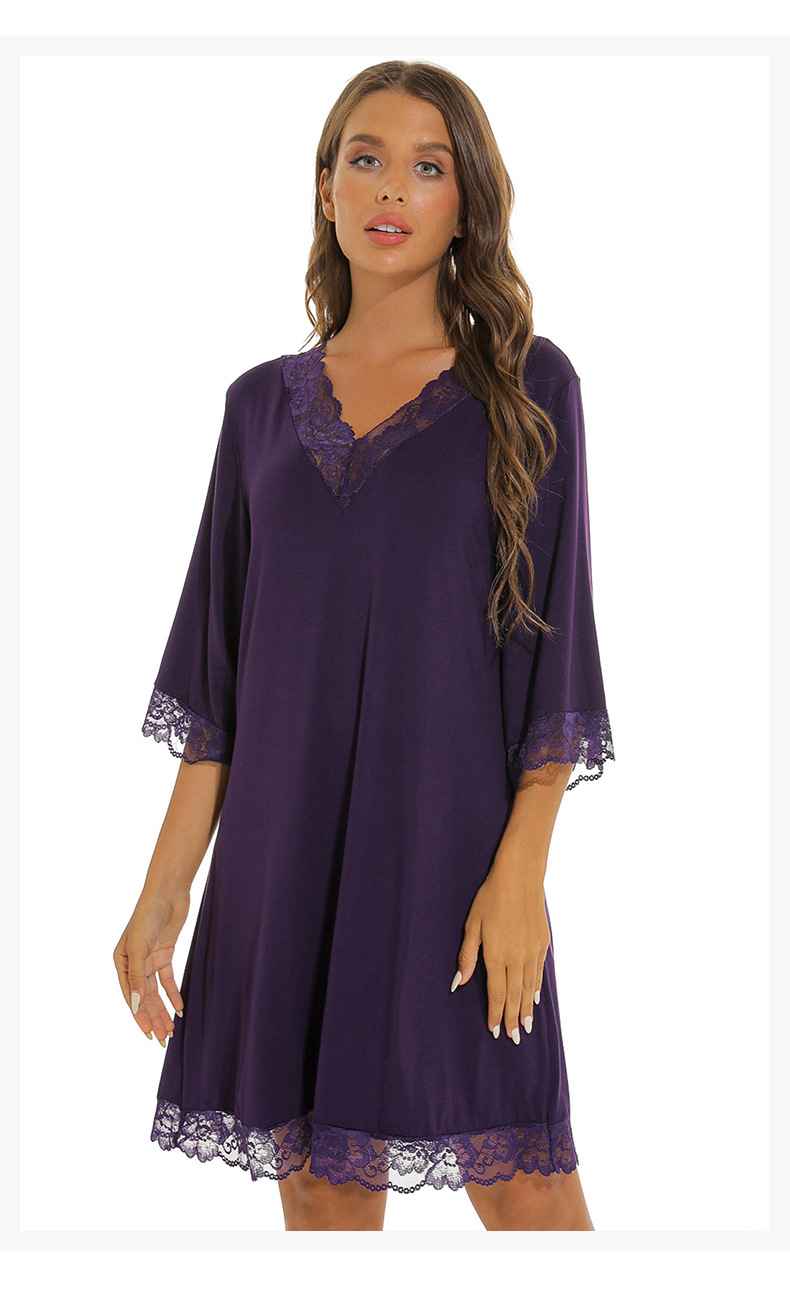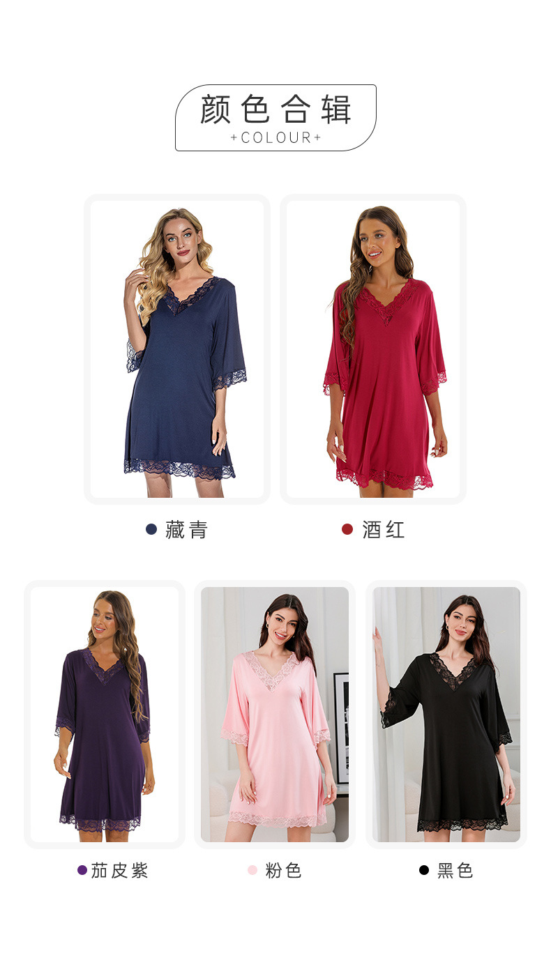 蕾絲性感V領純棉居家服睡衣女款大碼寬松七分袖睡裙 LCBN