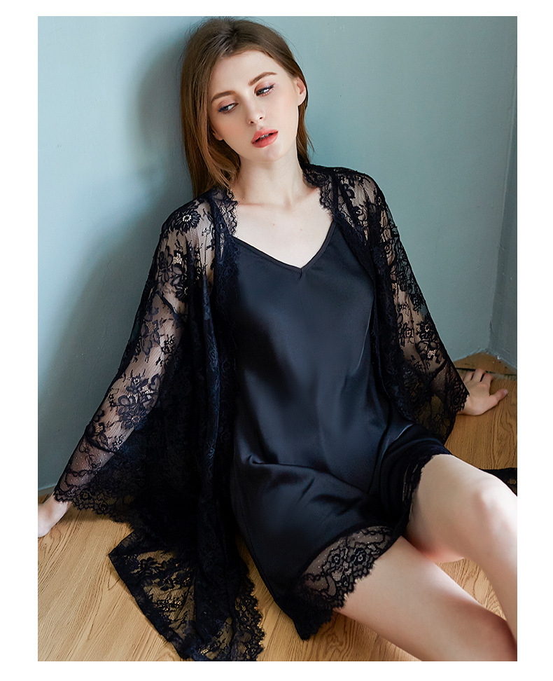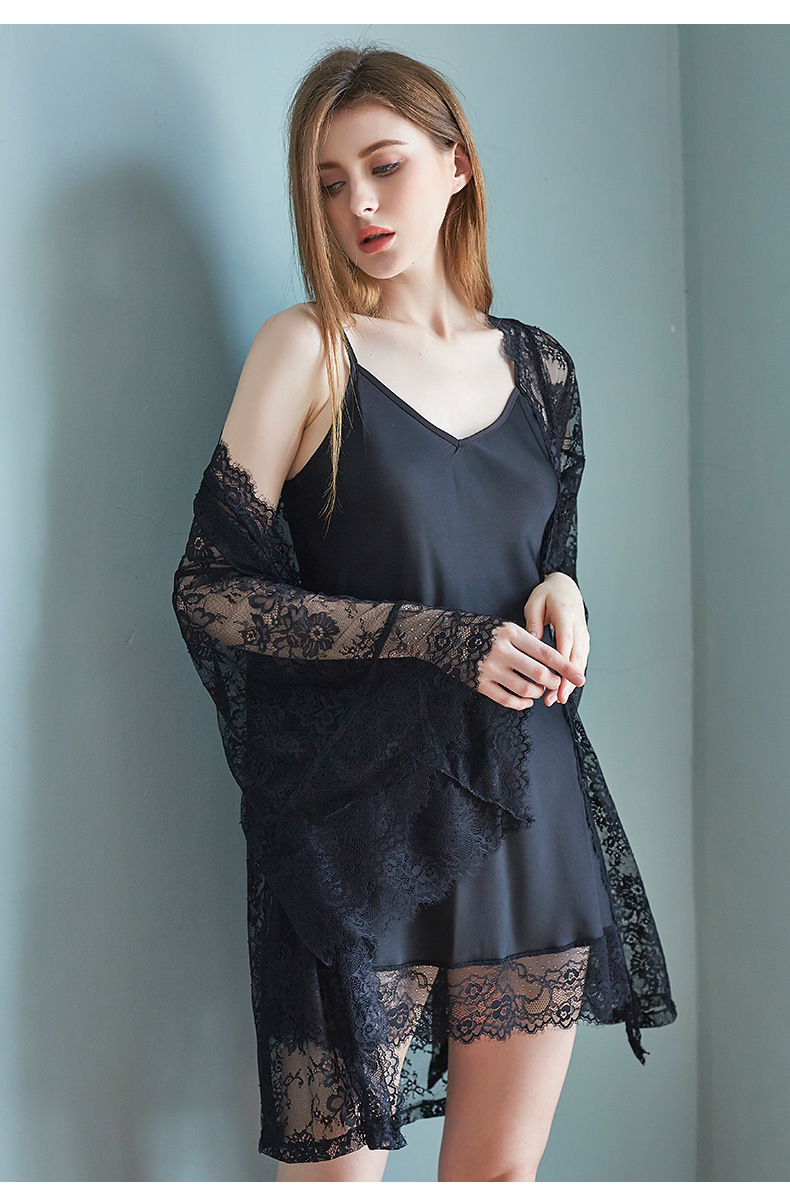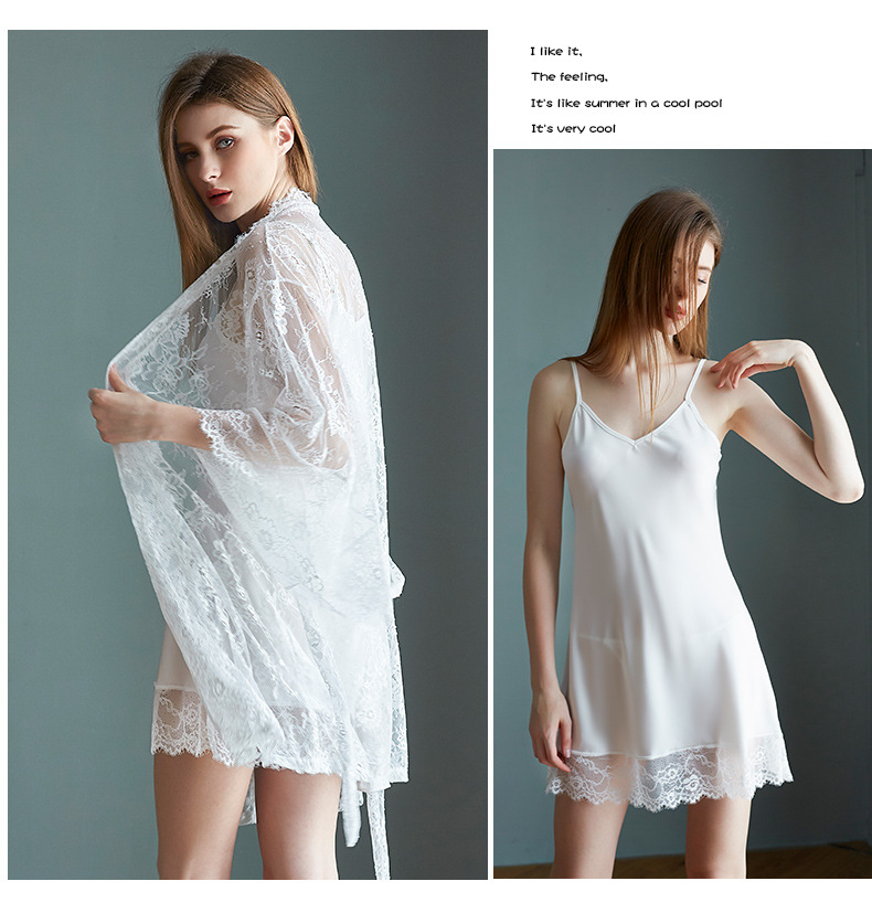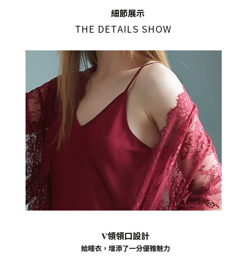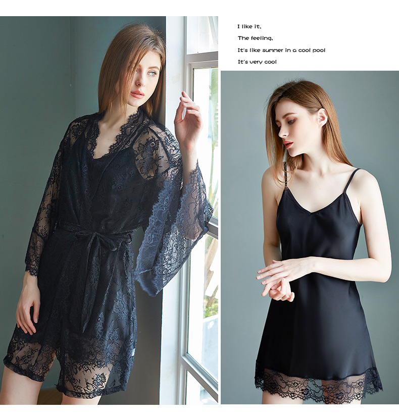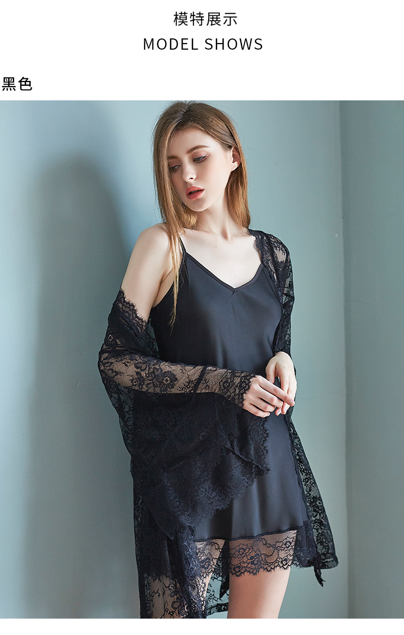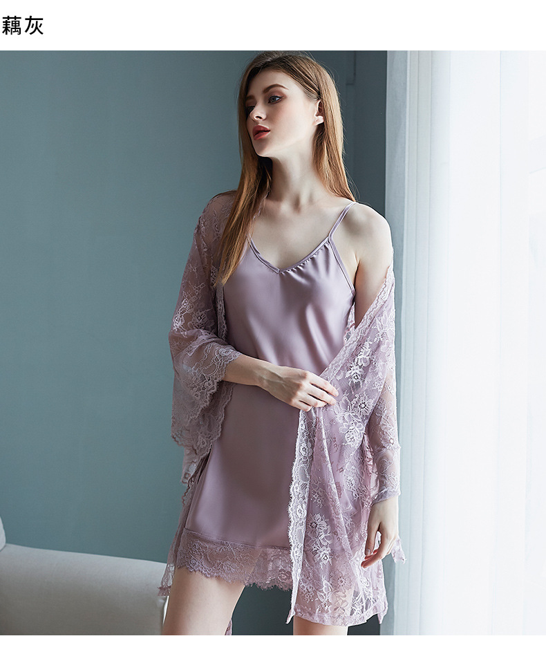 新款冰絲吊帶睡裙蕾絲性感睡袍兩件套絲質睡衣女士性感家居服 LCBN