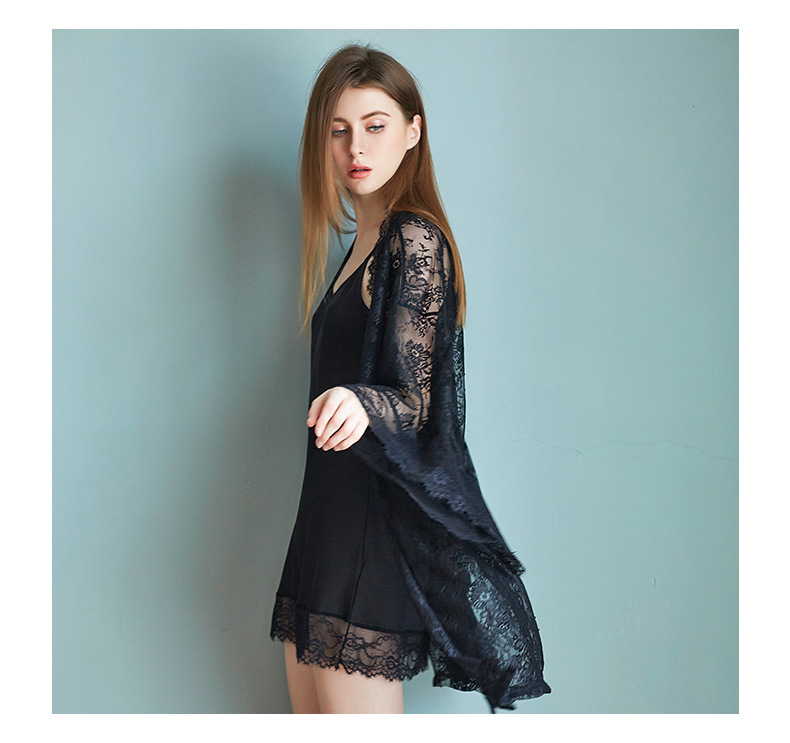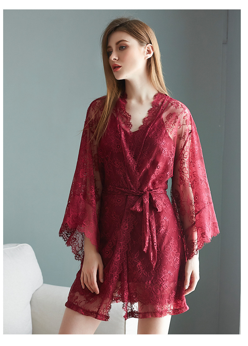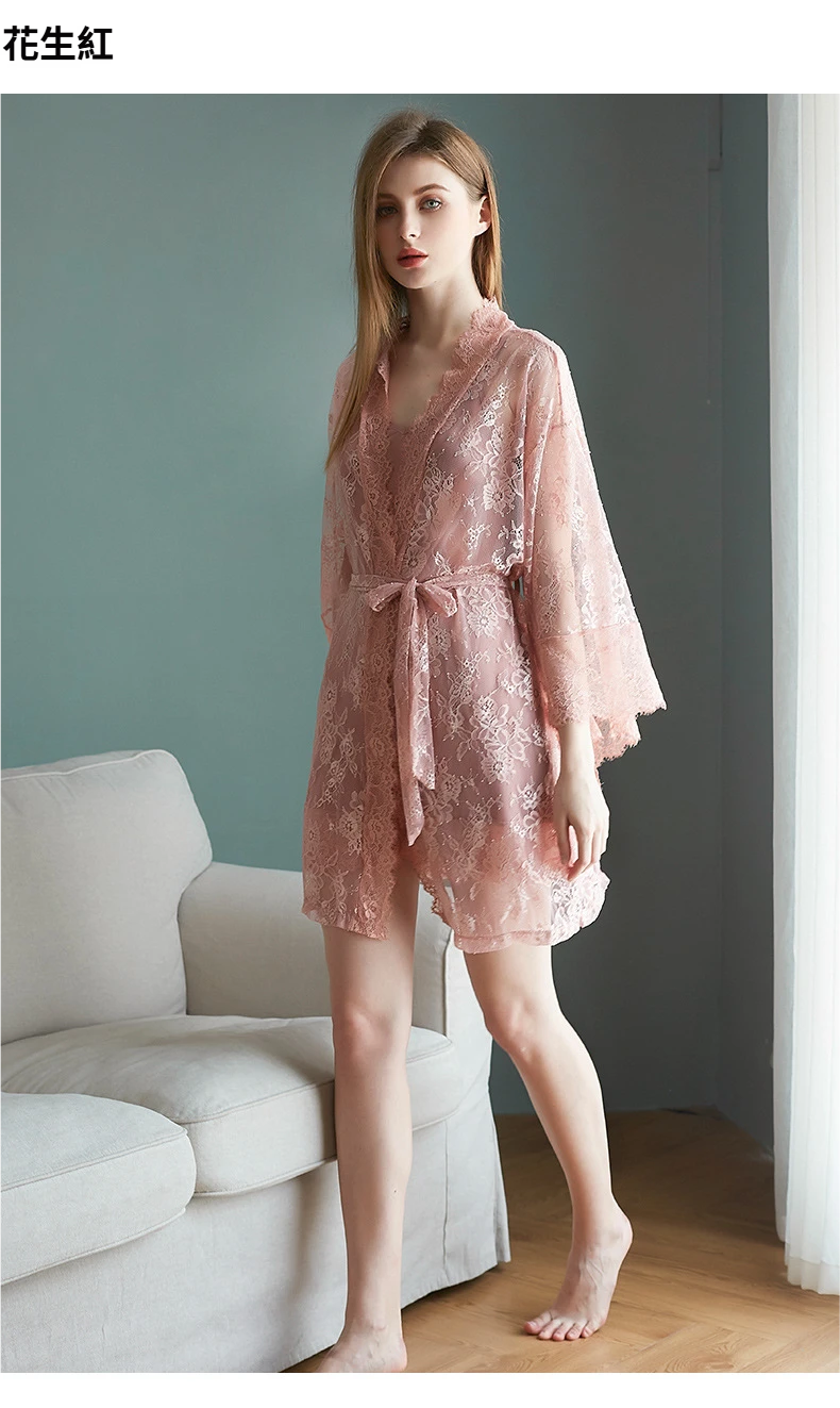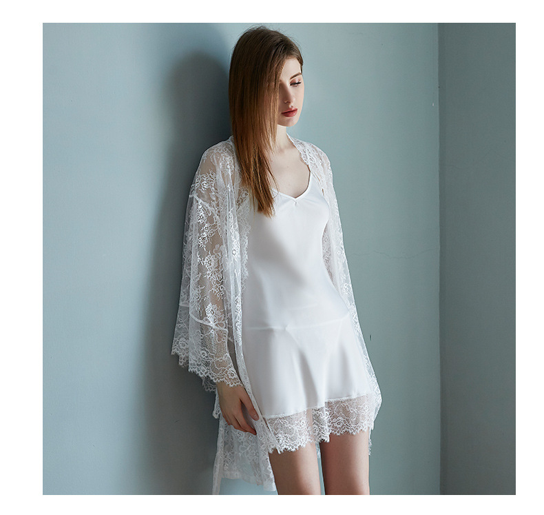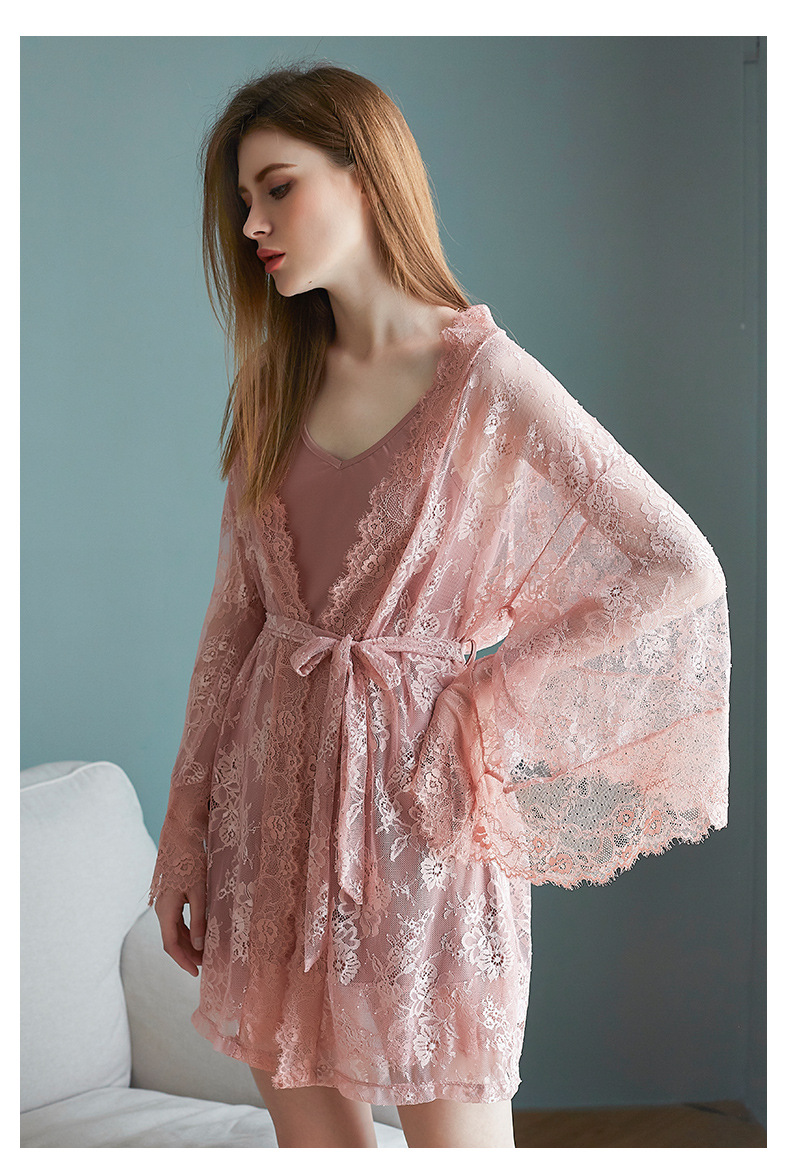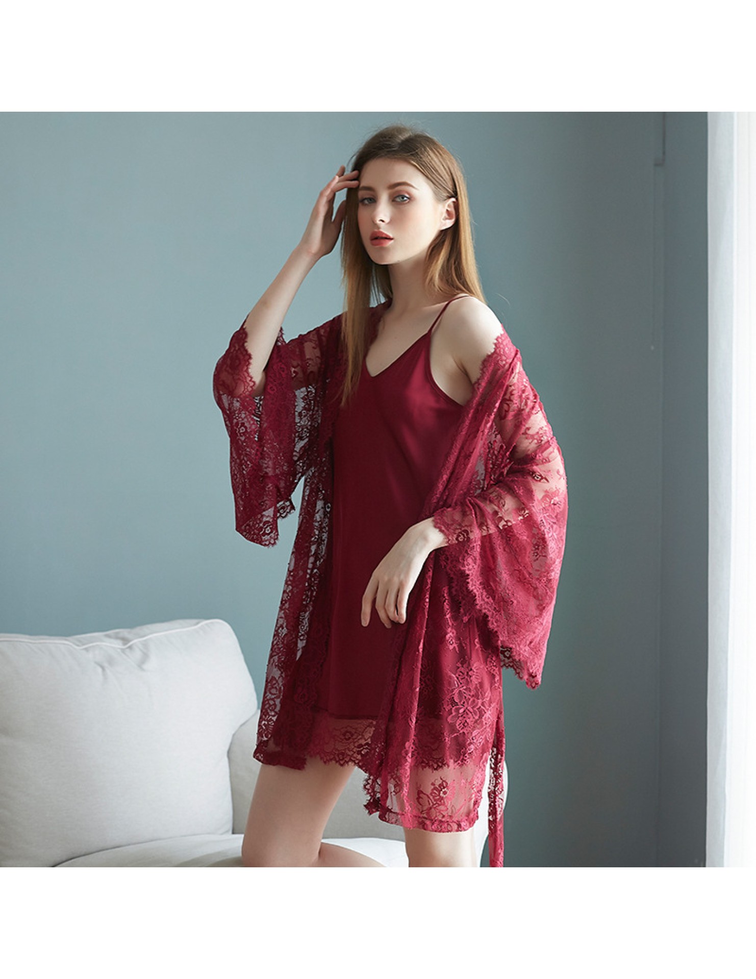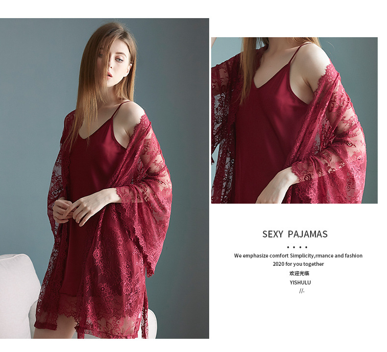 新款冰絲吊帶睡裙蕾絲性感睡袍兩件套絲質睡衣女士性感家居服 LCBN
