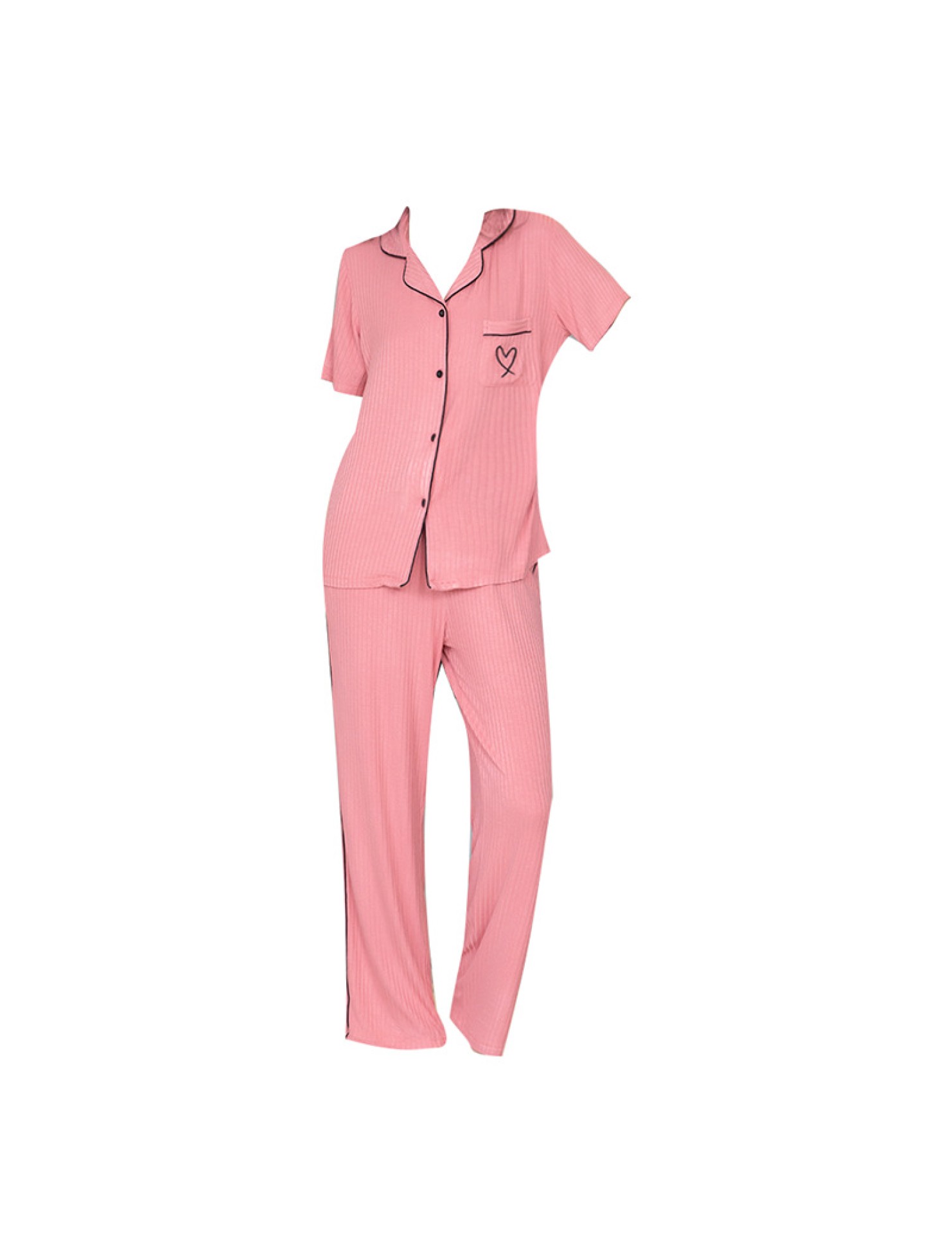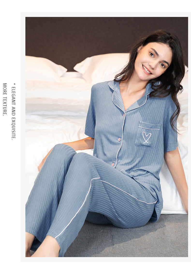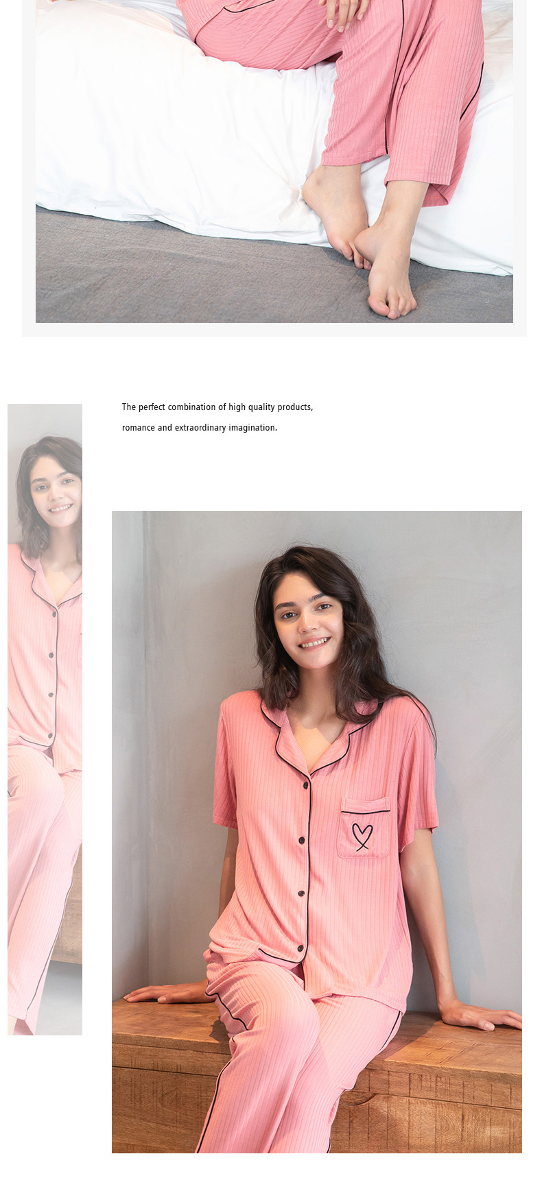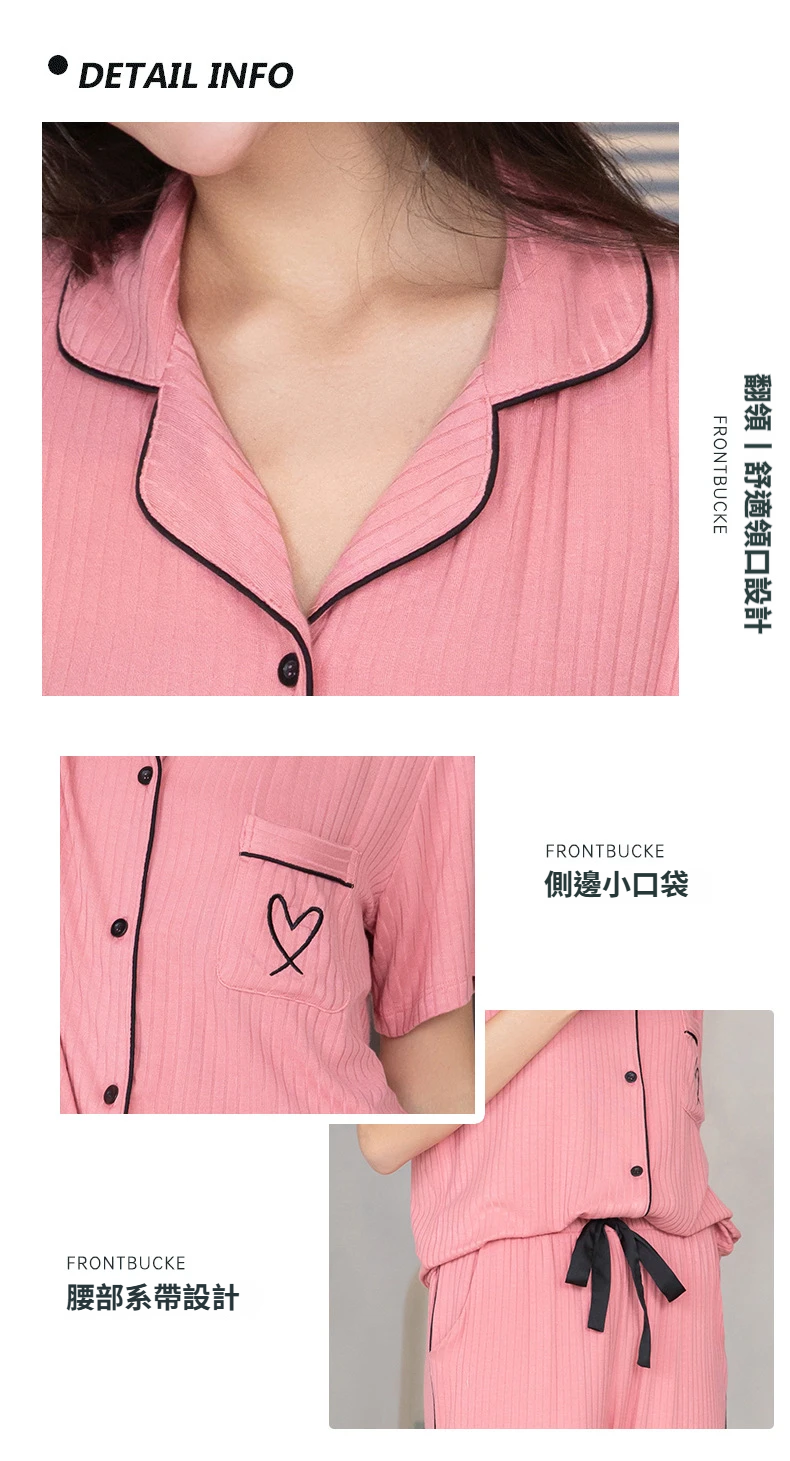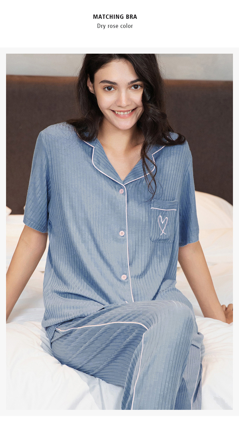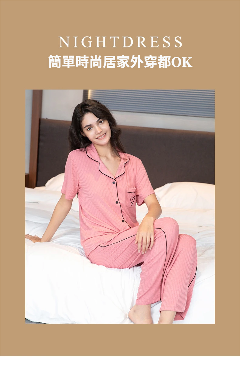 莫代爾人棉睡衣歐美風開衫條紋家居服愛心口袋長褲休閑套裝女 LCBN