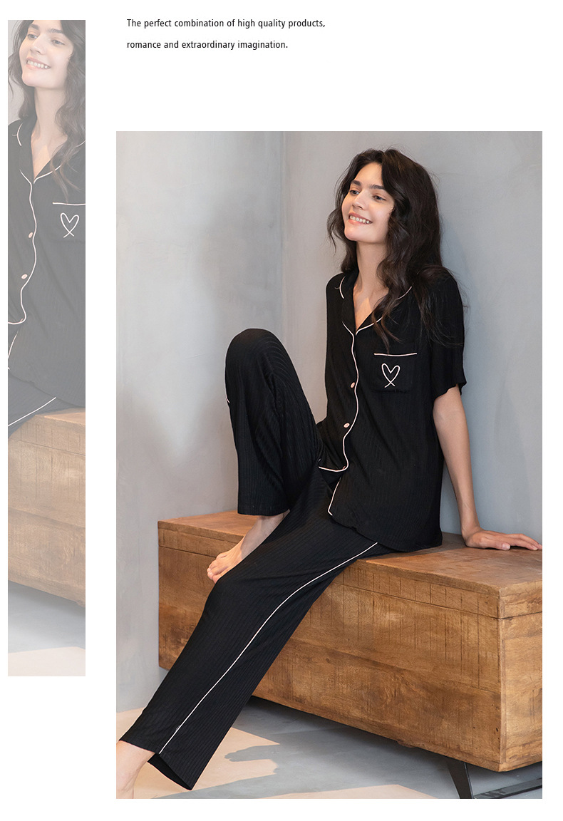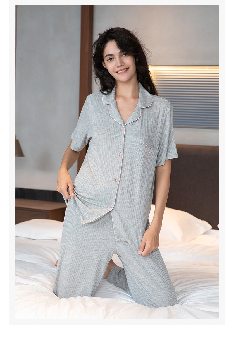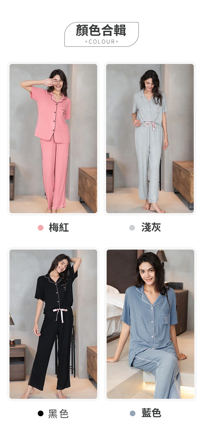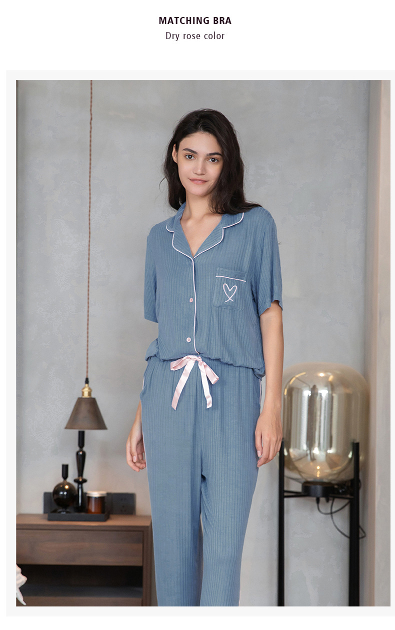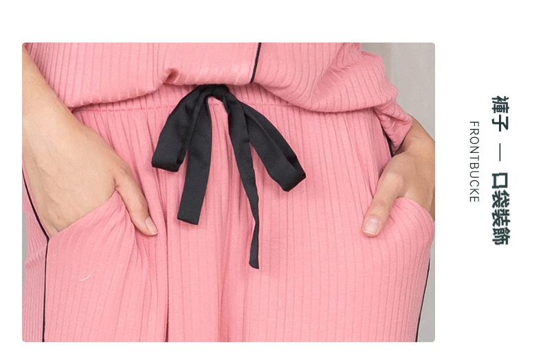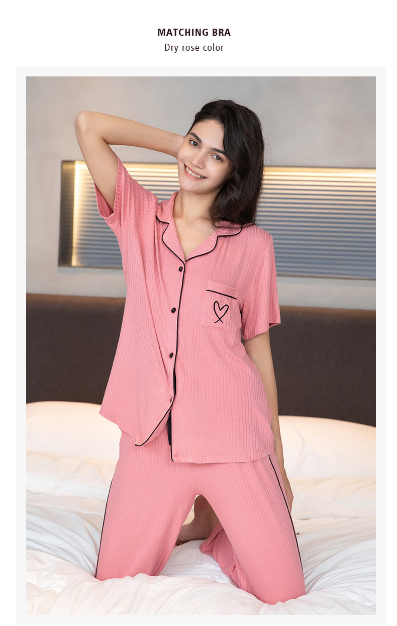 莫代爾人棉睡衣歐美風開衫條紋家居服愛心口袋長褲休閑套裝女 LCBN