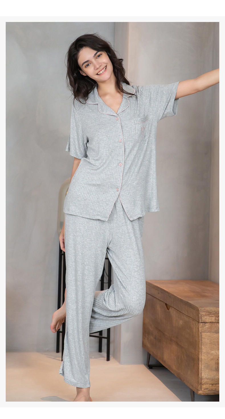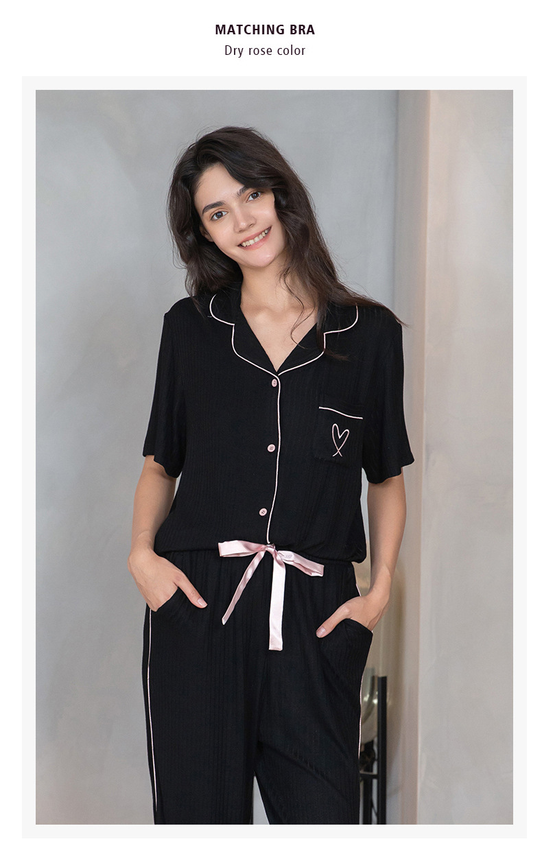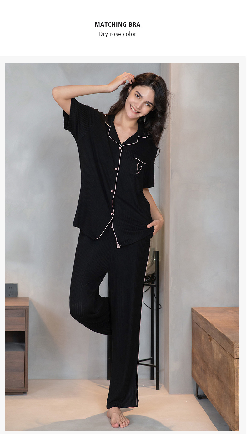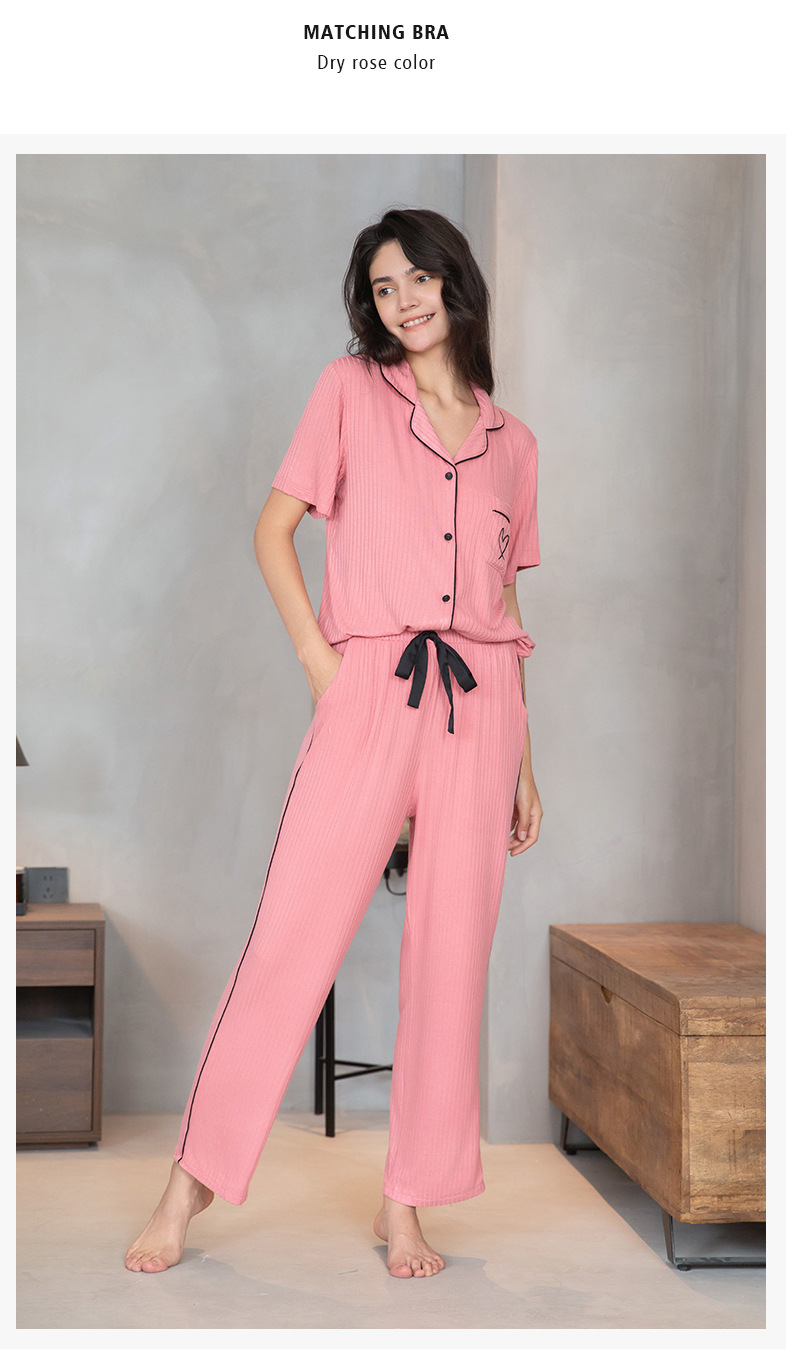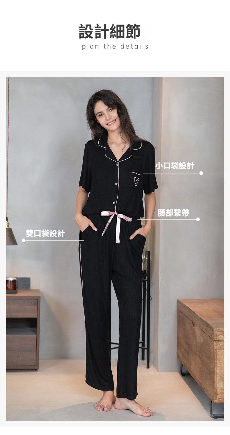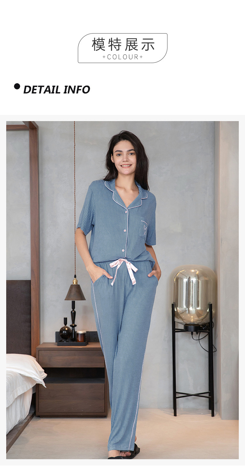 莫代爾人棉睡衣歐美風開衫條紋家居服愛心口袋長褲休閑套裝女 LCBN