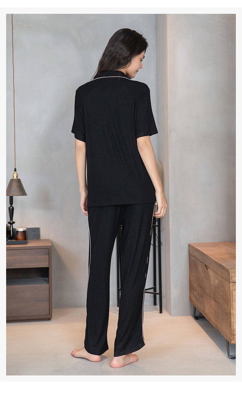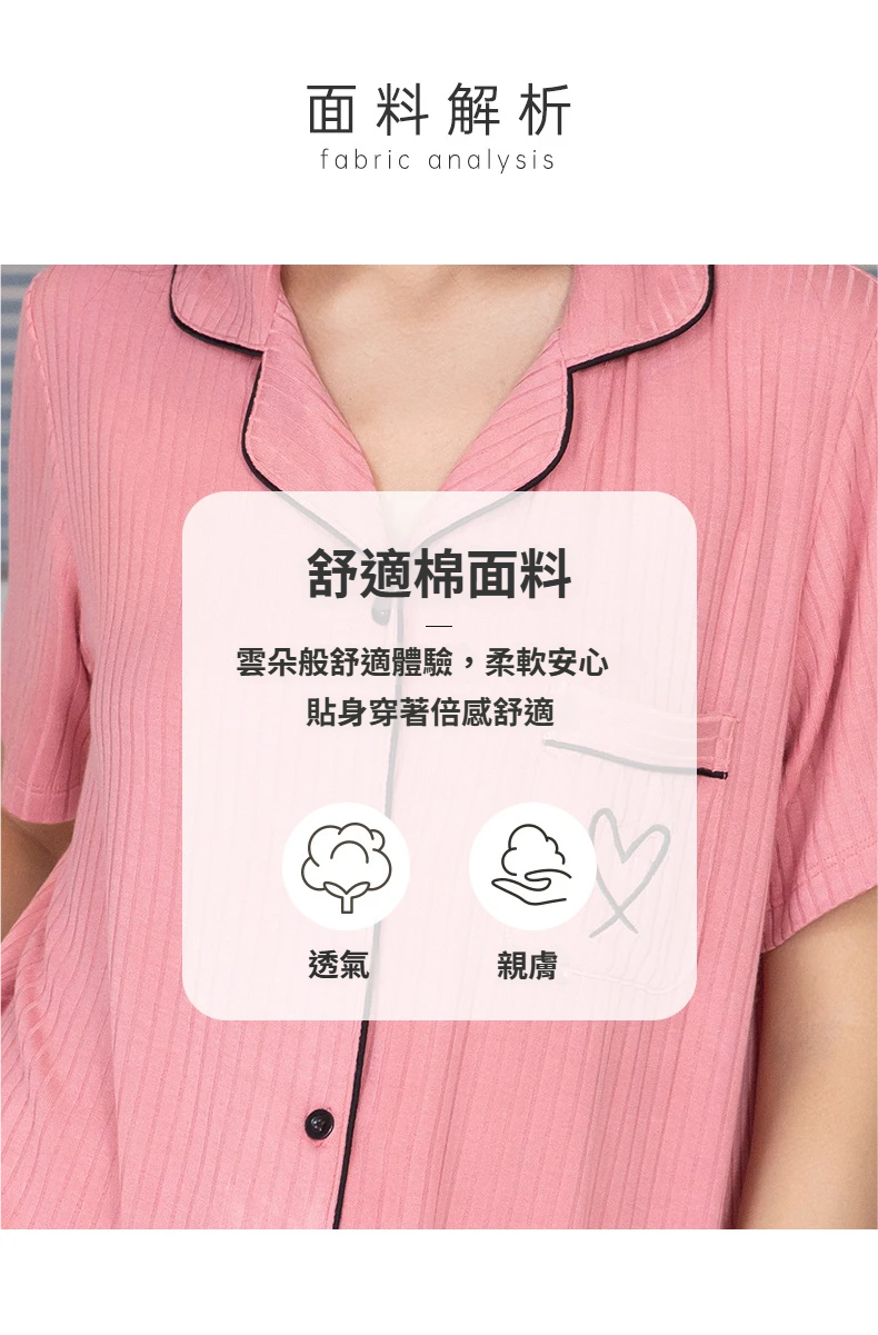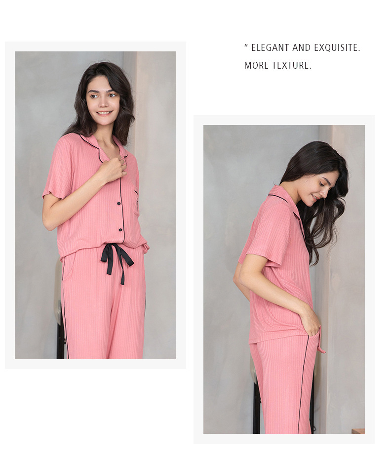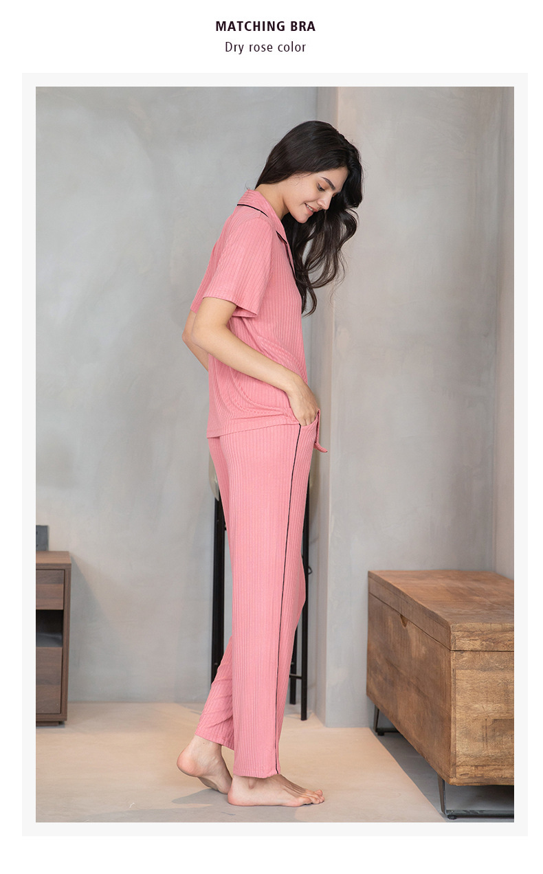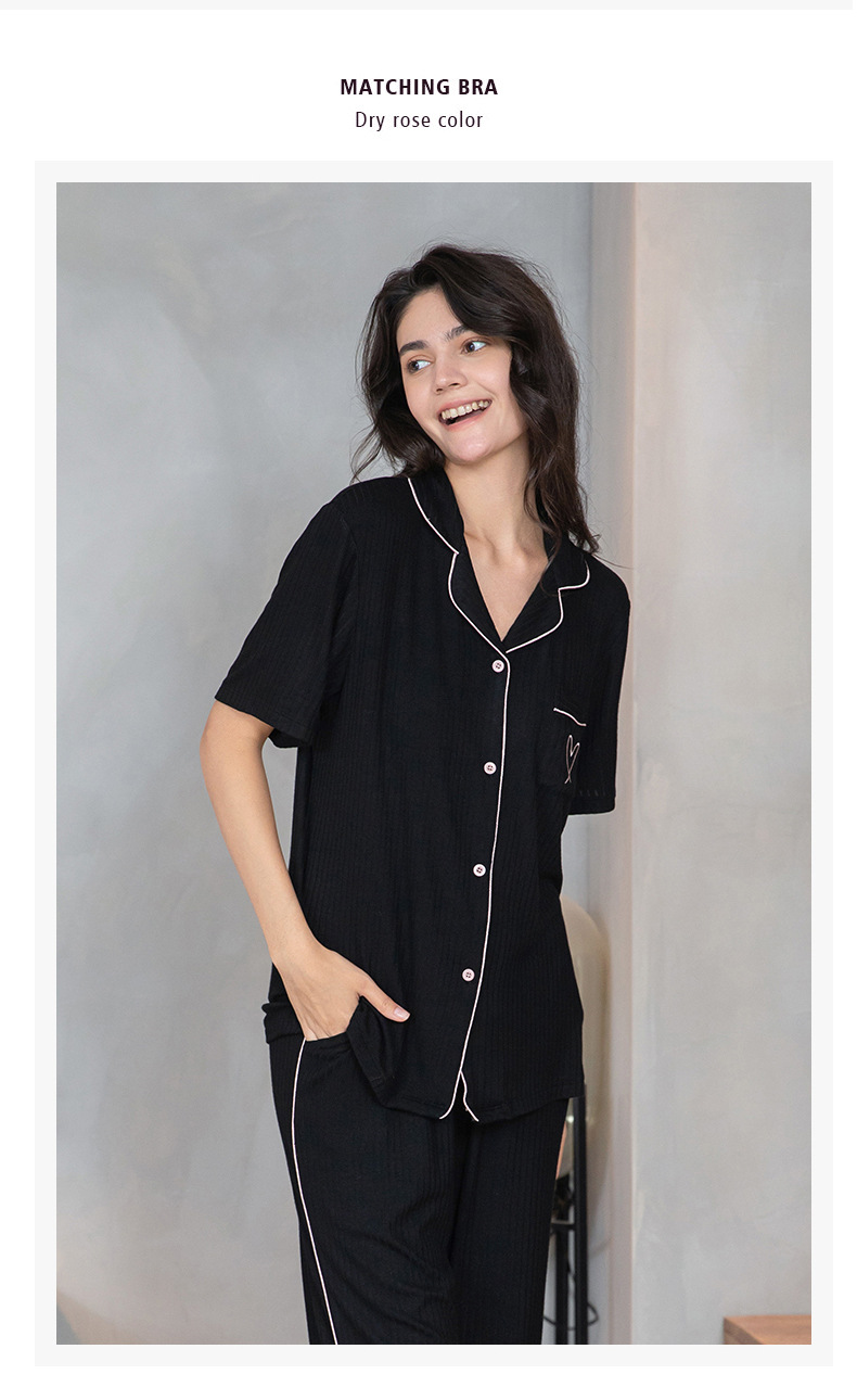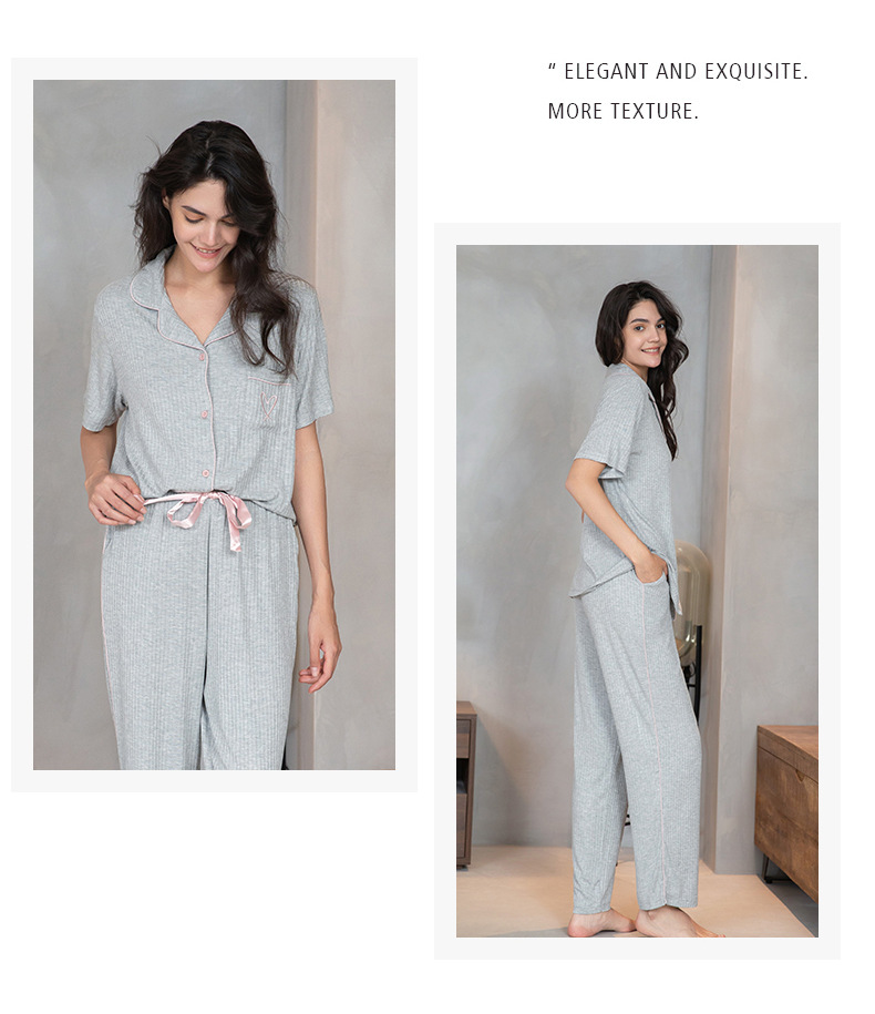 莫代爾人棉睡衣歐美風開衫條紋家居服愛心口袋長褲休閑套裝女 LCBN