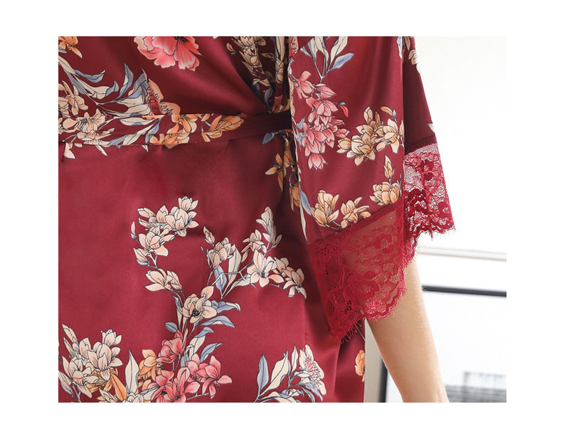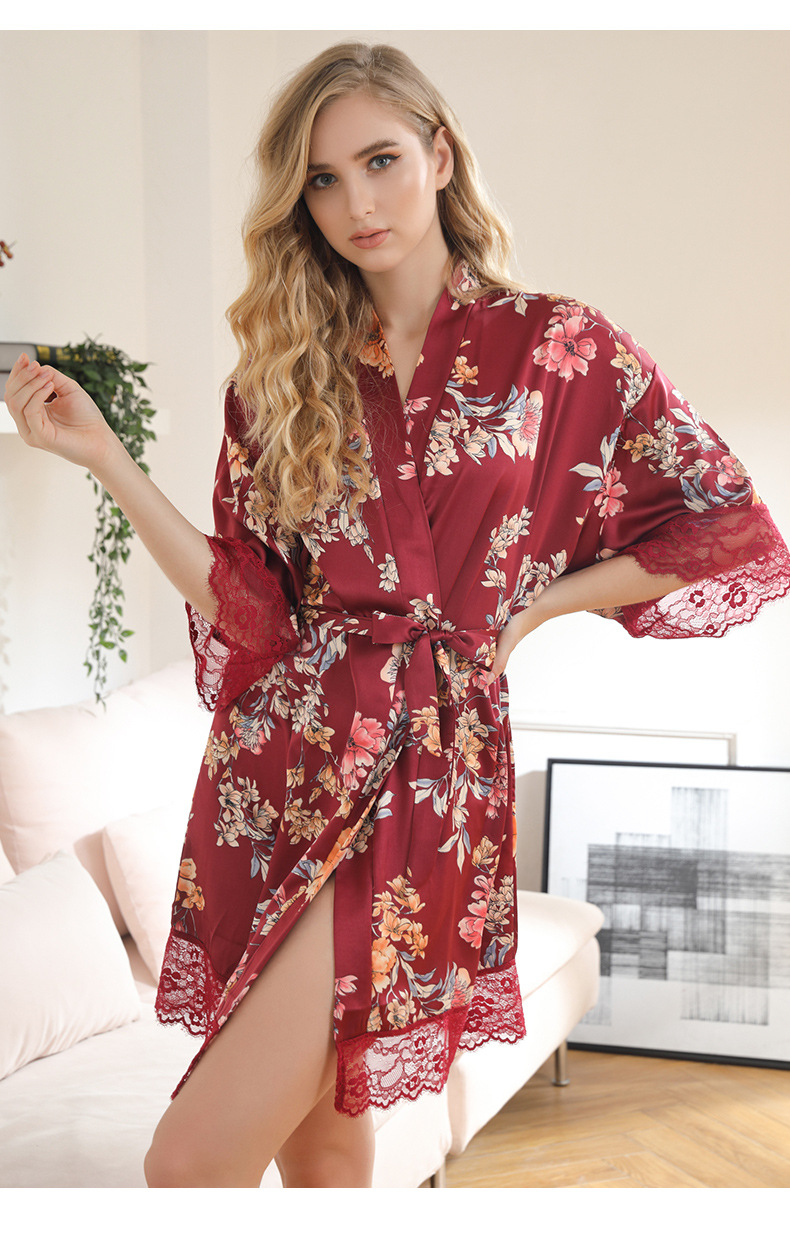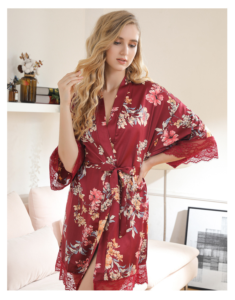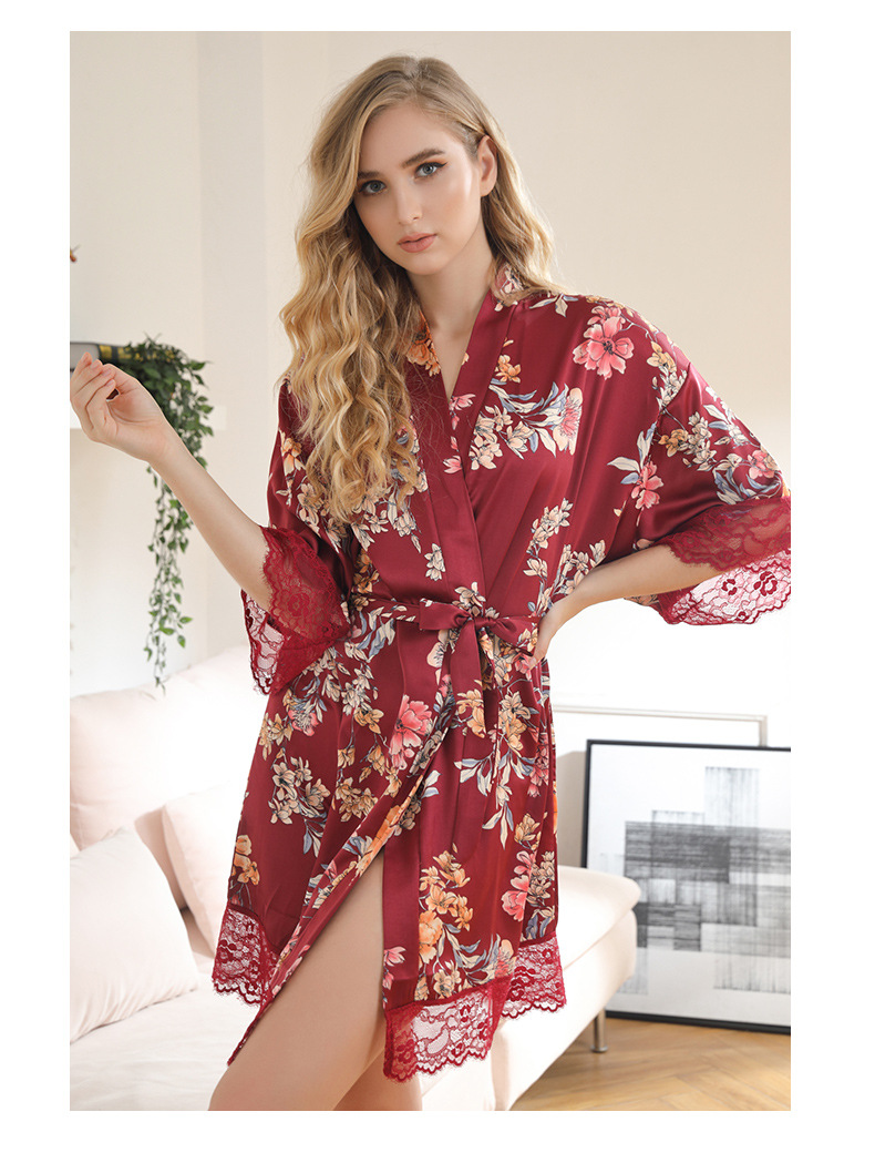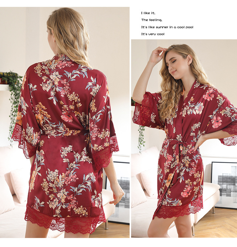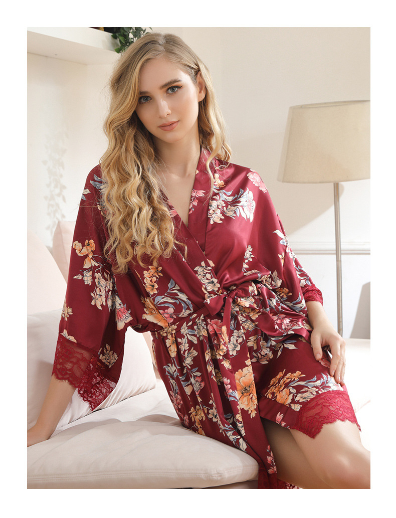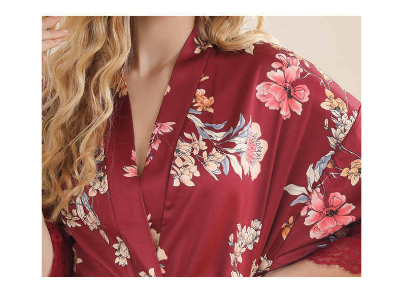 LCBN251225100261 女士性感居家服飾新娘晨袍大碼仿真絲睡袍女紅色歐美印花浴袍
