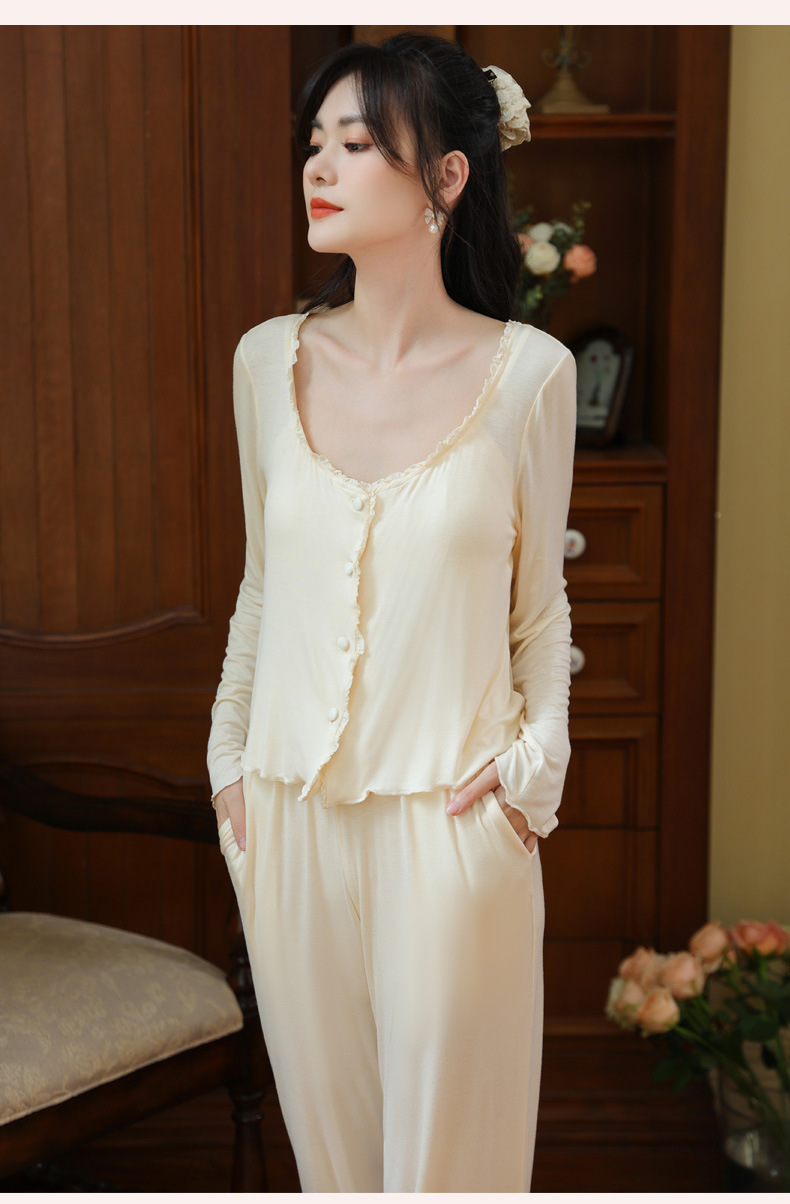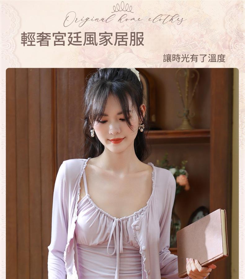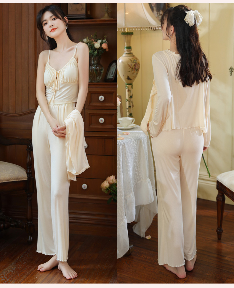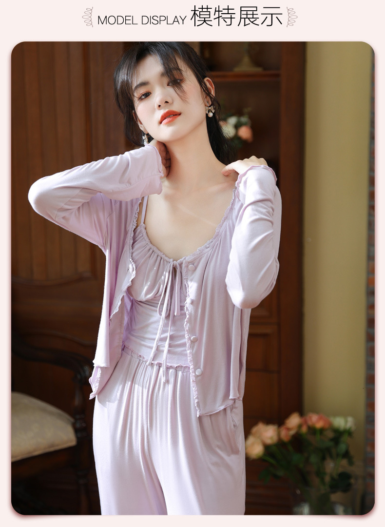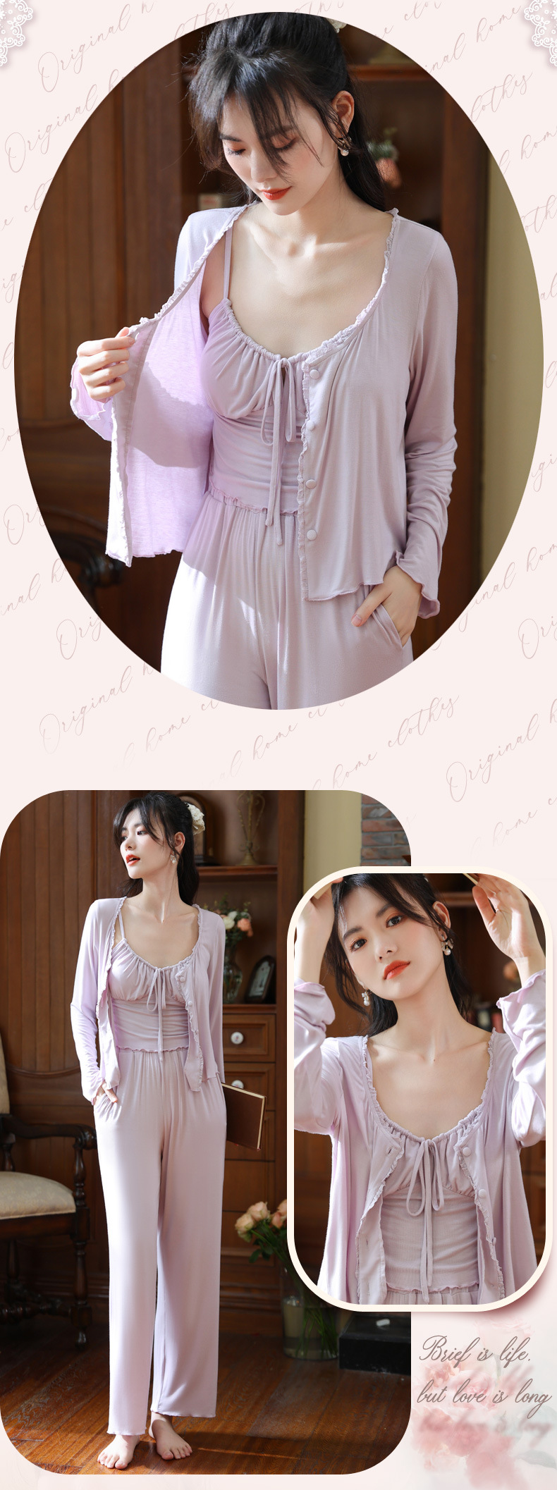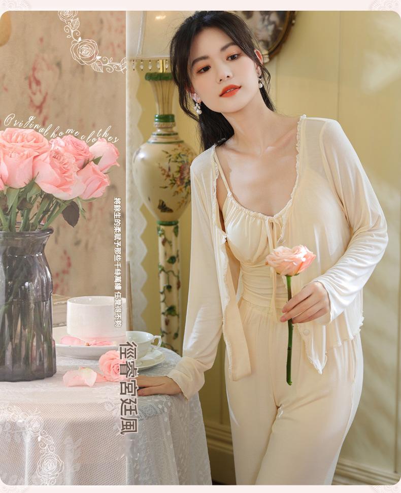 PRDN121100033 長袖睡衣套裝莫代爾宮廷風彈力睡褲帶胸墊吊帶外穿家居服三件套秋