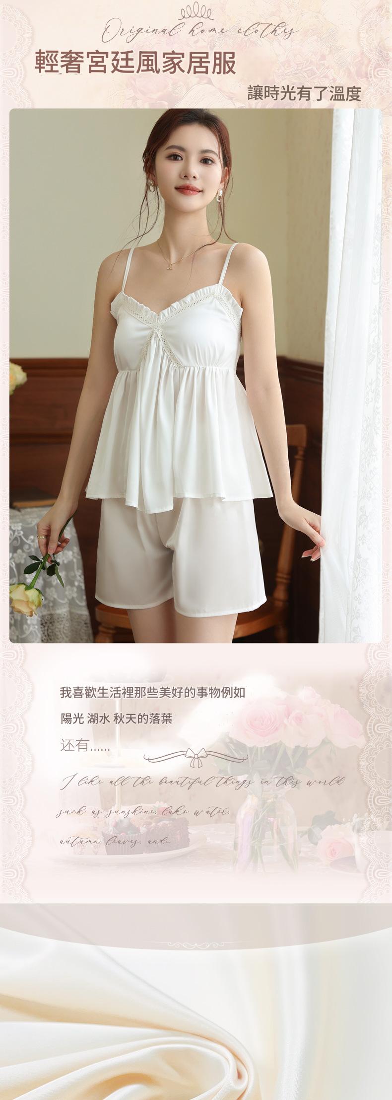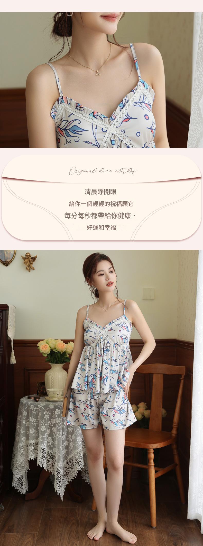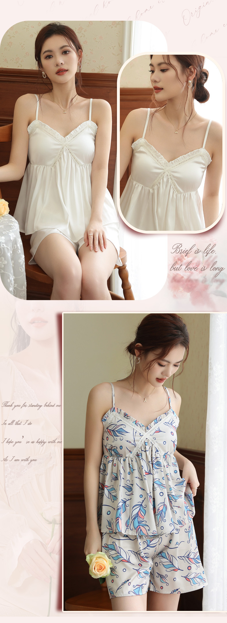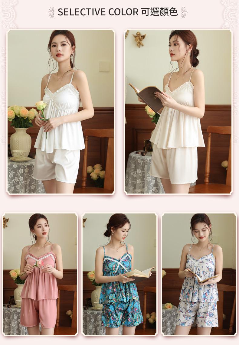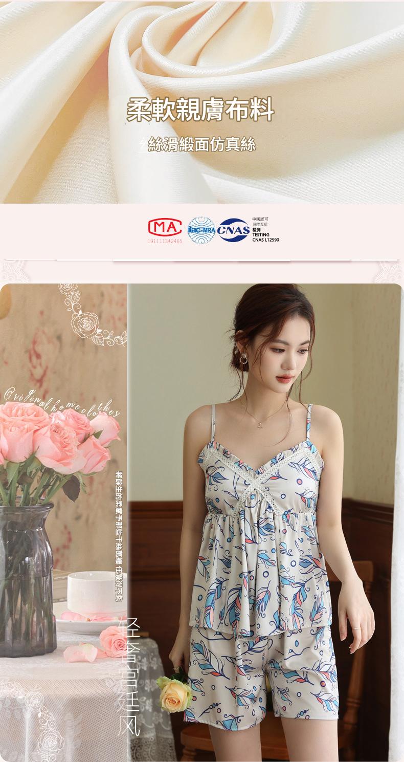 PRDN121100100 吊帶睡衣女夏冰絲綢睡褲兩件套仿真絲法式帶胸墊可外穿家居服套裝