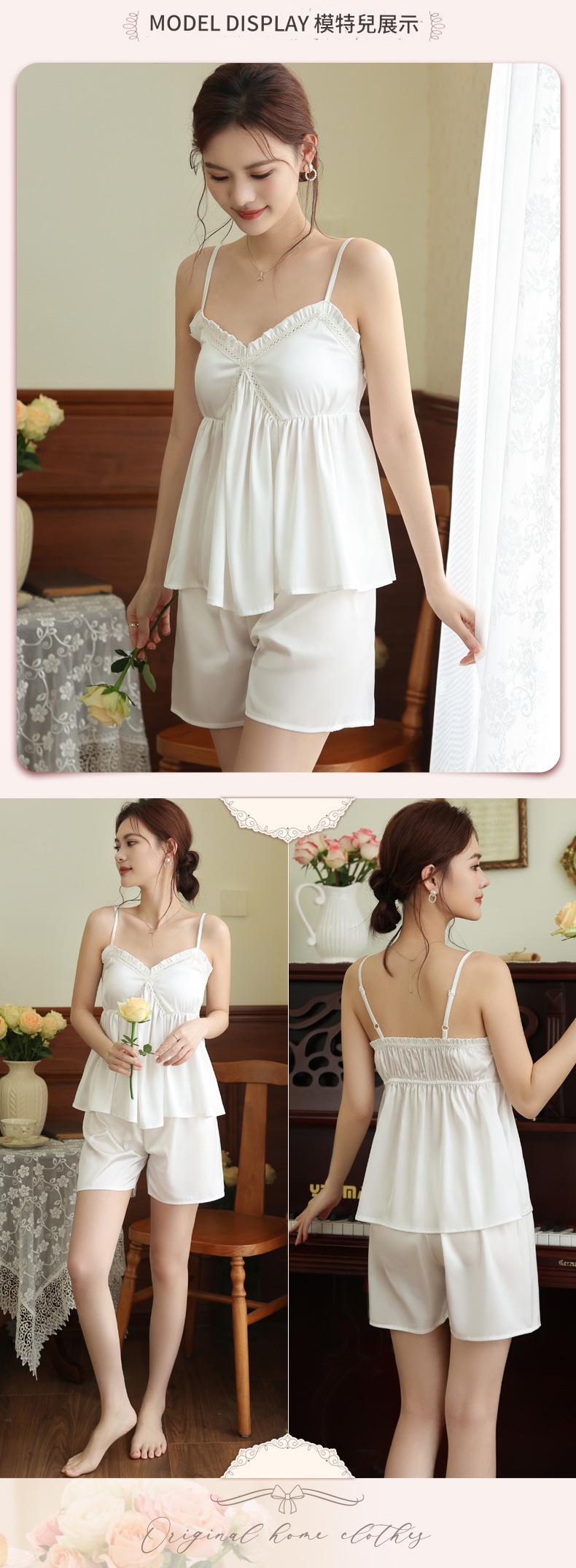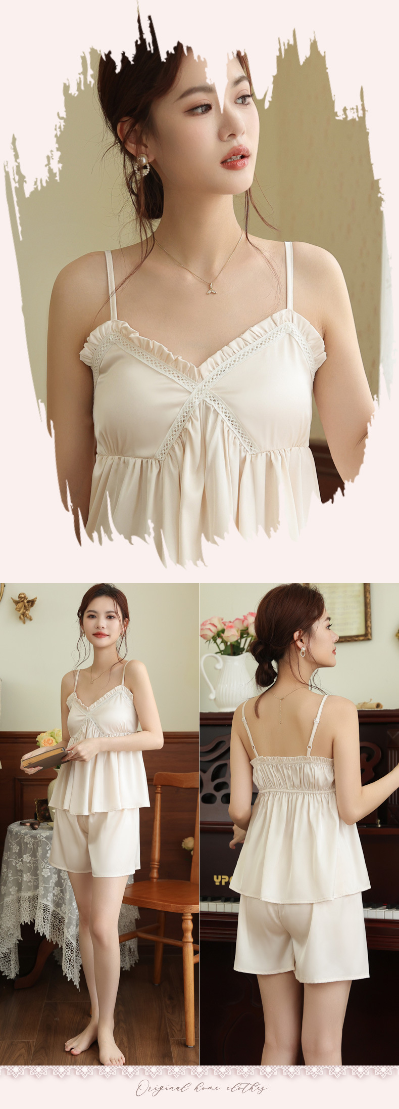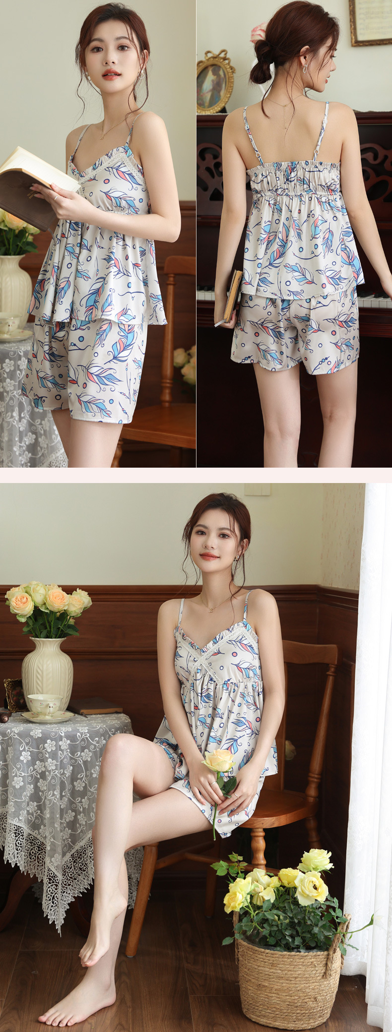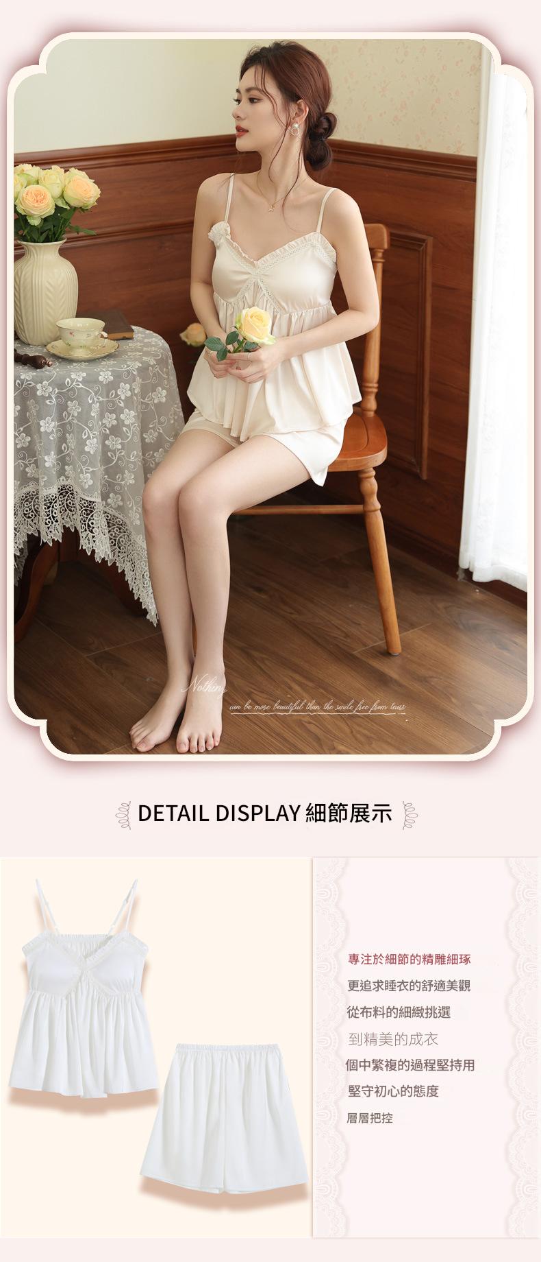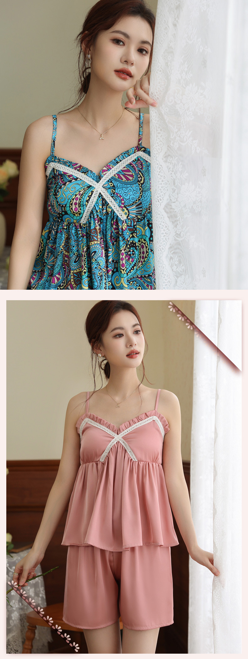 PRDN121100100 吊帶睡衣女夏冰絲綢睡褲兩件套仿真絲法式帶胸墊可外穿家居服套裝