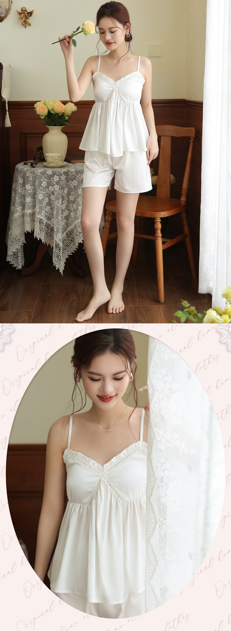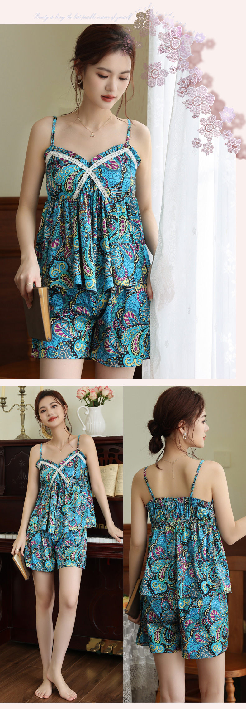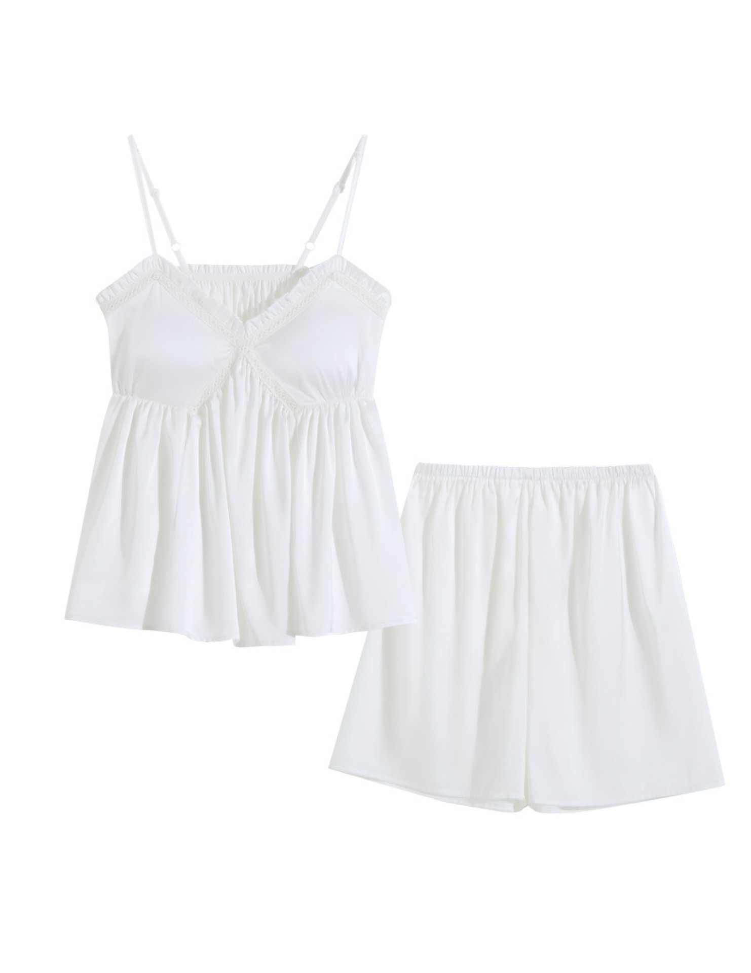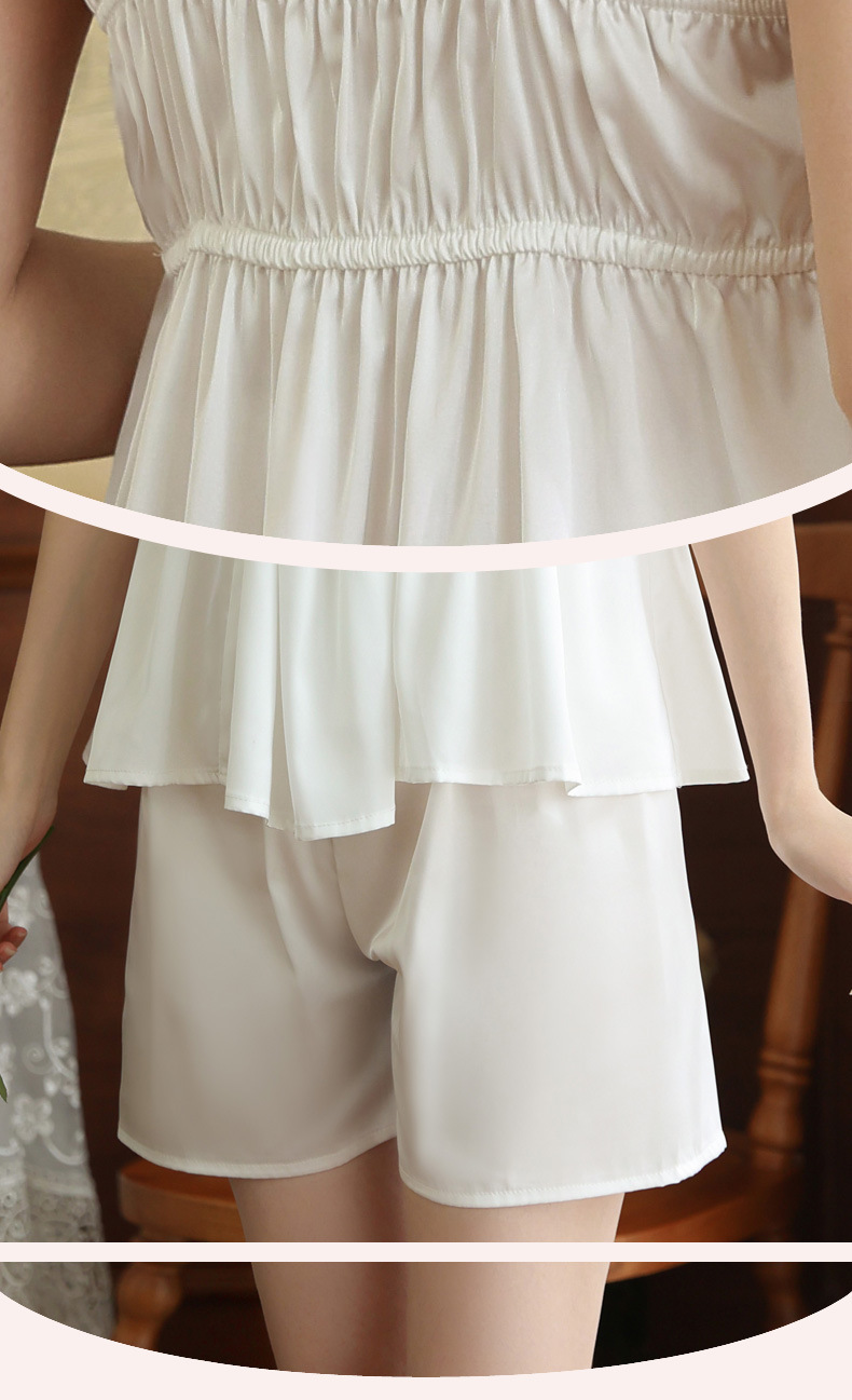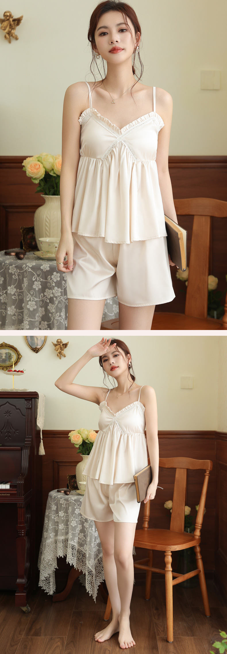 PRDN121100100 吊帶睡衣女夏冰絲綢睡褲兩件套仿真絲法式帶胸墊可外穿家居服套裝