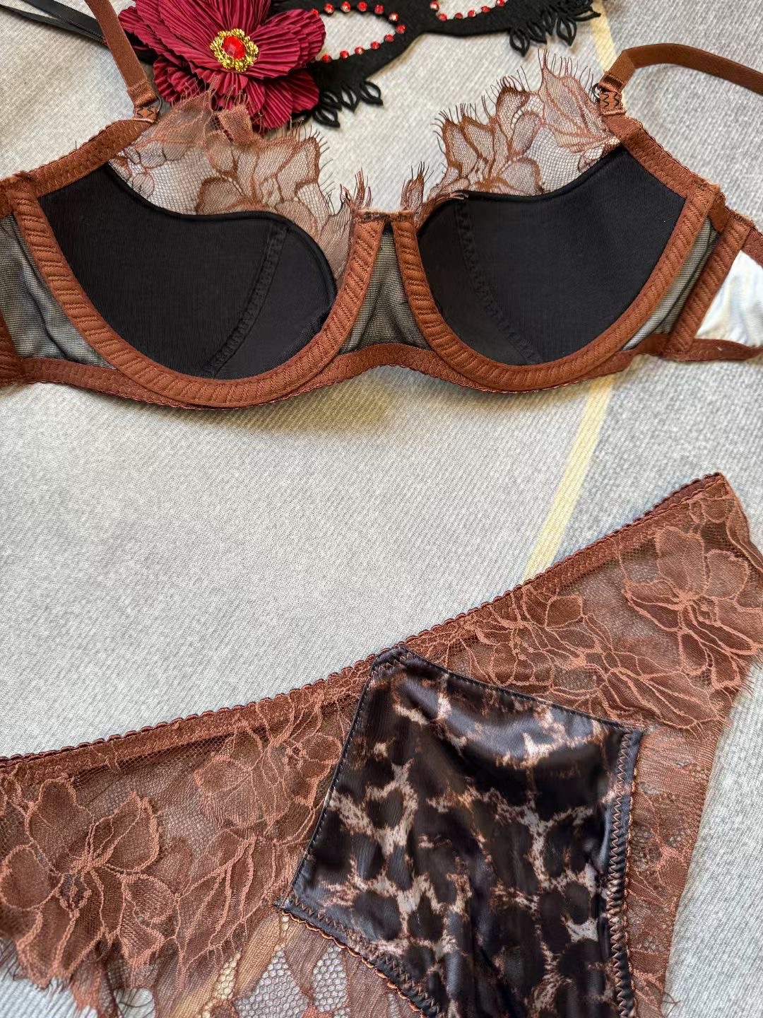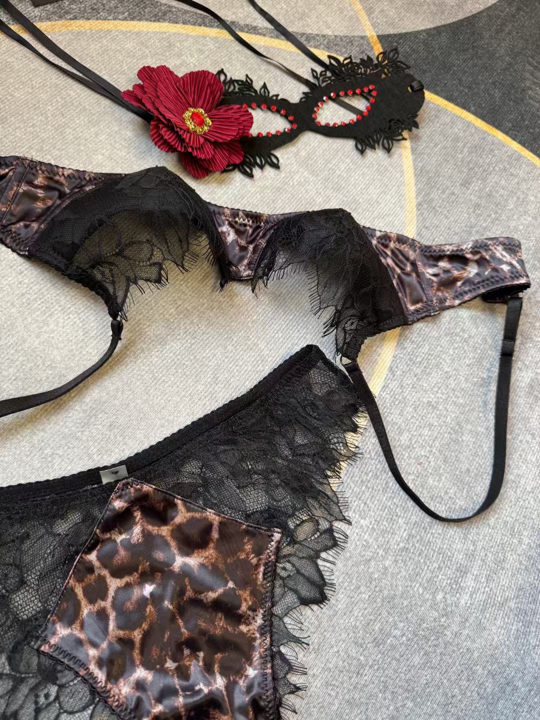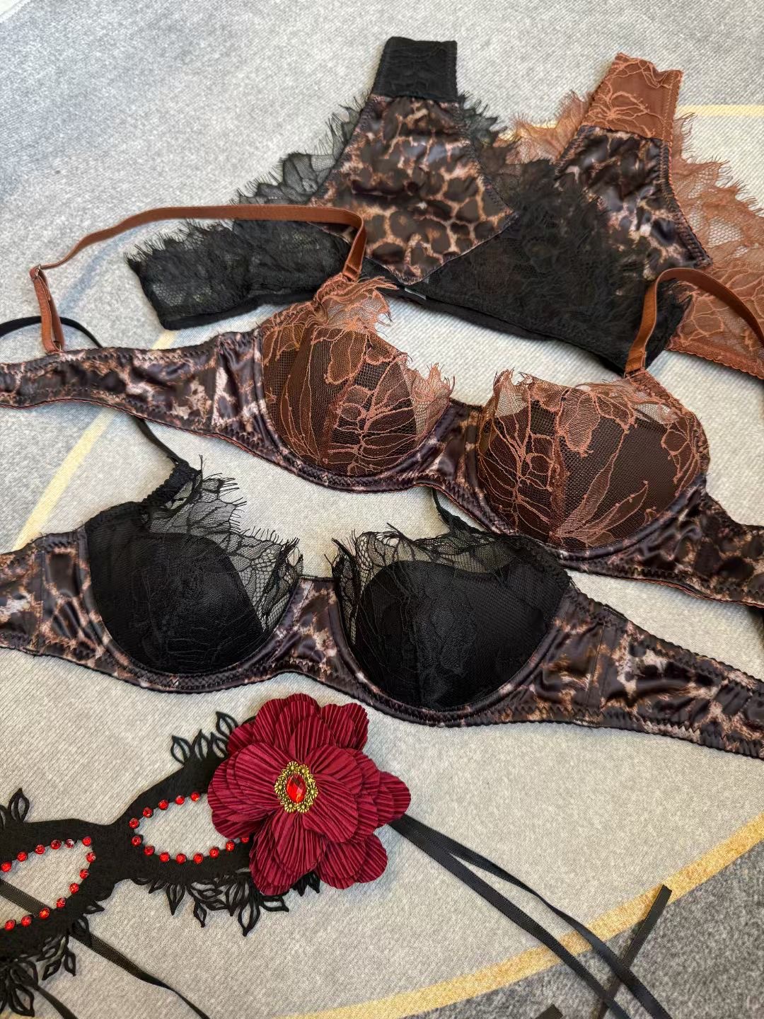 WLMZ113100336 法式內衣女薄款豹紋撞色蕾絲文胸大胸顯小防下垂大碼性感內衣