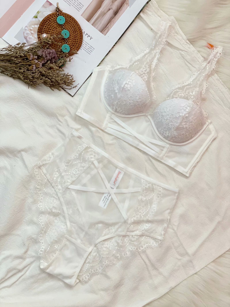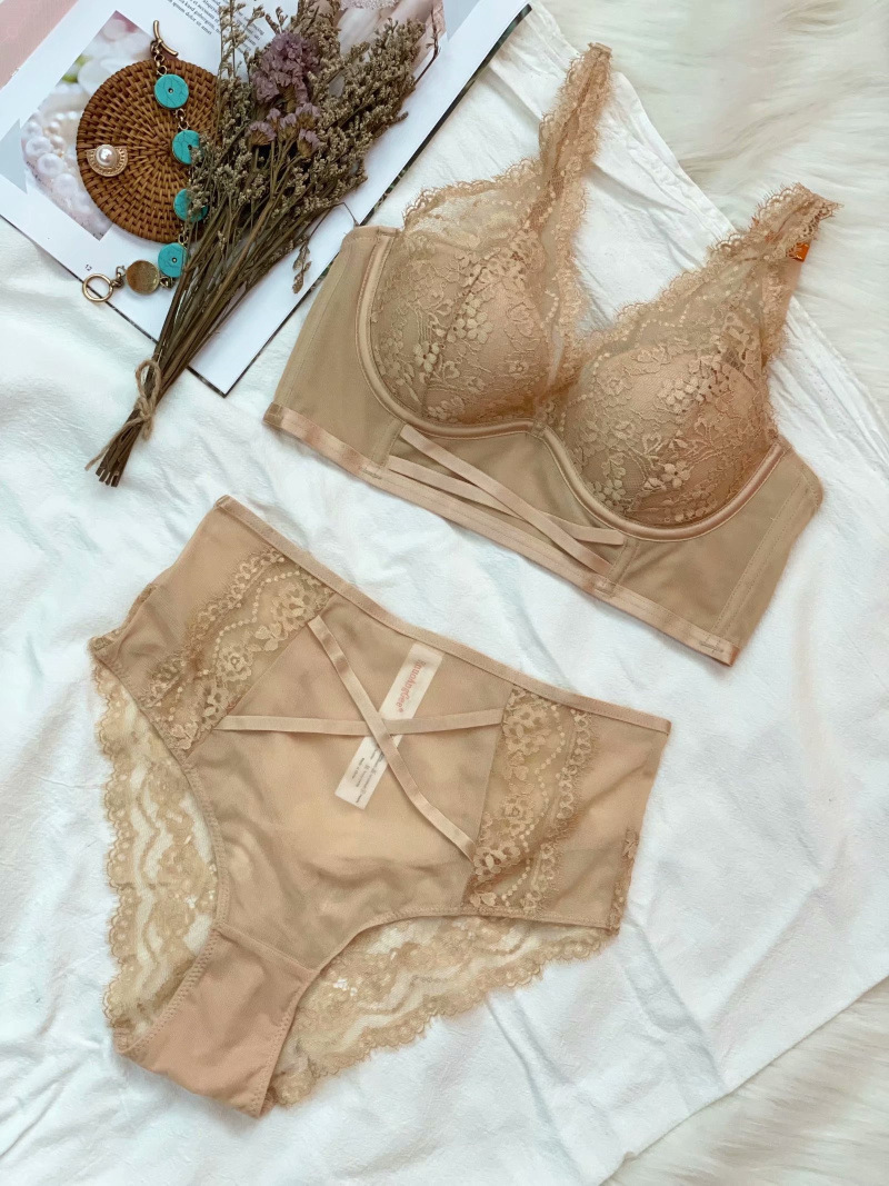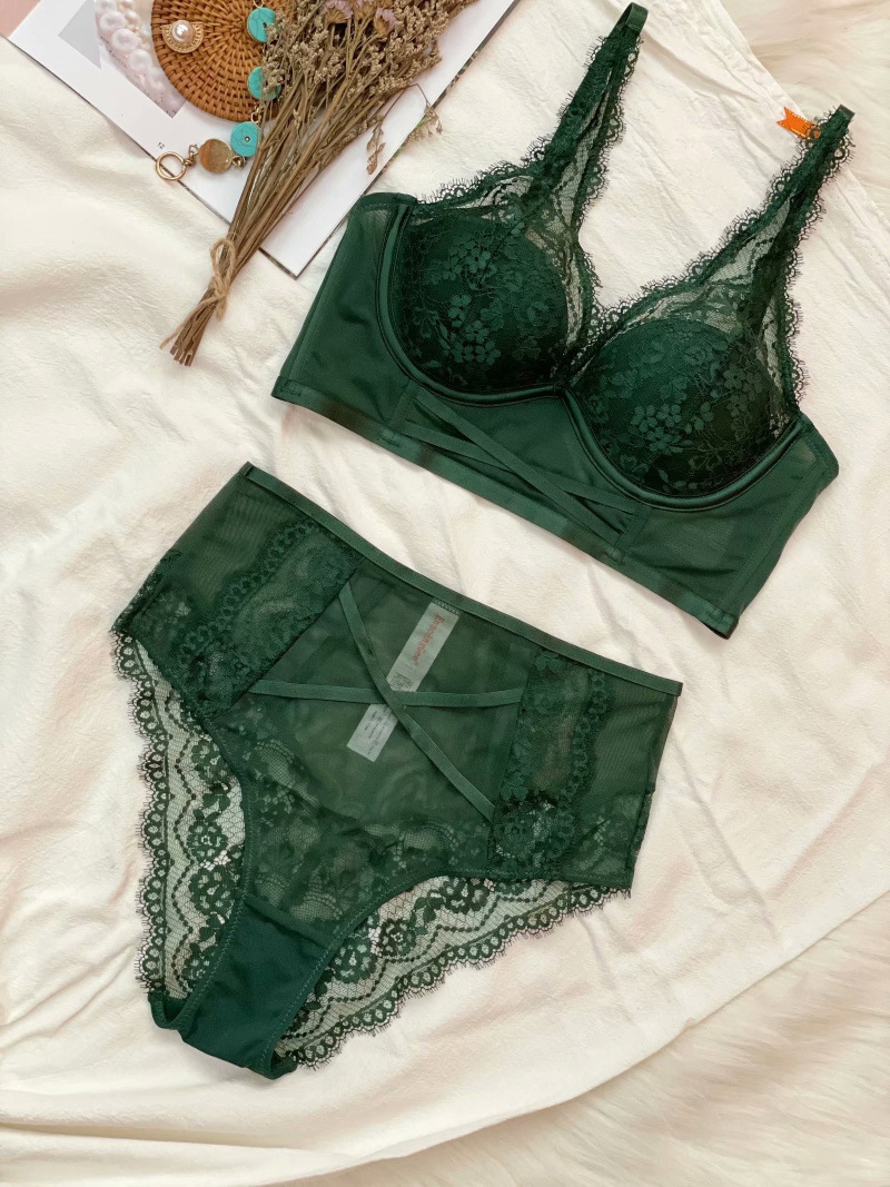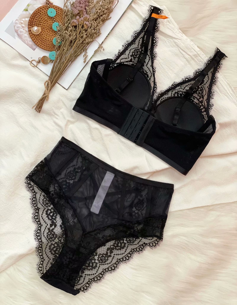 WLMZ113100396 法式性感蕾絲薄杯文胸套裝深V小胸聚攏調整型文胸高腰內褲內衣女