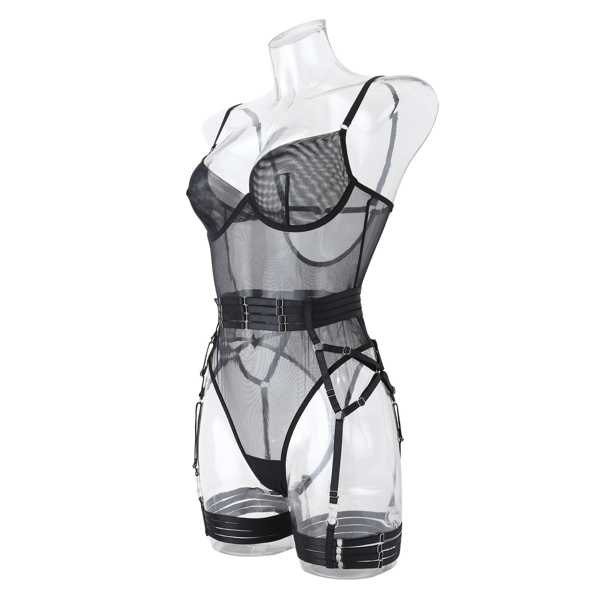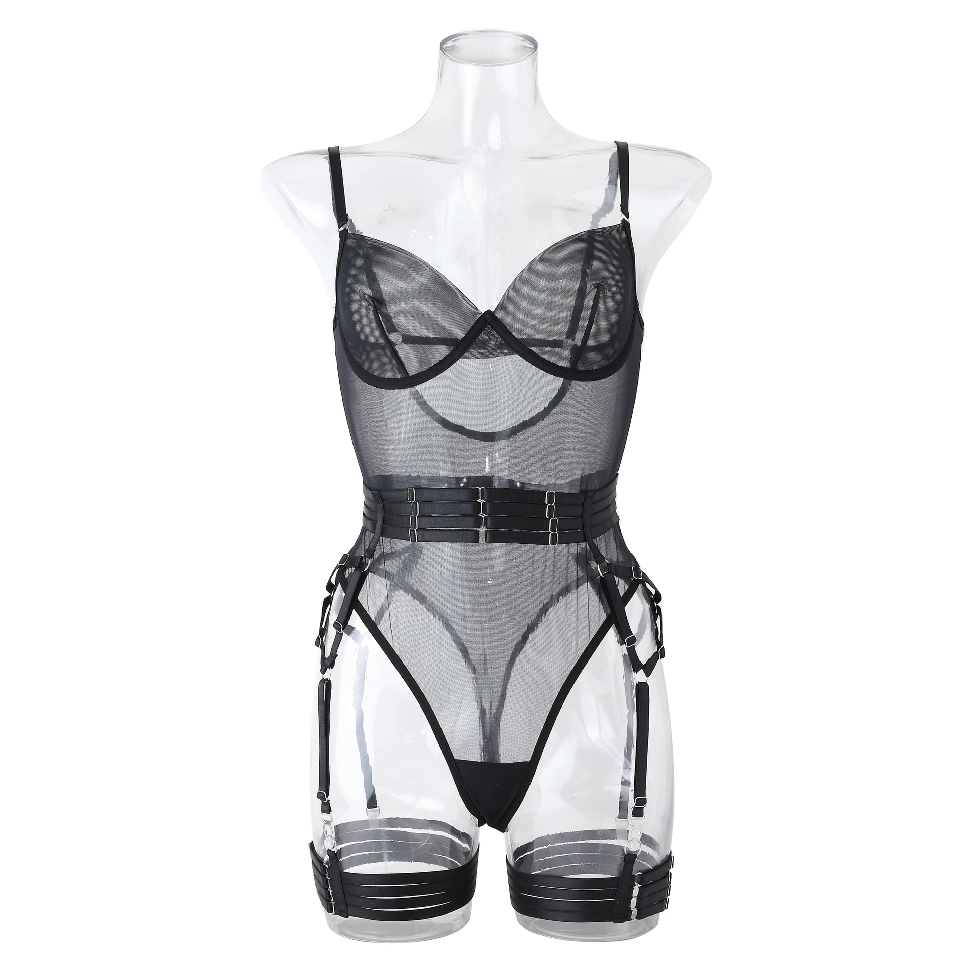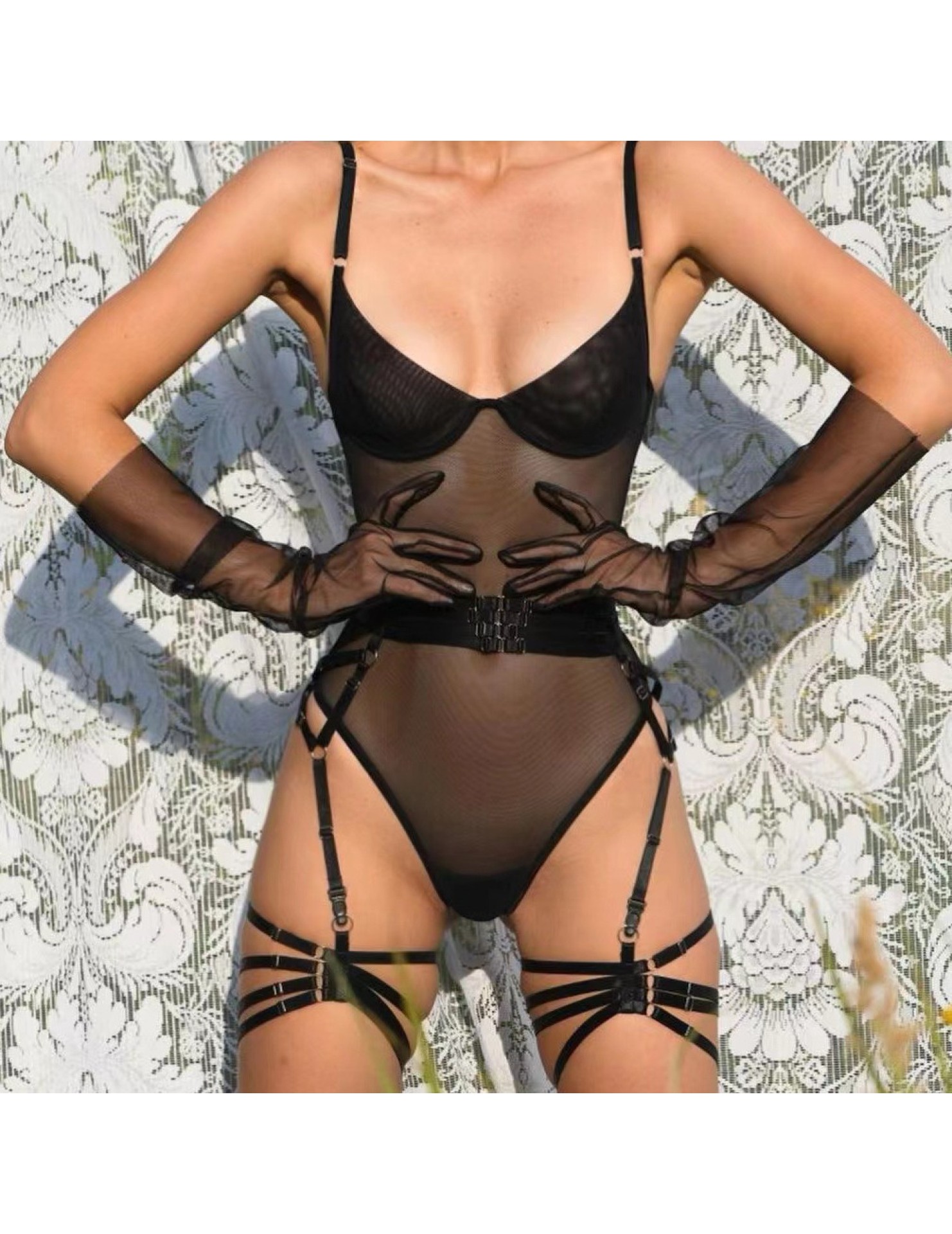 LSFA110GKB1006 新款女情趣網紗含手套腰帶吊襪扣開檔暗扣塑身連體衣