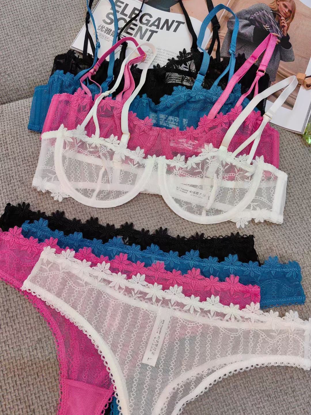 WLMZ113100365 法式性感內衣超薄半杯刺繡蕾絲文胸大胸顯小大碼情趣內衣套裝