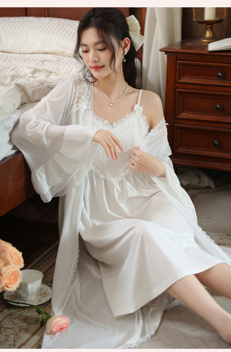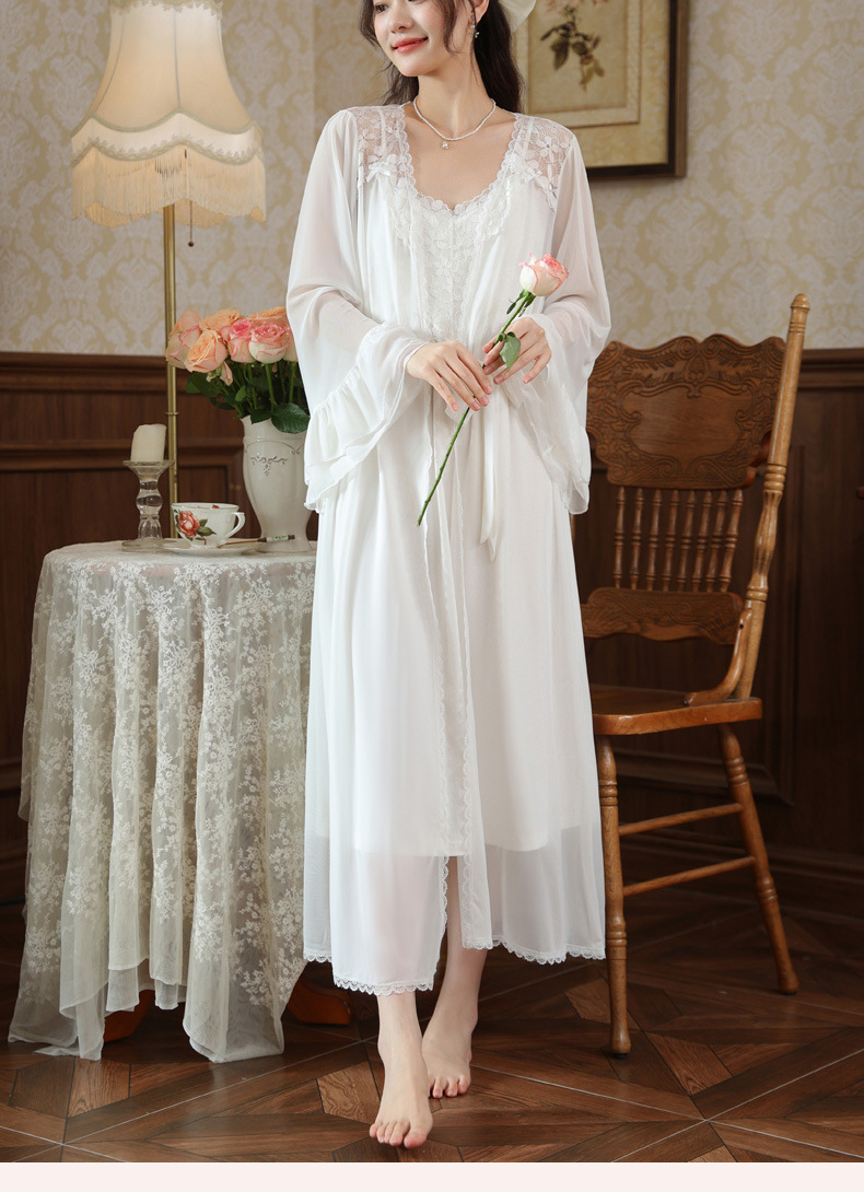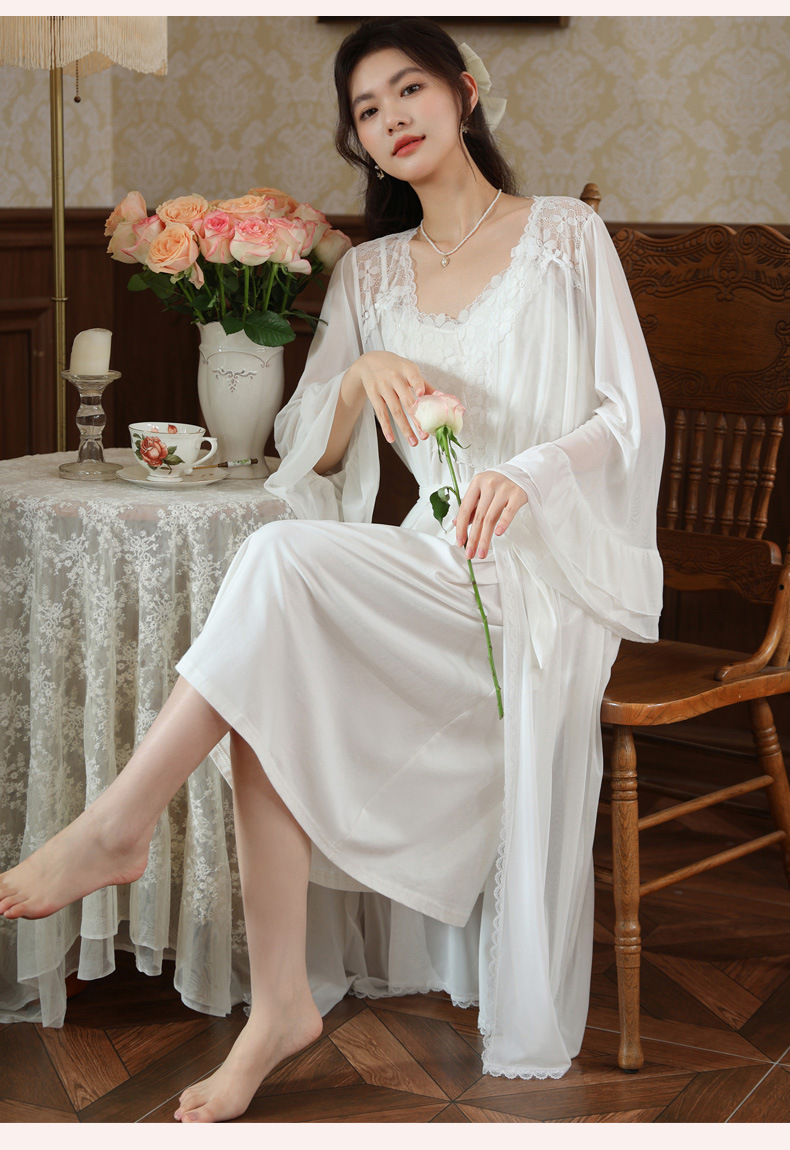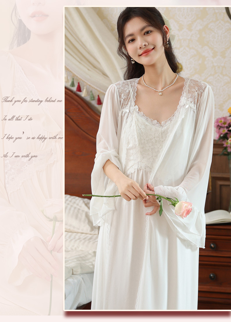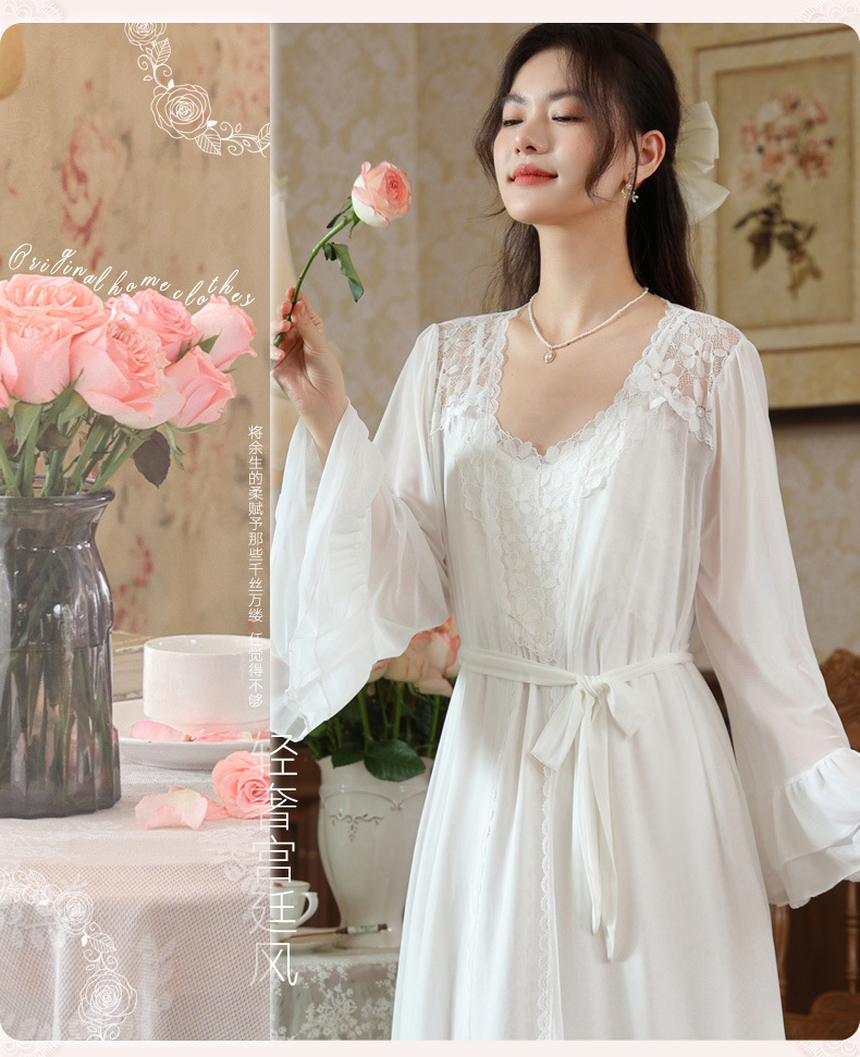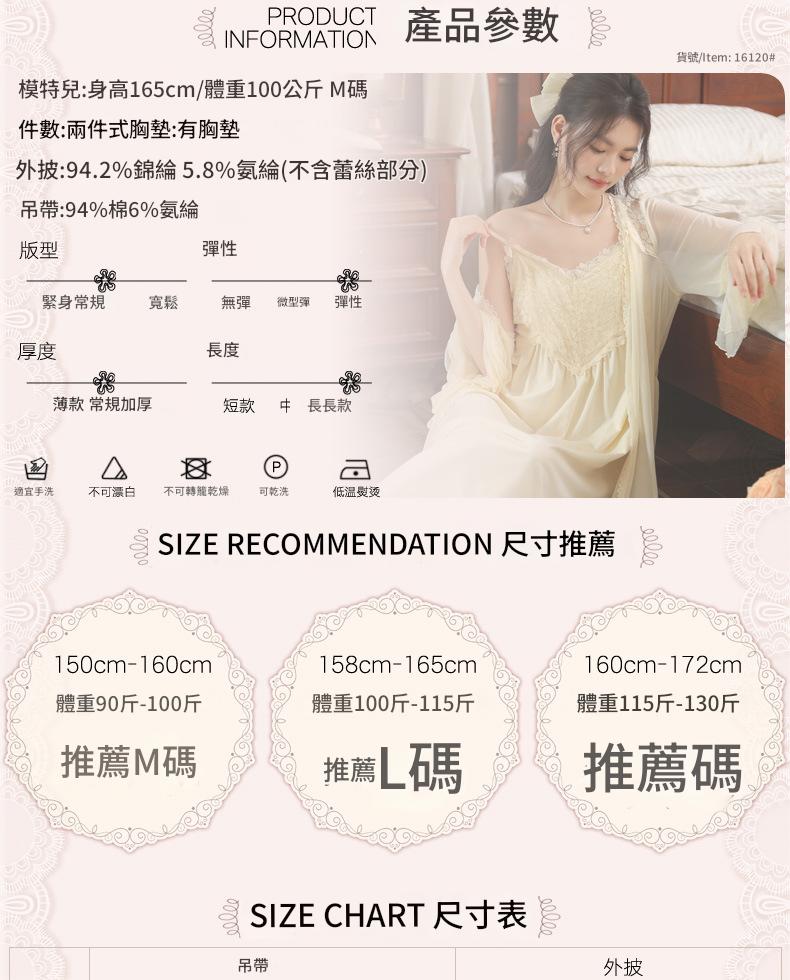 PRDN121100029 長袖睡袍女秋胸墊吊帶裙法式宮廷風睡衣網紗晨袍外穿家居服套裝春
