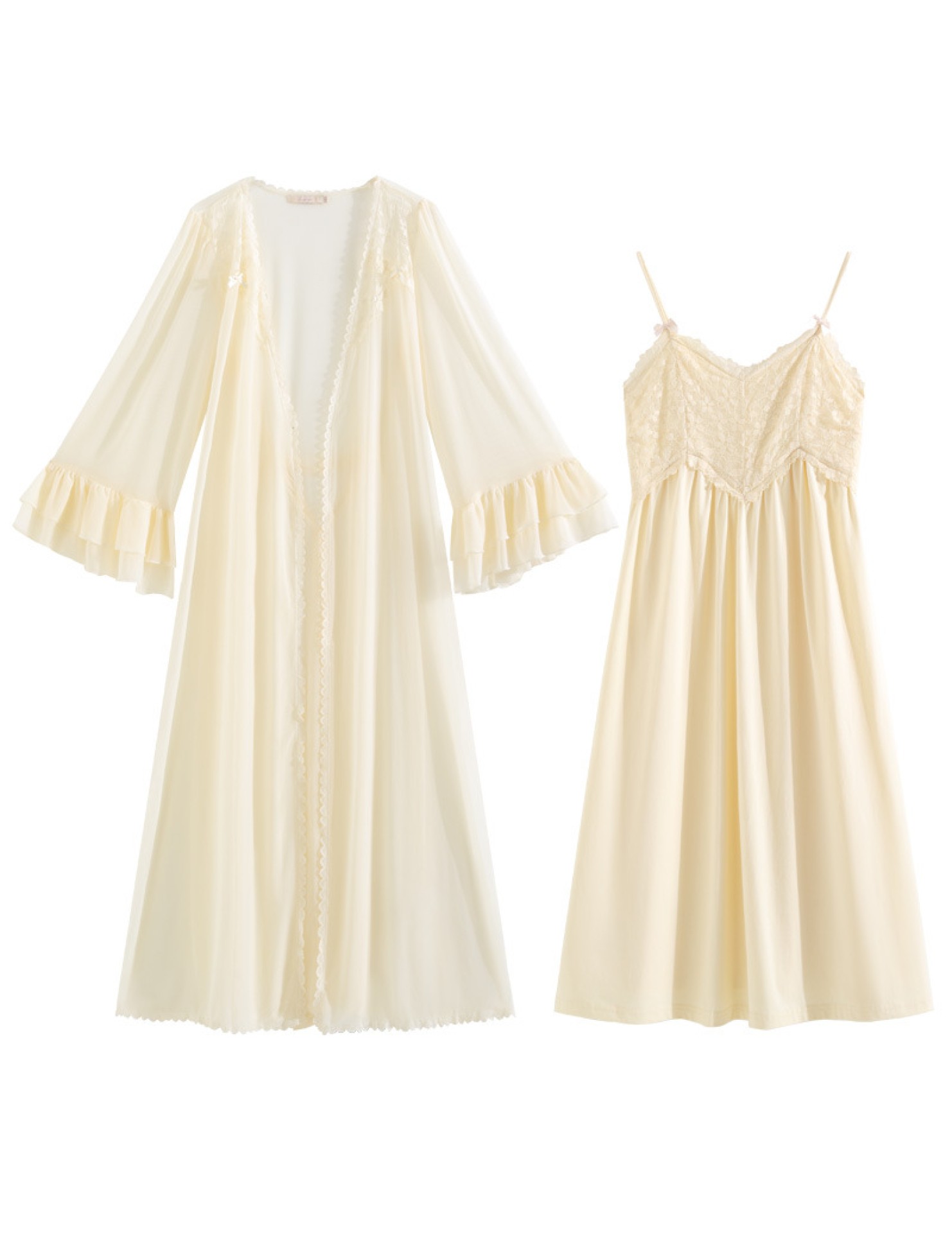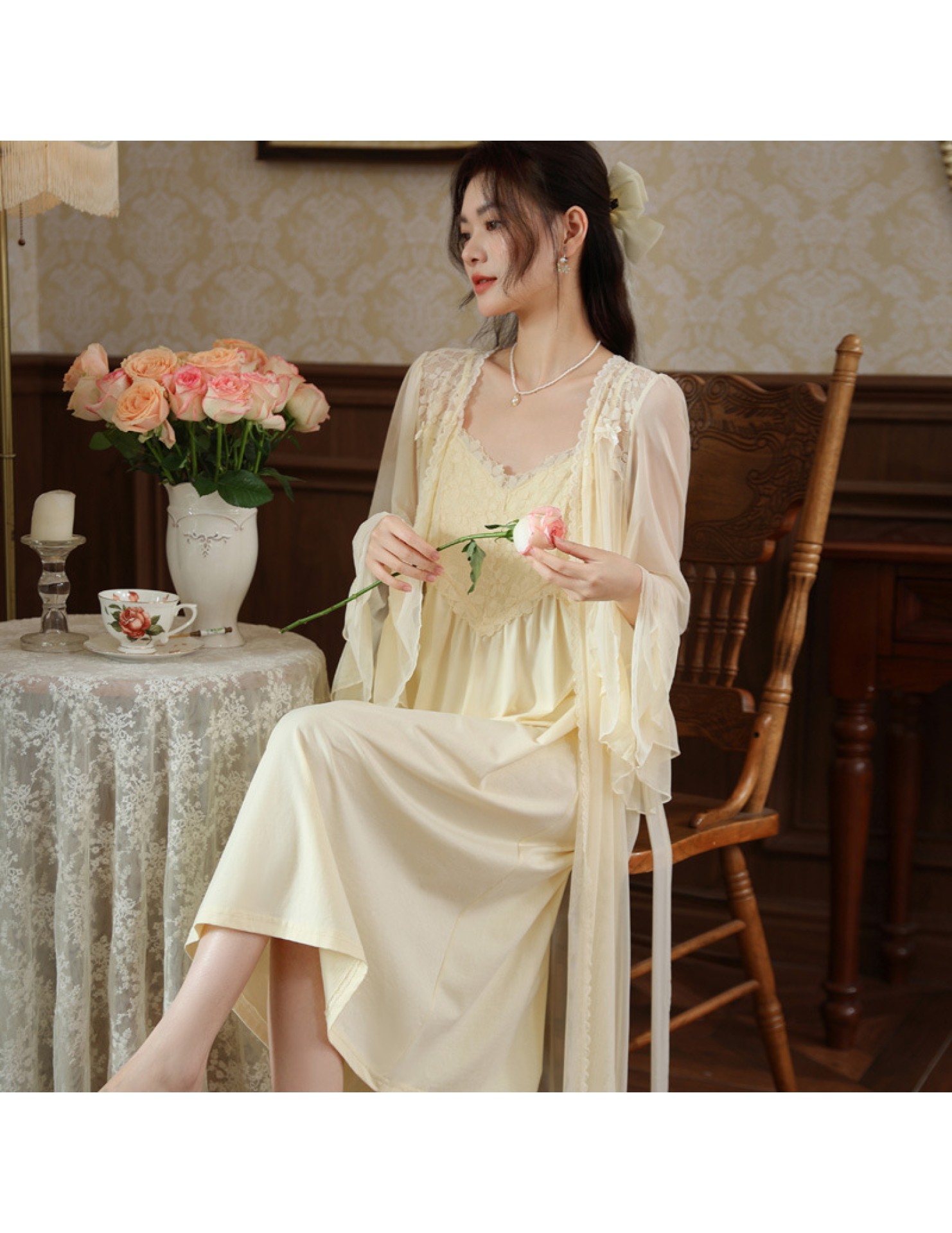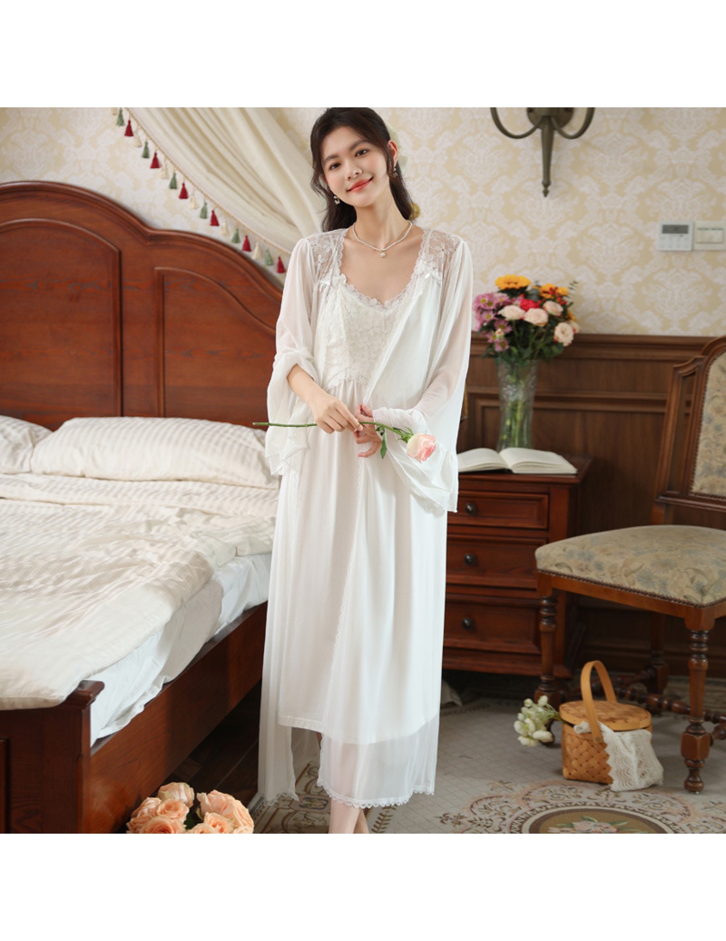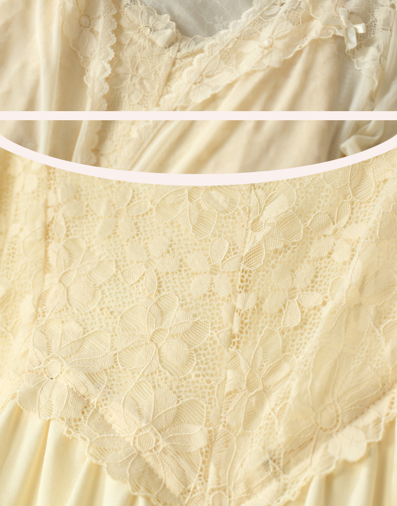 PRDN121100029 長袖睡袍女秋胸墊吊帶裙法式宮廷風睡衣網紗晨袍外穿家居服套裝春