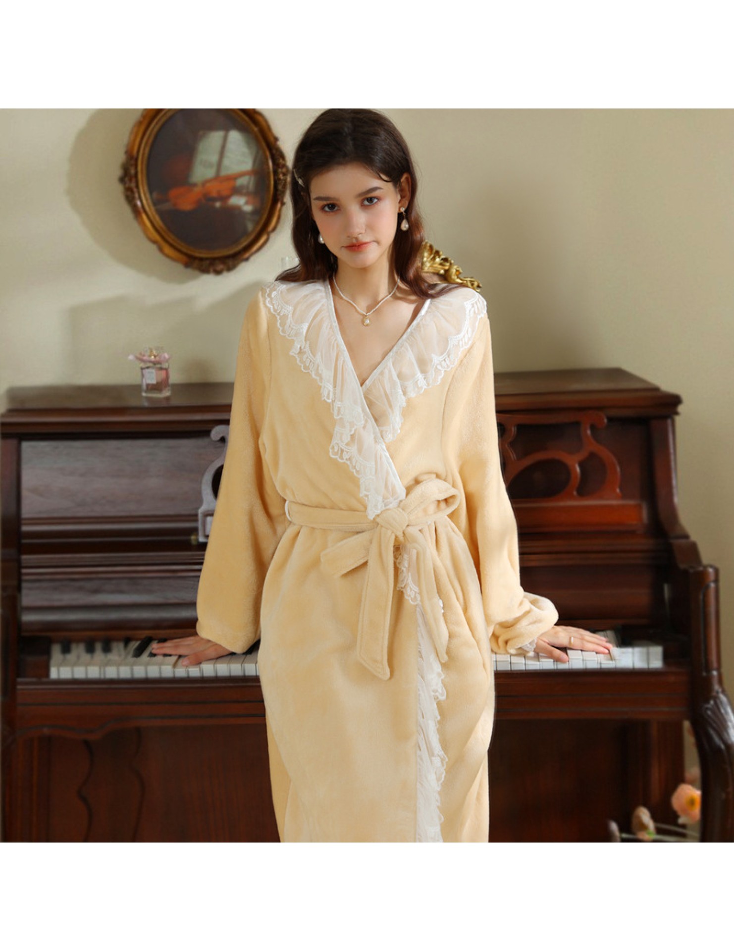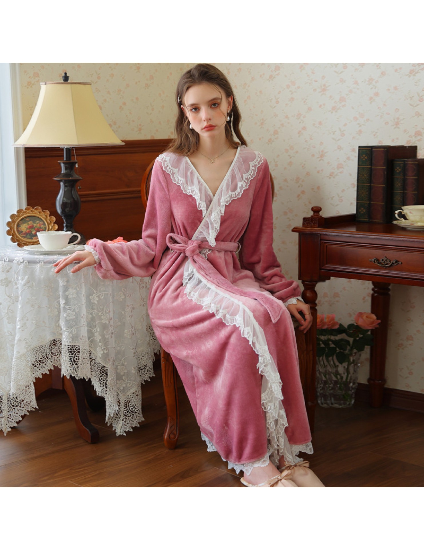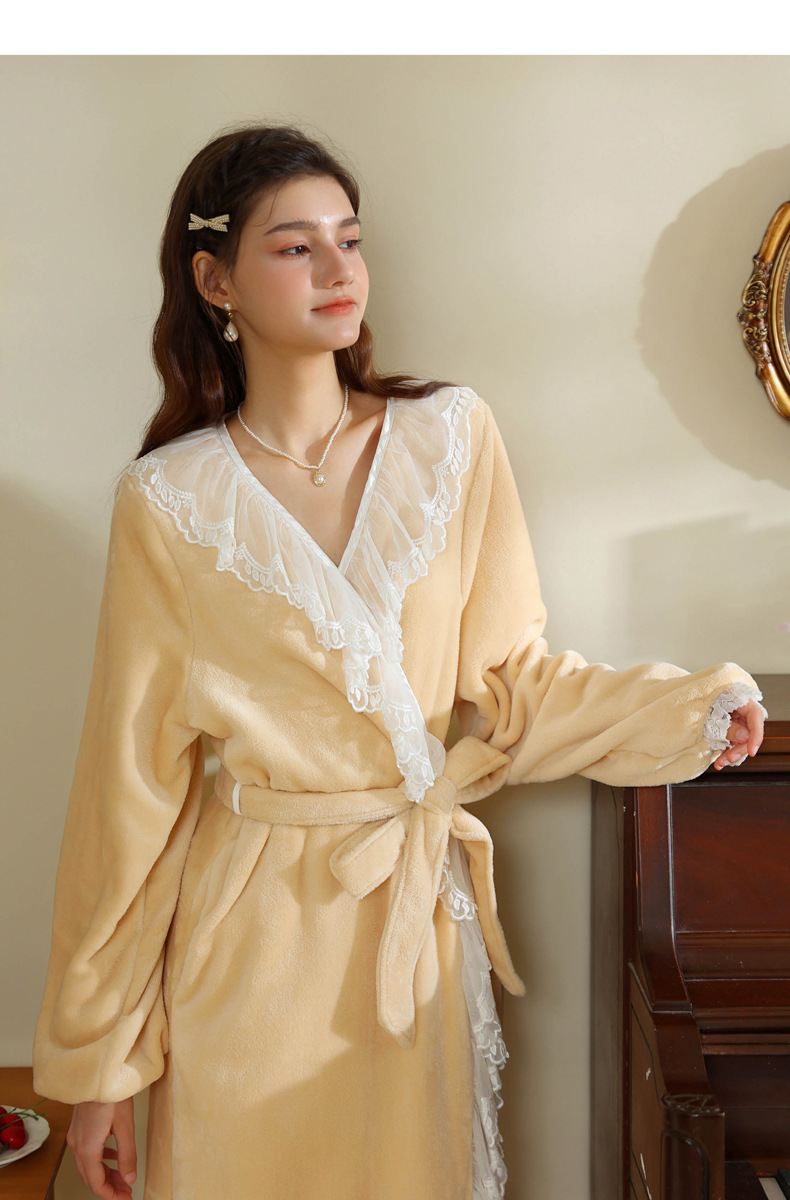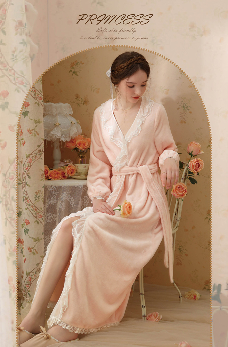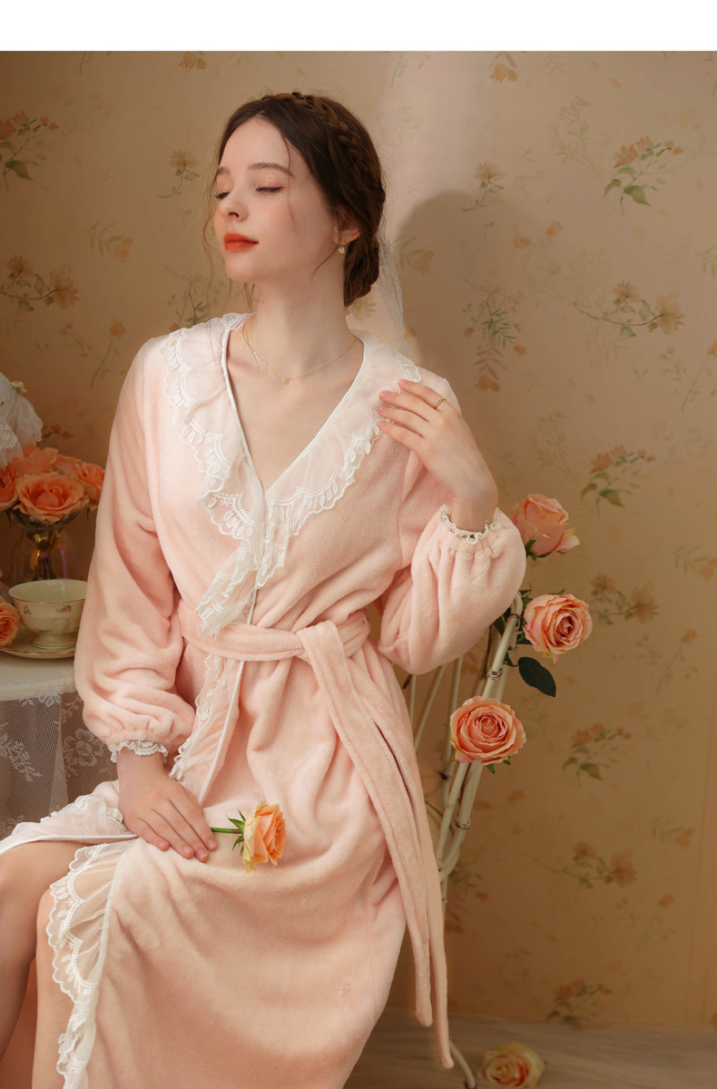 TCLN122100006 秋冬性感蕾絲睡袍絨睡衣女宮廷風法式復古長袖長款加厚保暖家居服