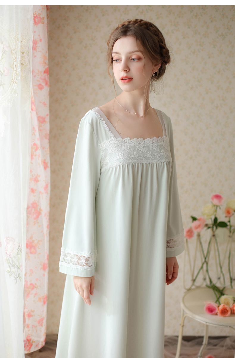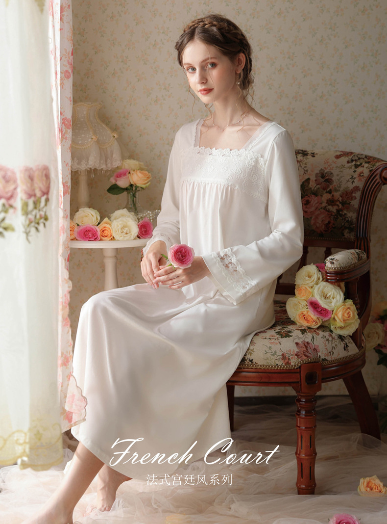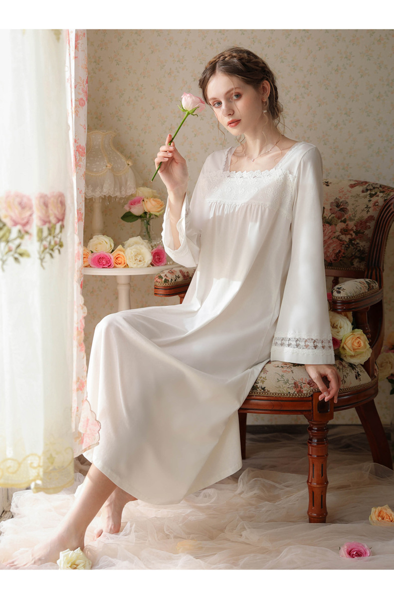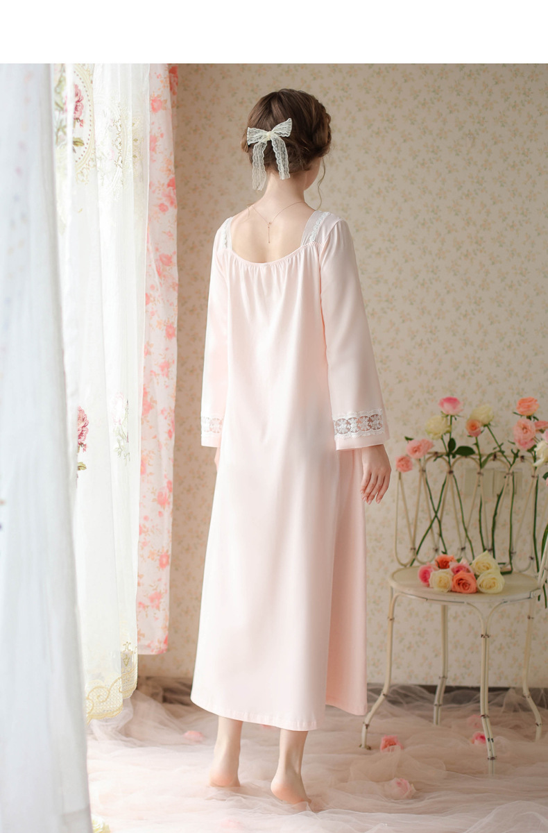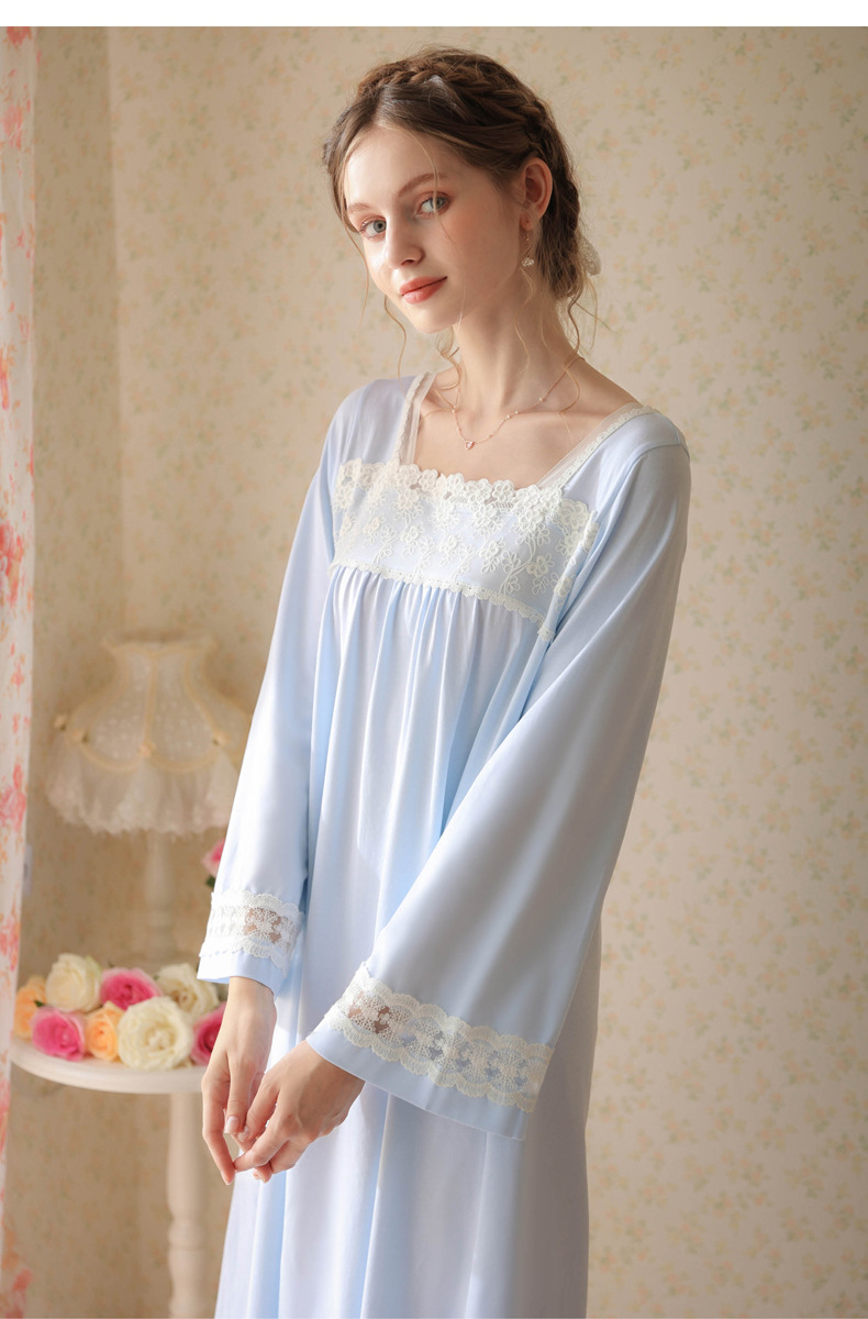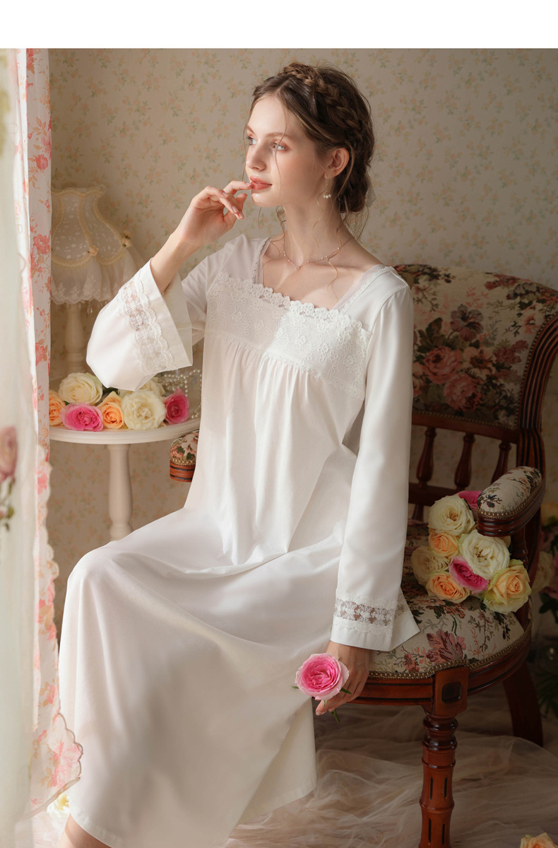 TCLN122100017 漢服睡衣女春秋薄款長袖蕾絲古風國甜美長裙方領少女寬松長款睡裙