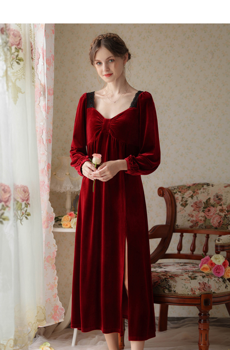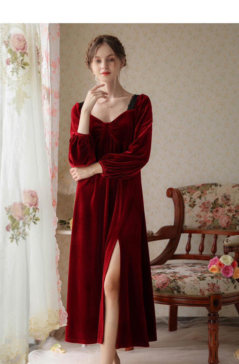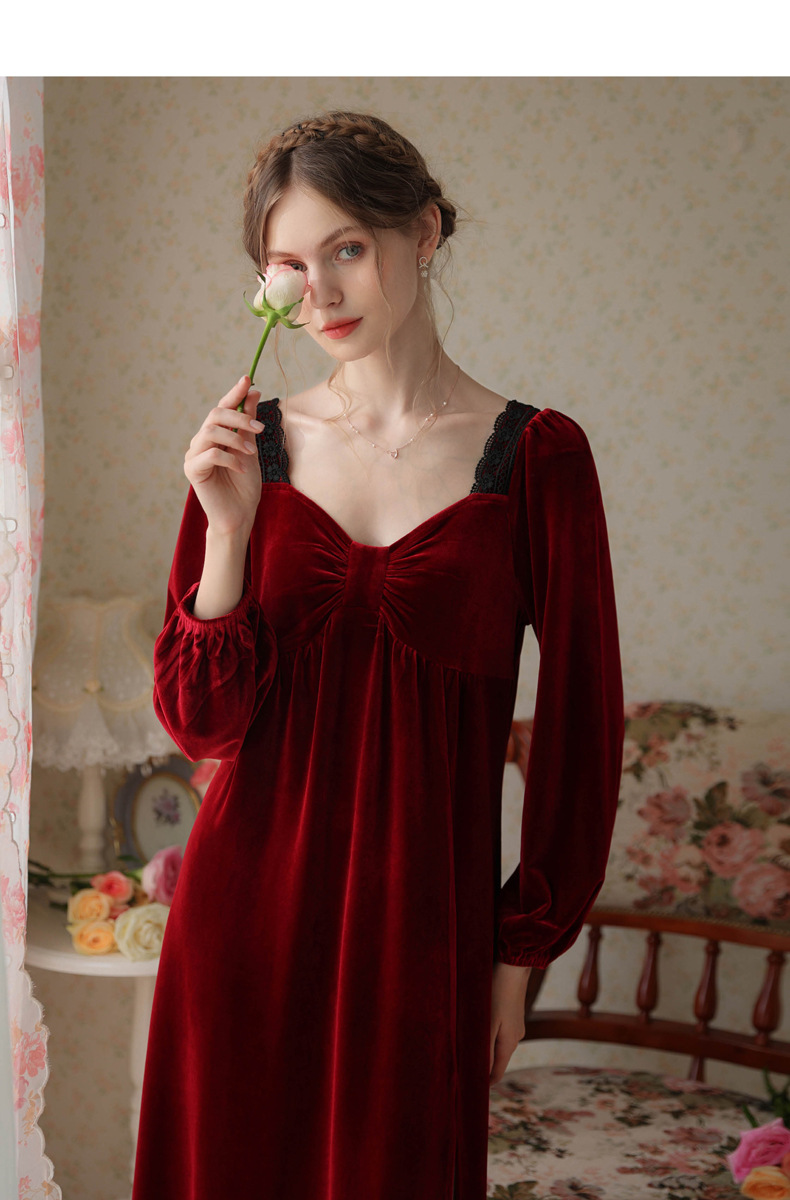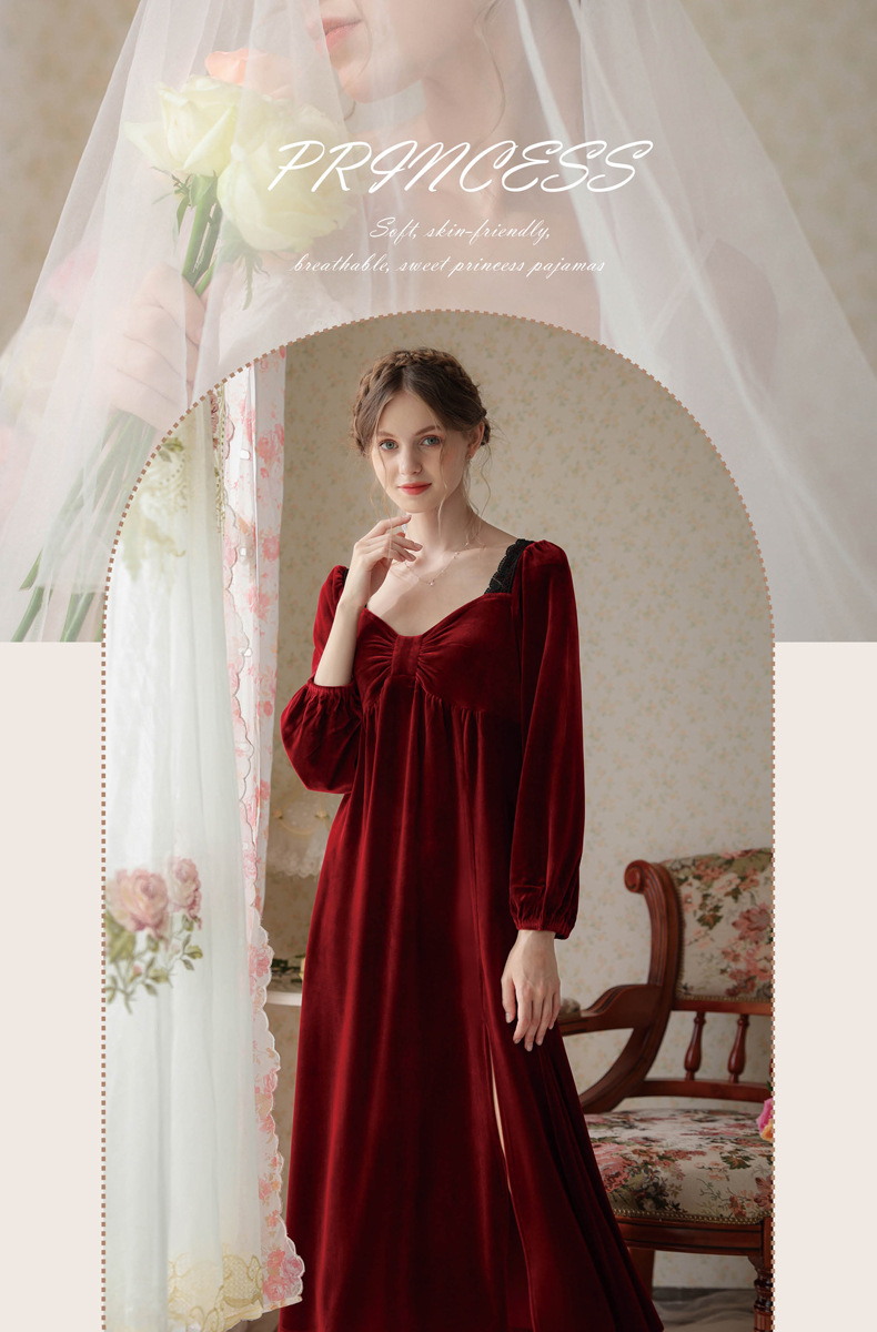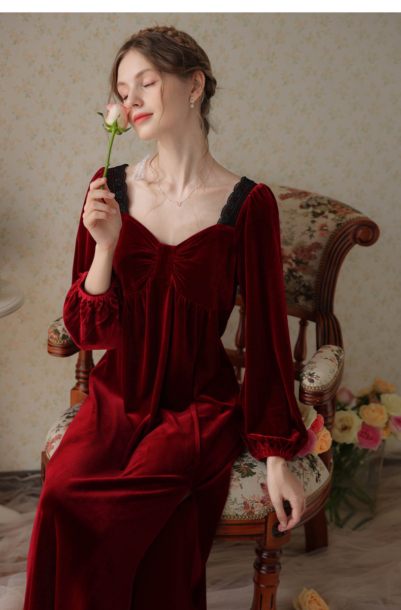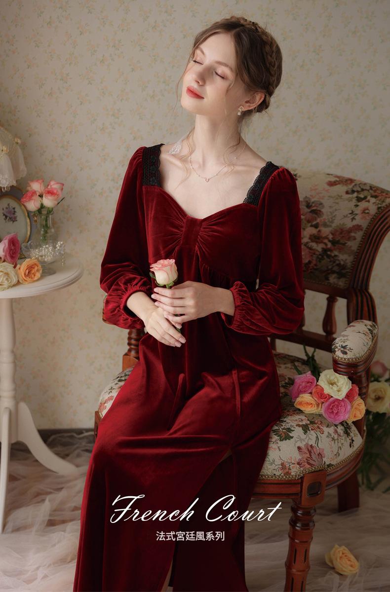 TCLN122100041 法式長款睡裙秋冬紅色絨厚款宮廷長袖性感女加絨睡衣