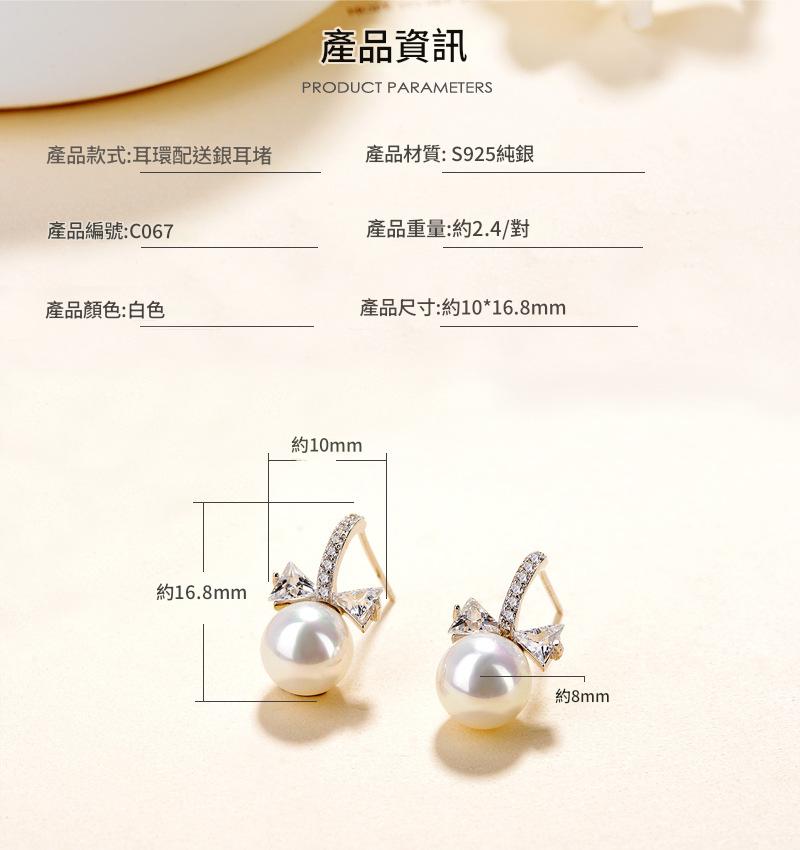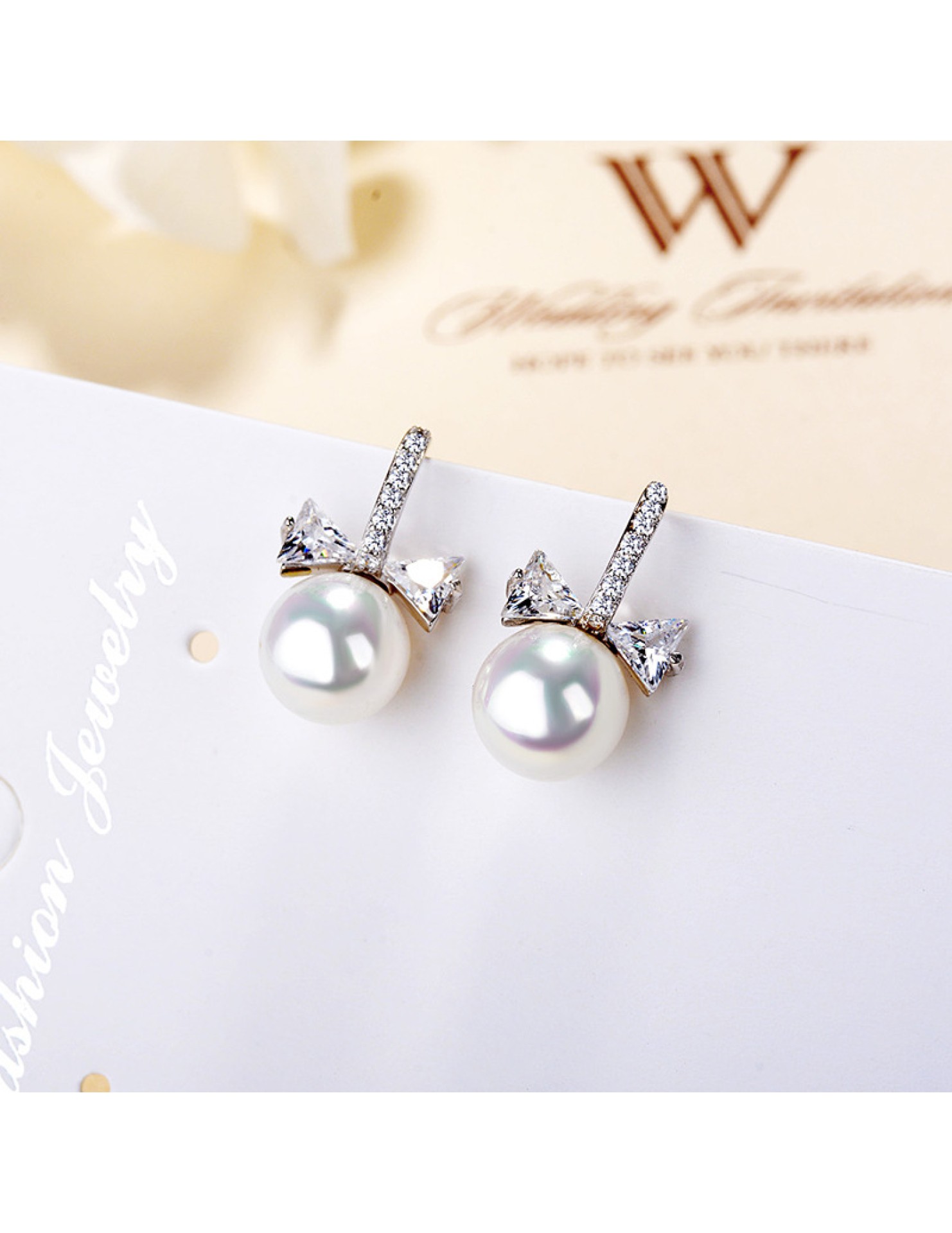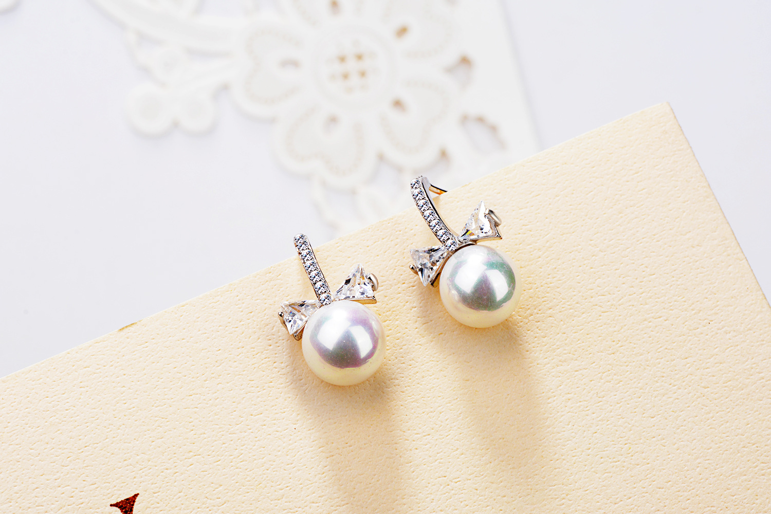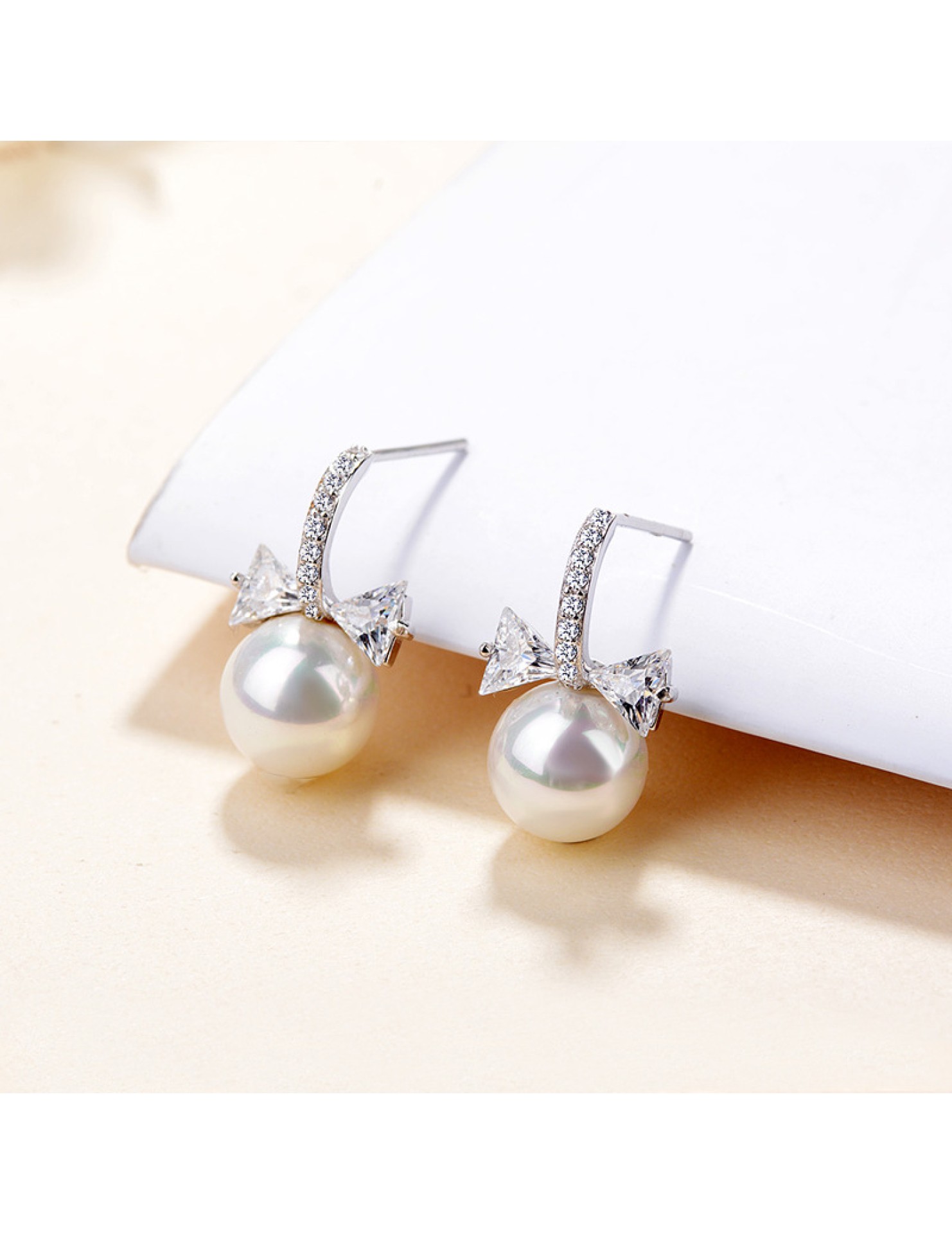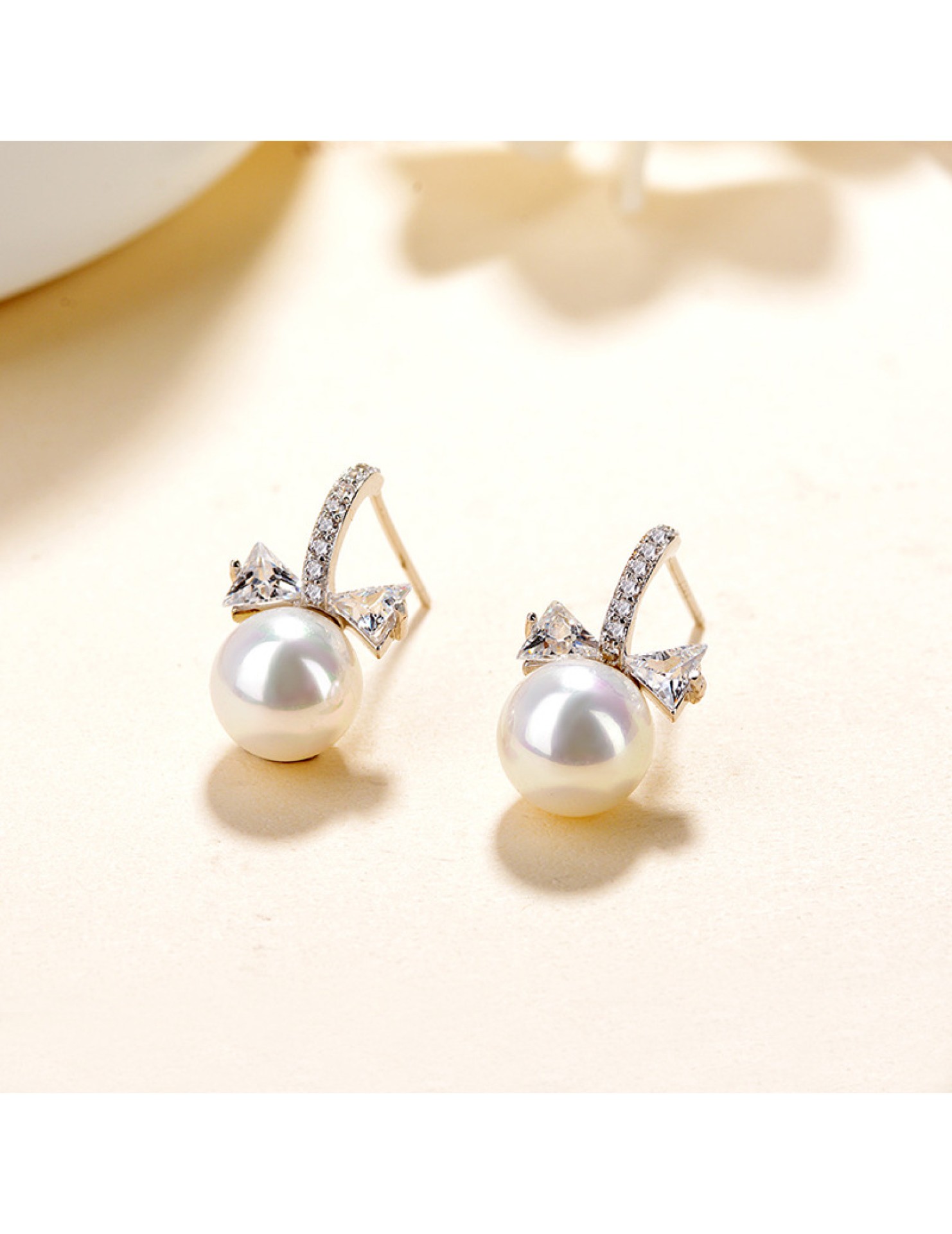 SATN122E100395 S925純銀女生簡約貝珠蝴蝶結珍珠耳釘韓版氣質甜美耳飾代發