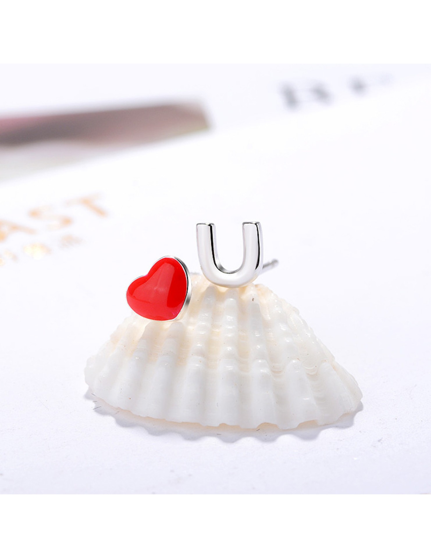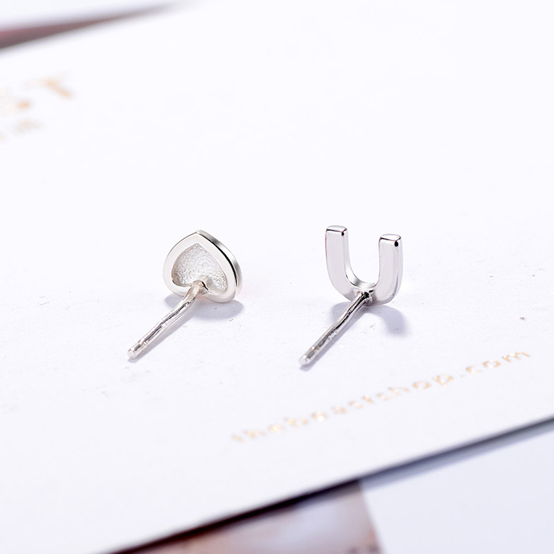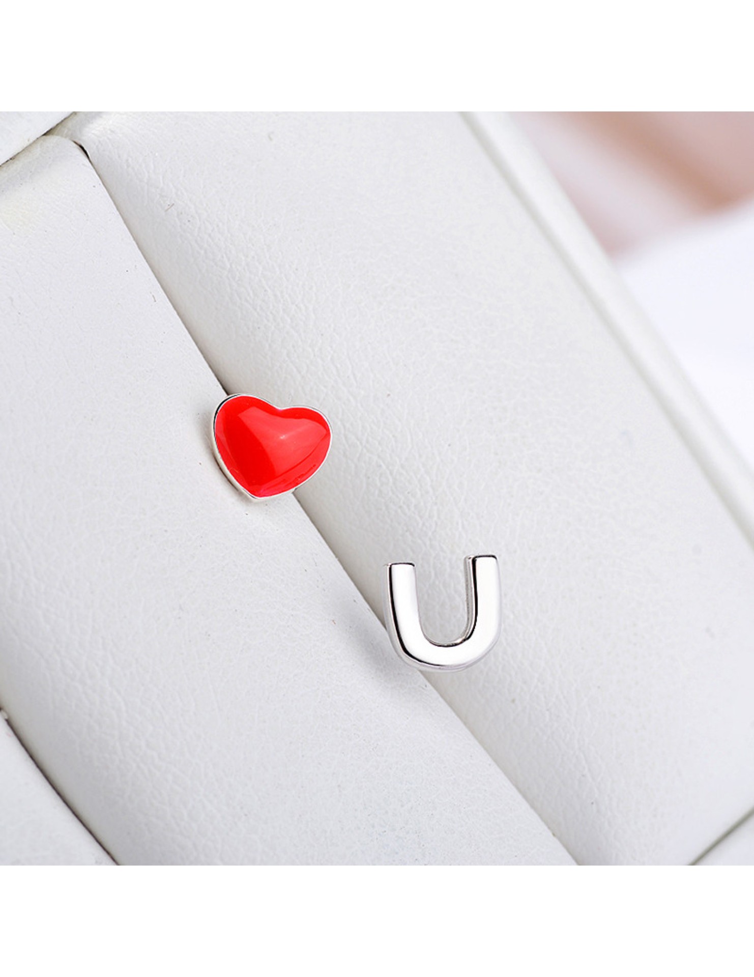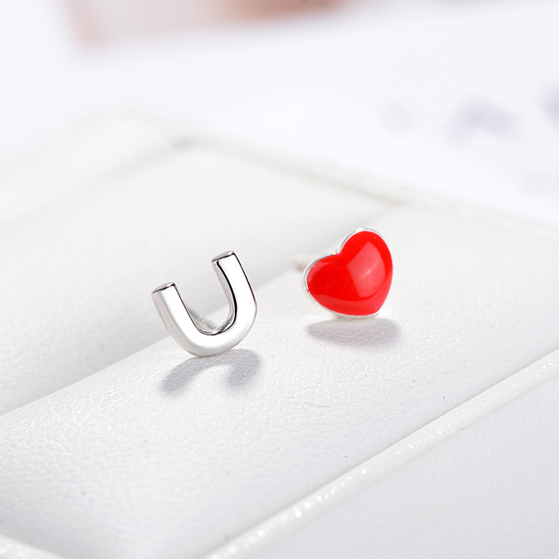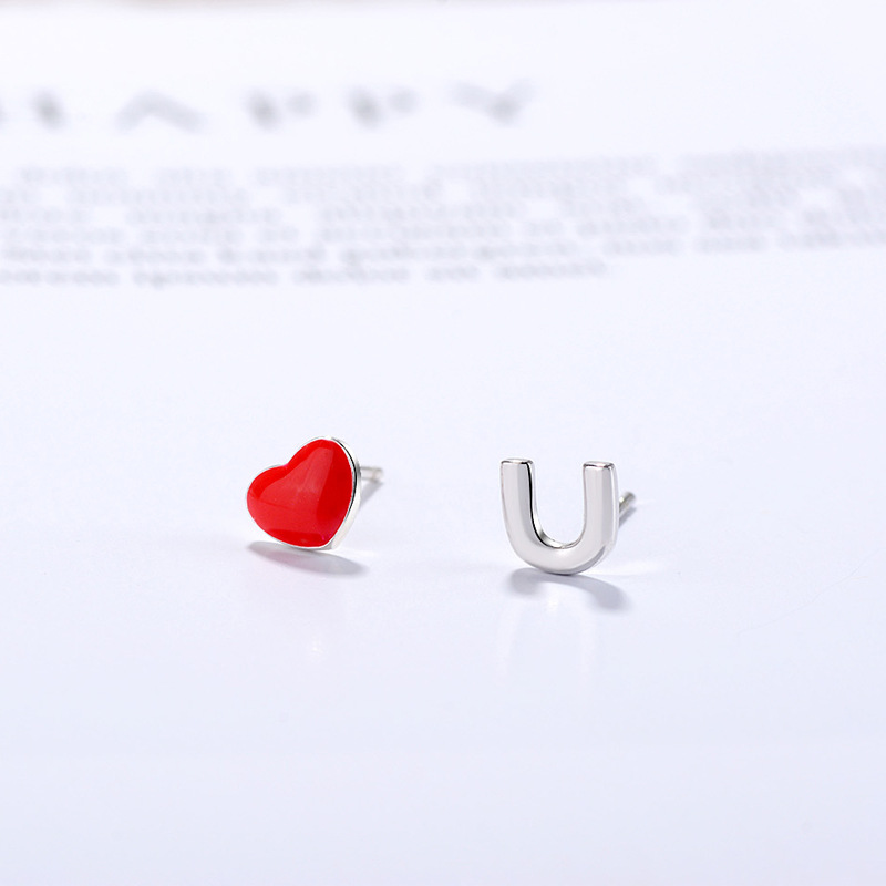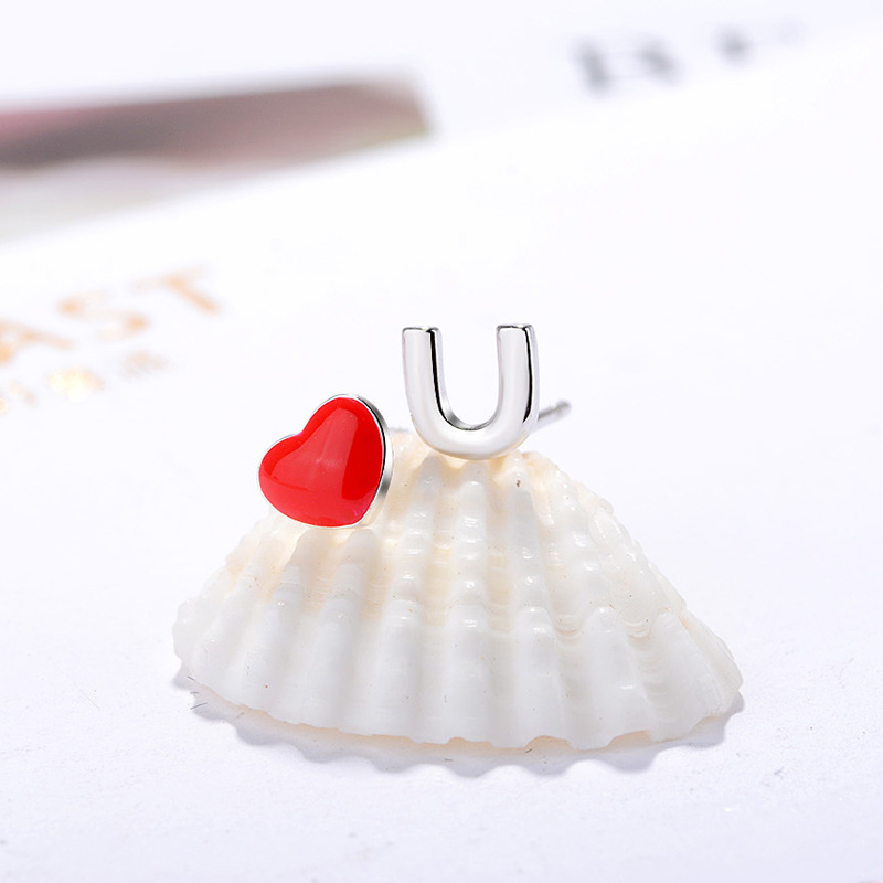 SATN122E100407 S925純銀愛心不對稱字母耳釘女紅色滴釉小巧耳環簡約甜美氣質耳飾
