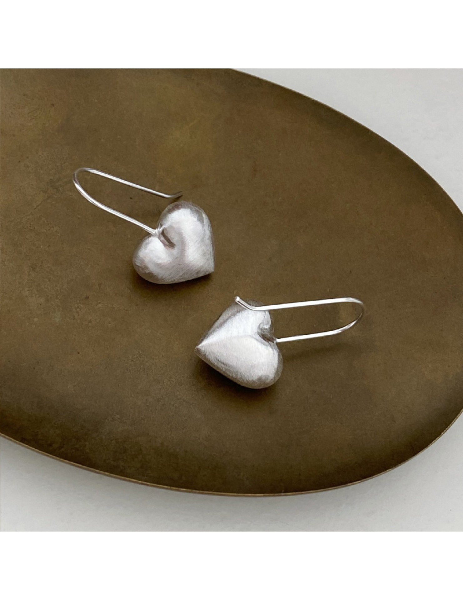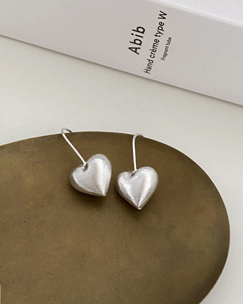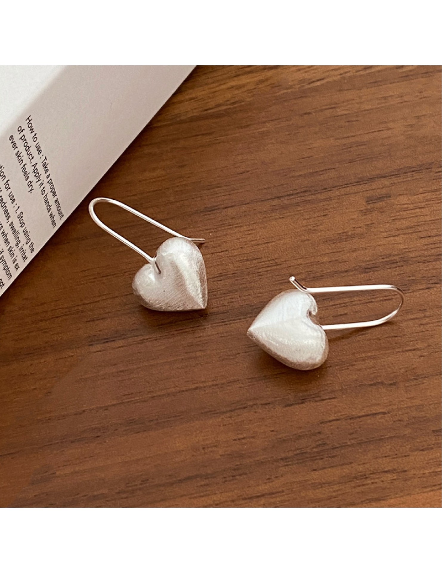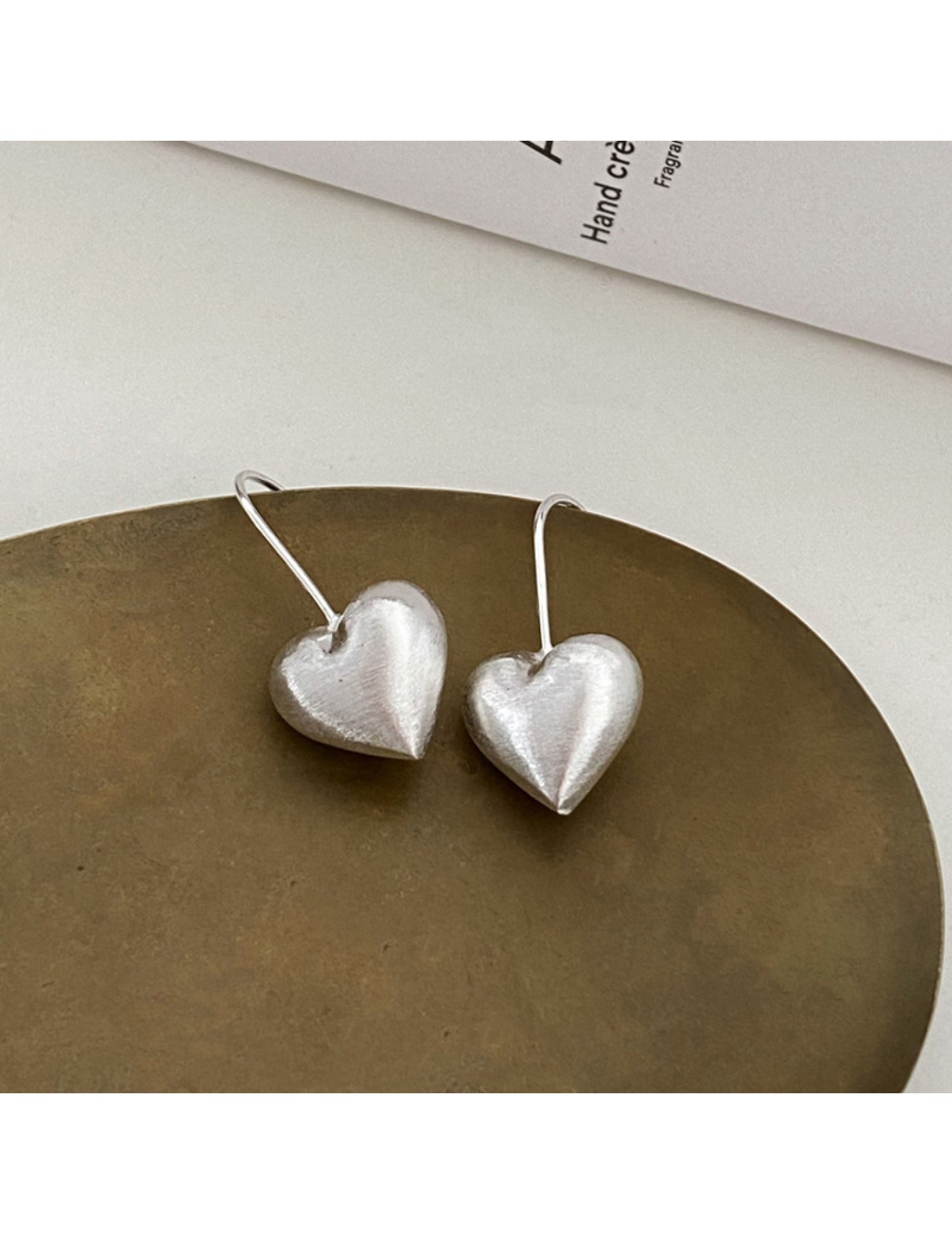 SATN122E100334 S925純銀新款立體大愛心拉絲耳環女磨砂桃心形耳鉤甜美簡約耳飾品