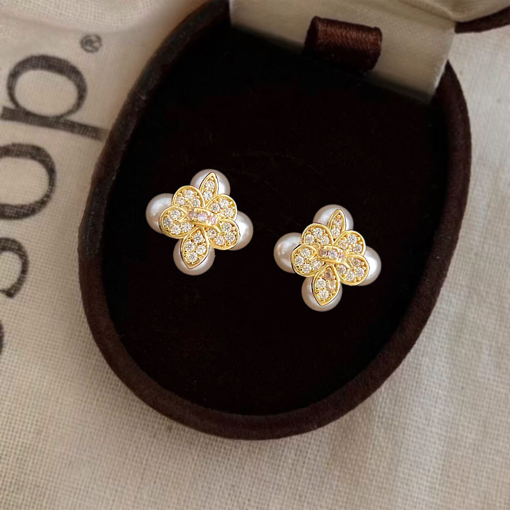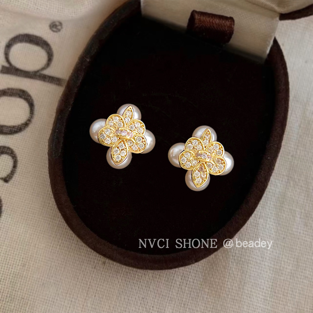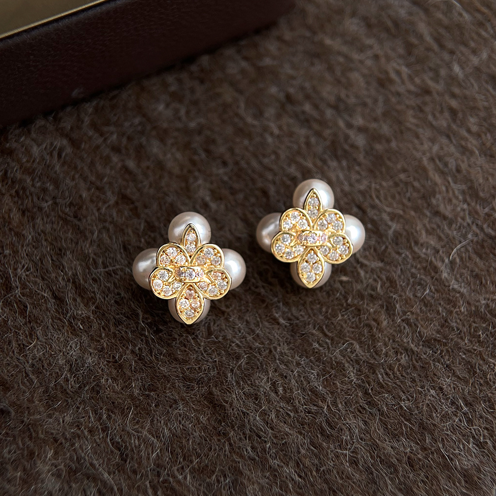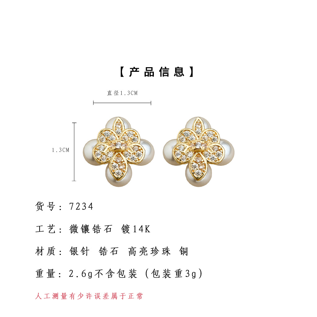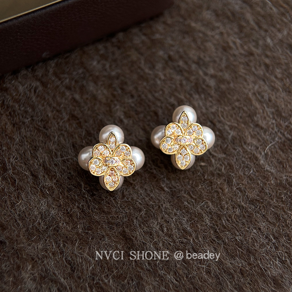 HELN124100333 鳶尾花微鑲鋯石925銀針鍍14K保色電鍍時尚高級感耳釘