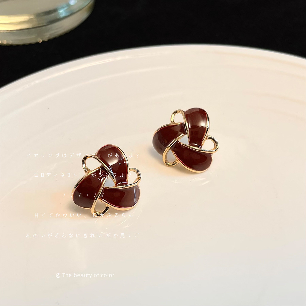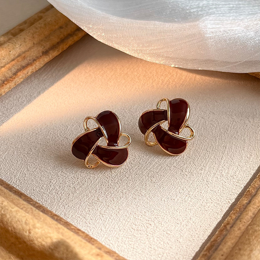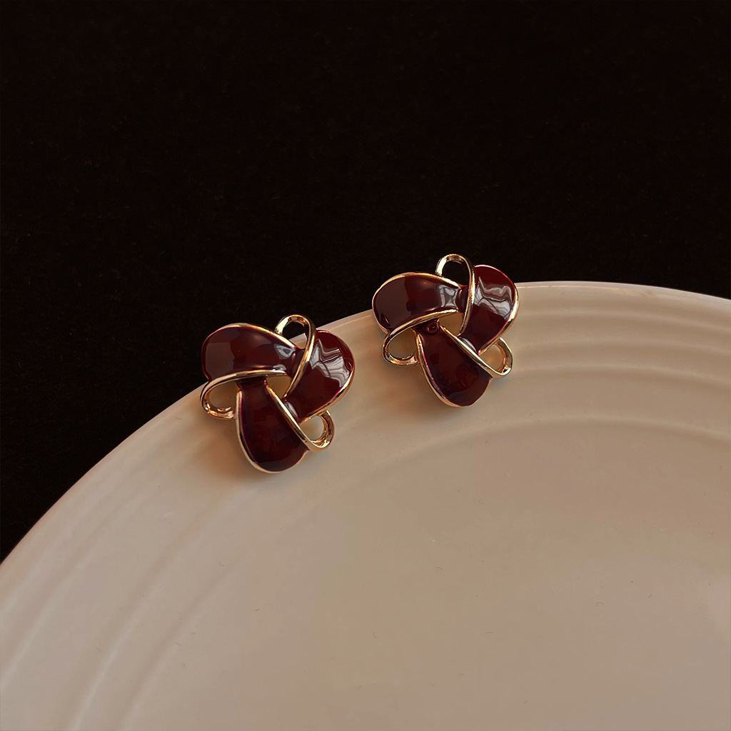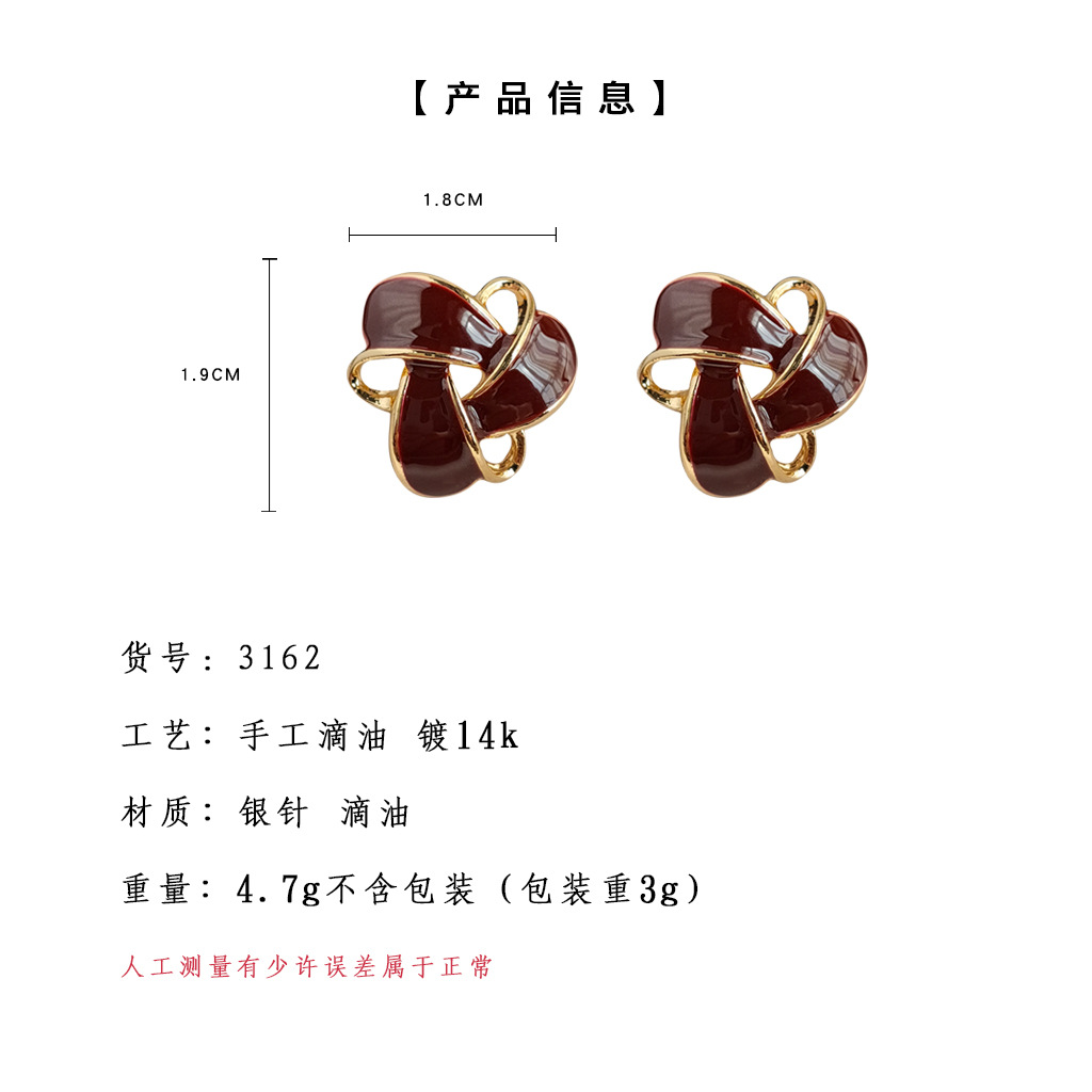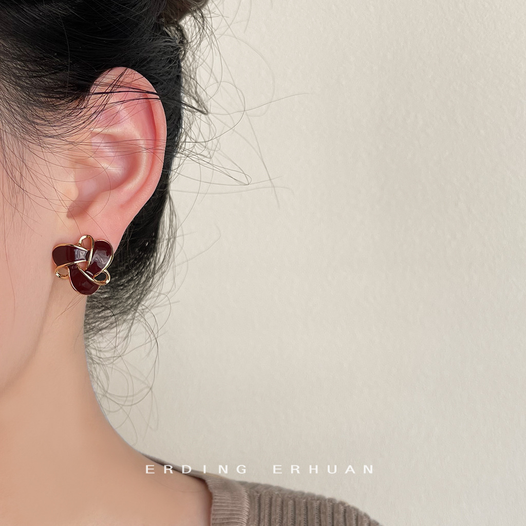 HELN124100367 復古酒紅色氣質幾何鏤空滴油鍍14K耳釘百搭高級感通勤耳飾女