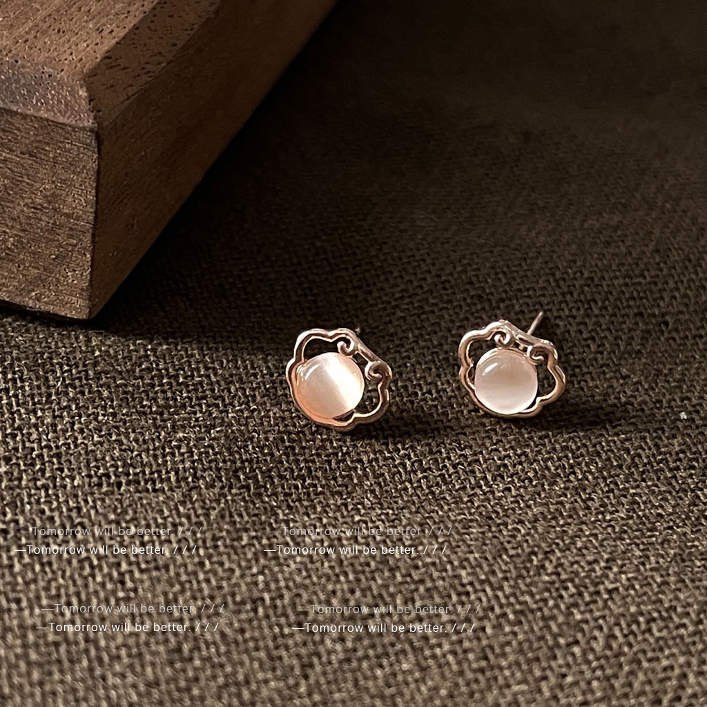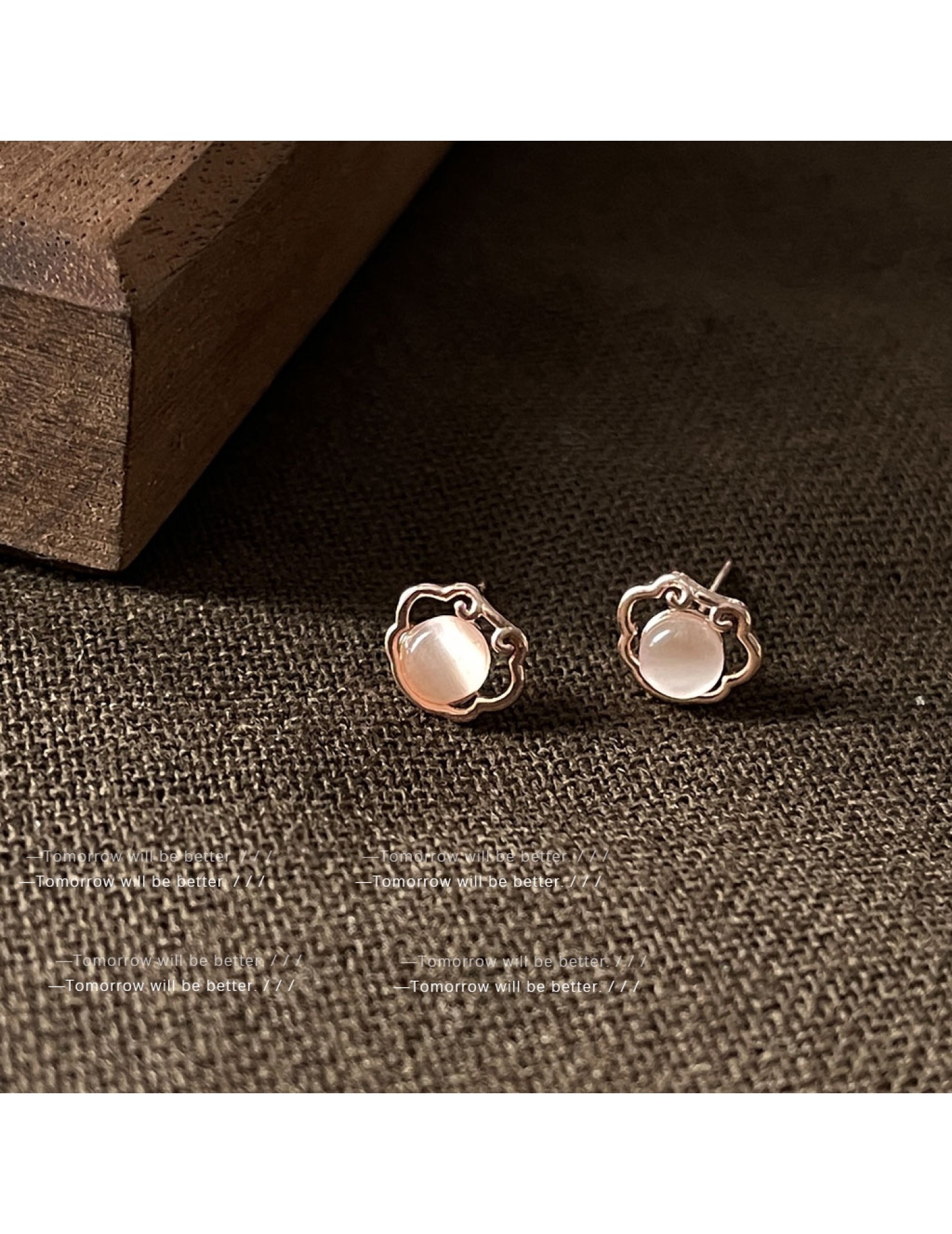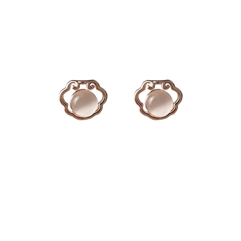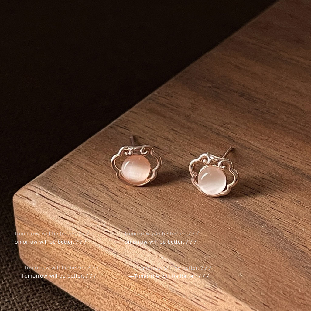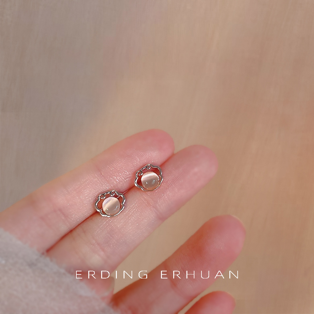 HELN124100376 如意平安長命鎖玻璃貓眼石925銀針迷你版玫瑰金耳釘女 新款耳飾