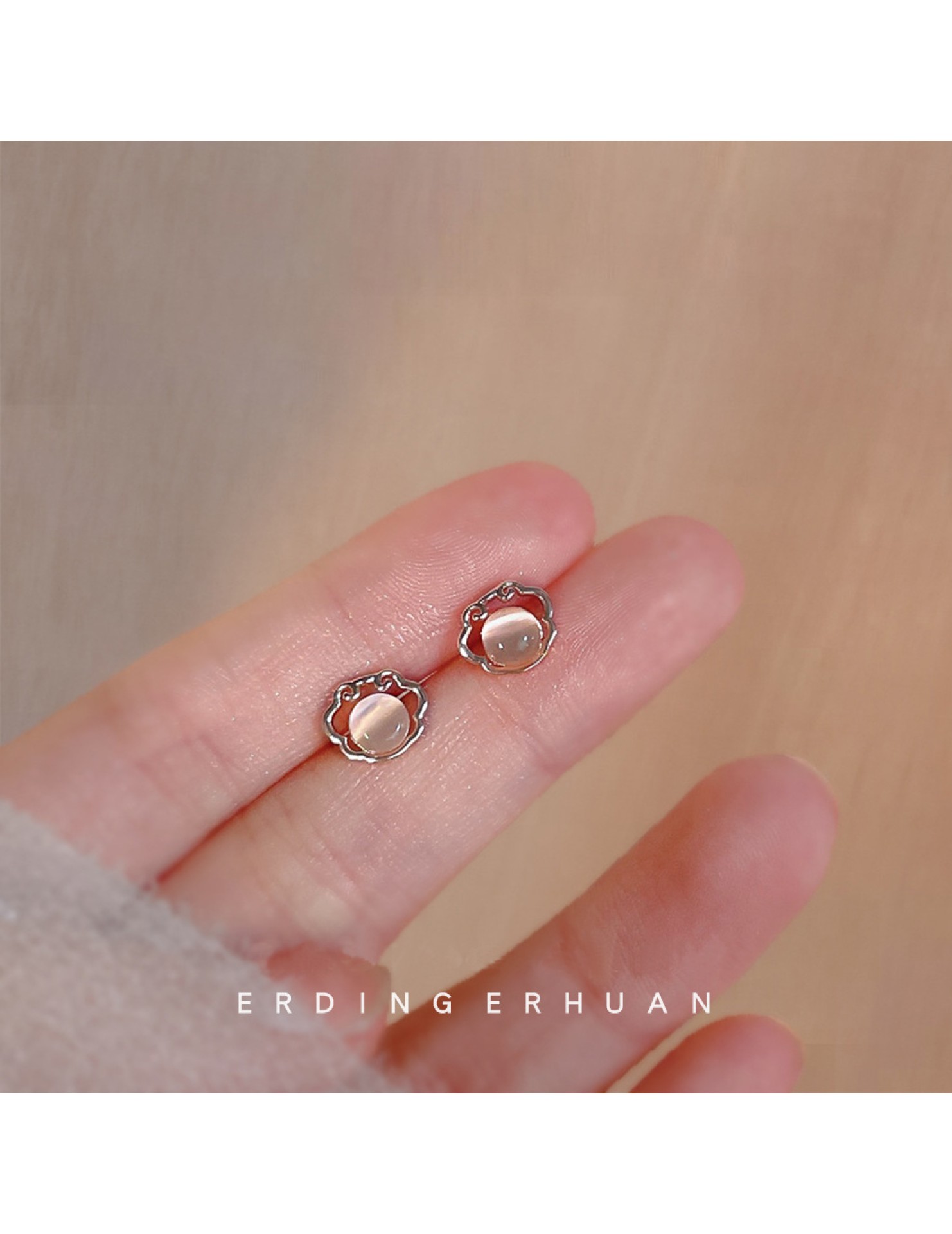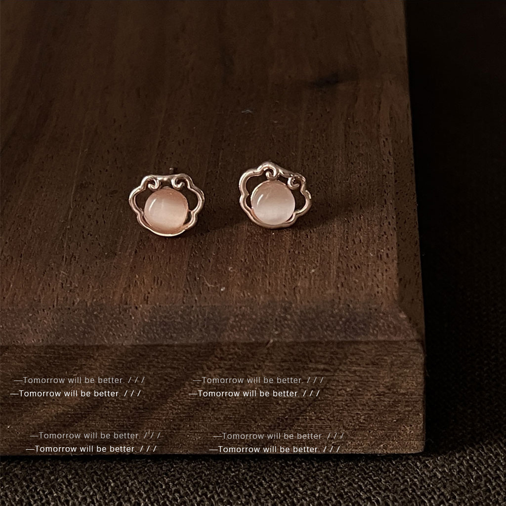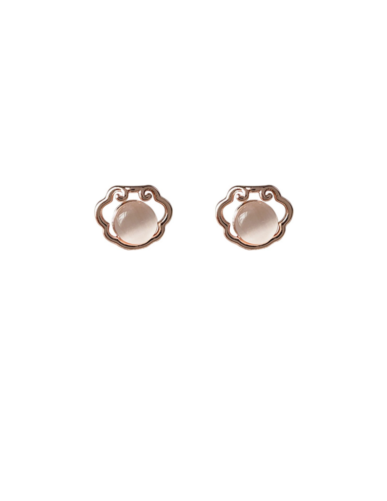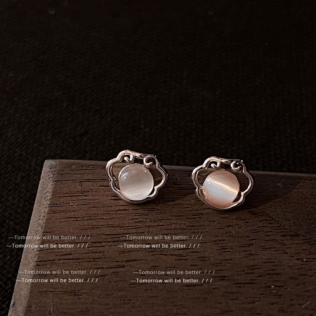 HELN124100376 如意平安長命鎖玻璃貓眼石925銀針迷你版玫瑰金耳釘女 新款耳飾