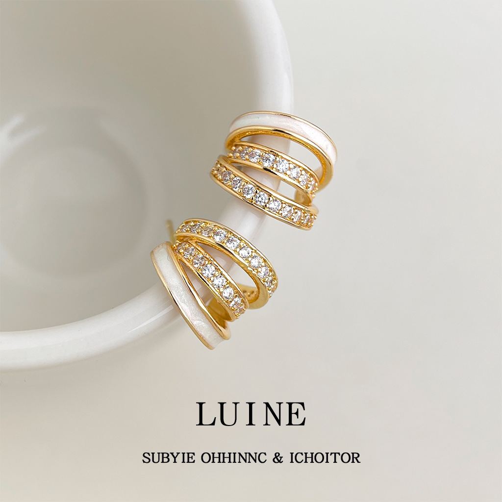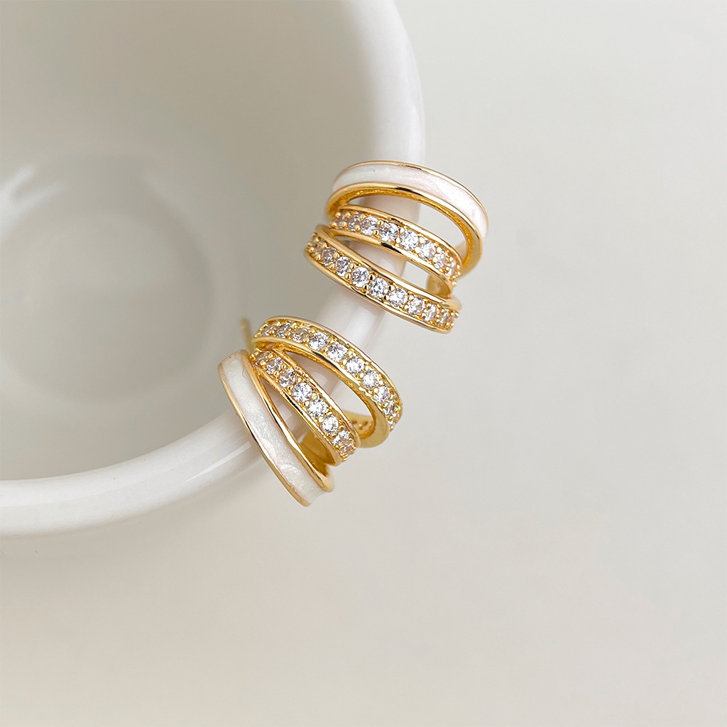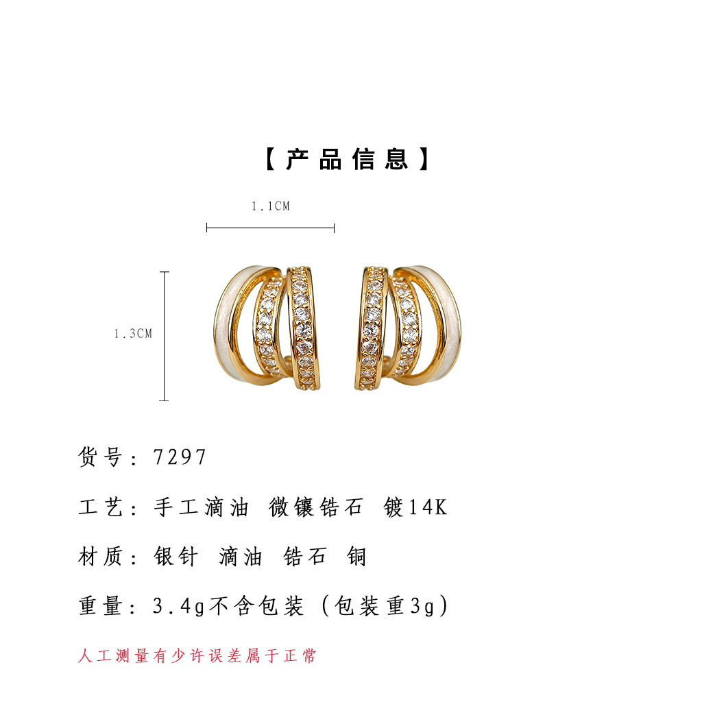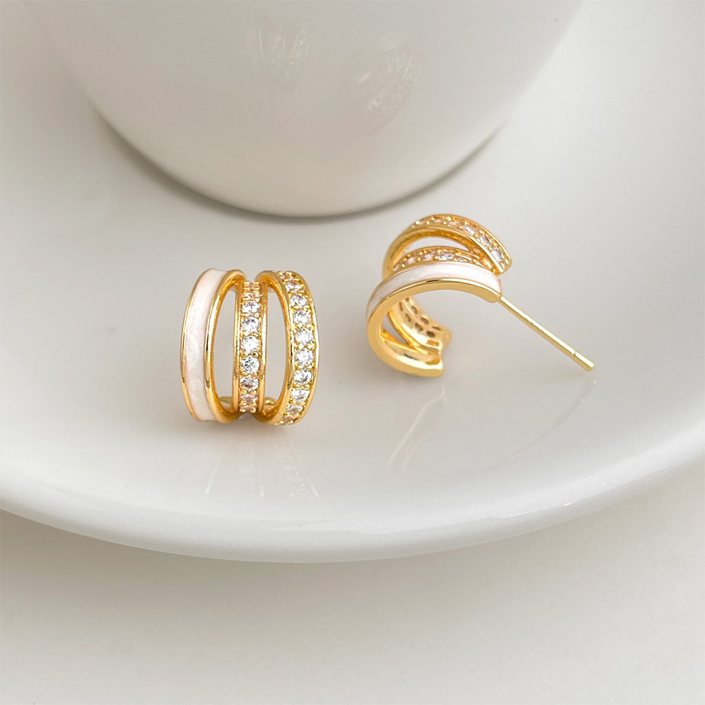 HELN124100294 時尚高級感線條925銀針微鑲鋯石滴釉白色圓形幾何耳飾 耳環女