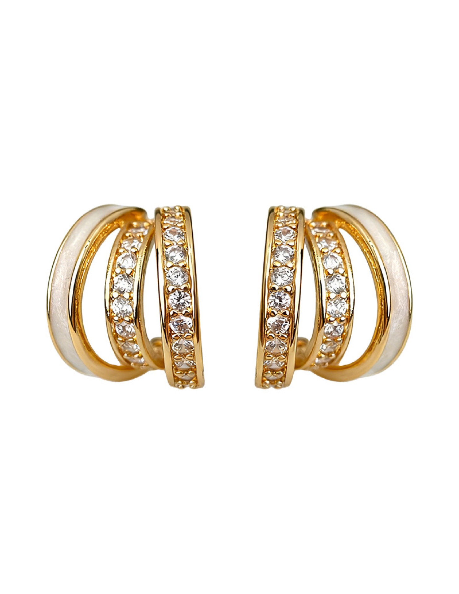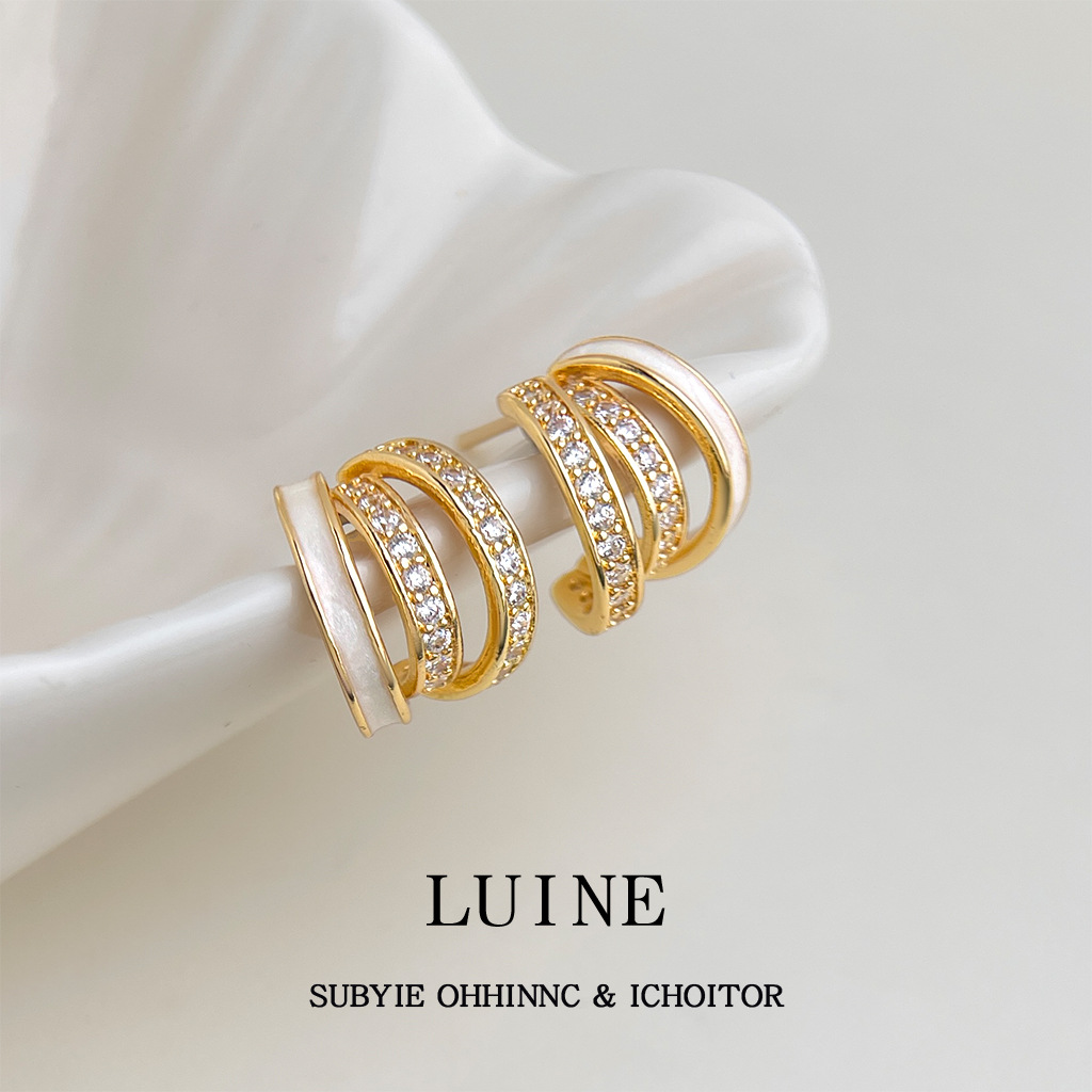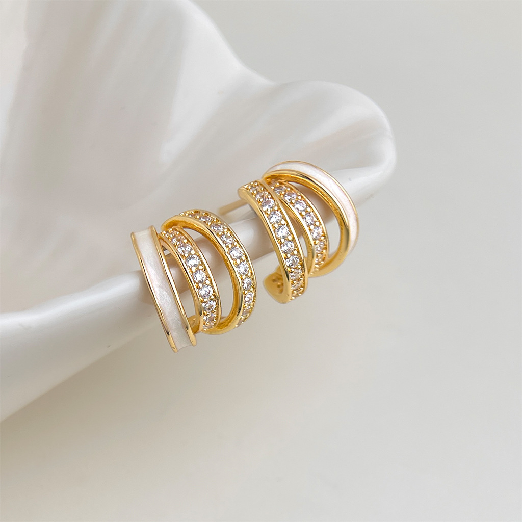 HELN124100294 時尚高級感線條925銀針微鑲鋯石滴釉白色圓形幾何耳飾 耳環女