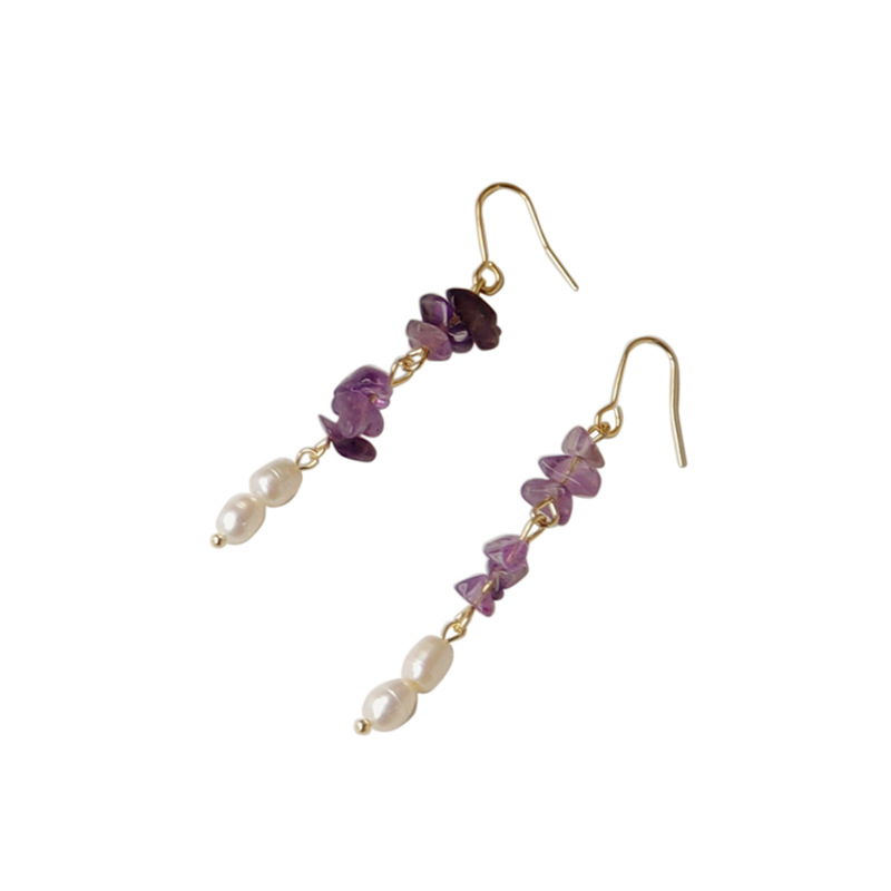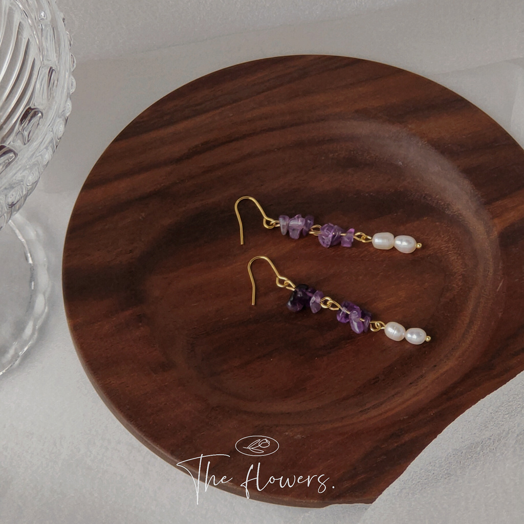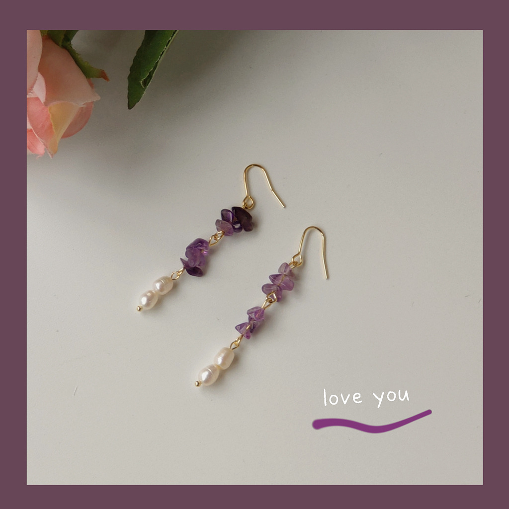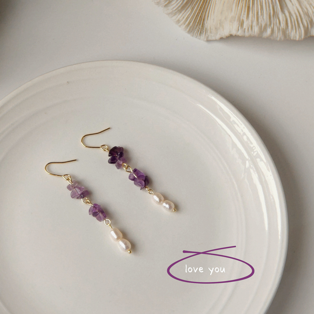 HELN124100298 [浪漫薰衣草]紫碎石淡水珍珠耳環 韓國時尚設計手作氣質長款耳飾