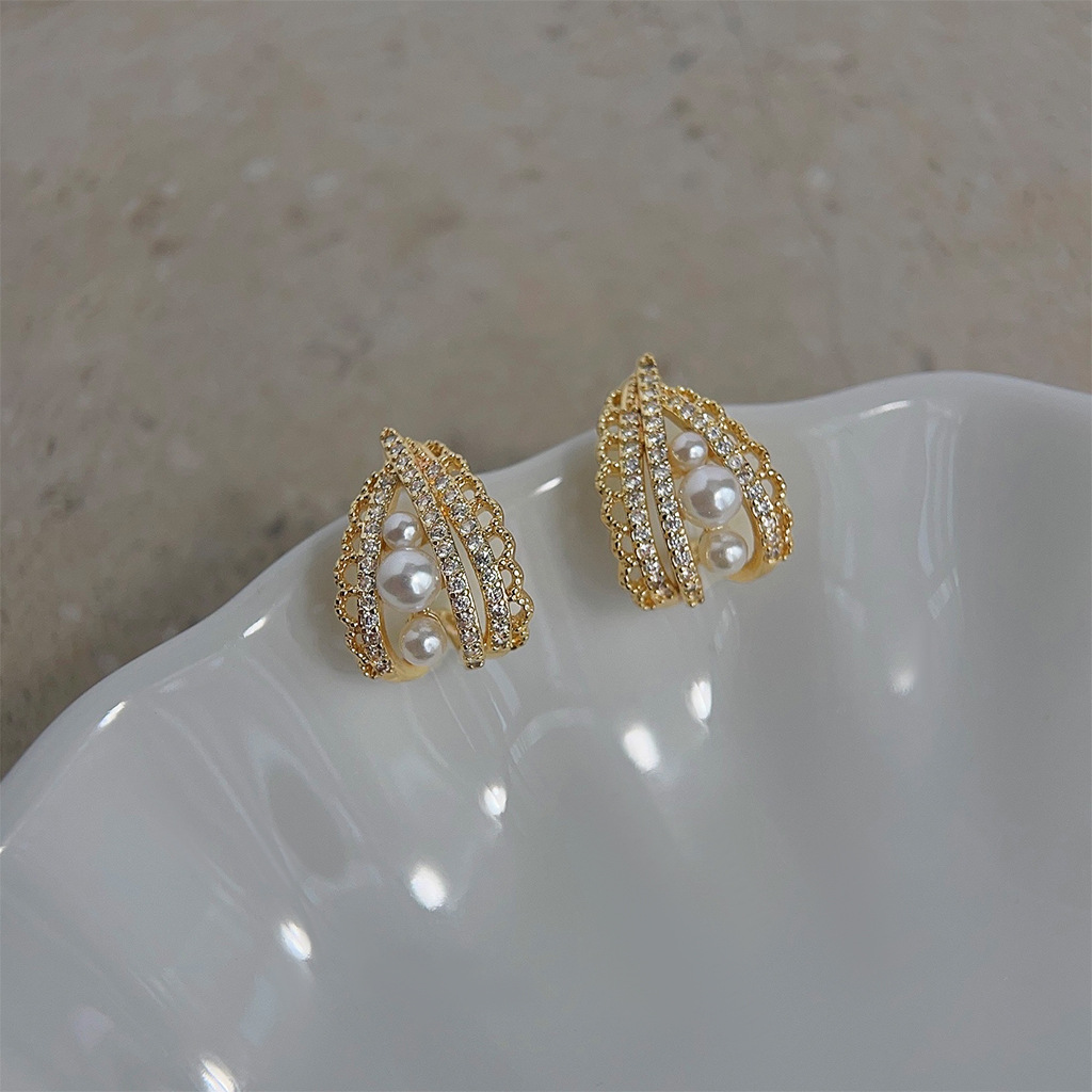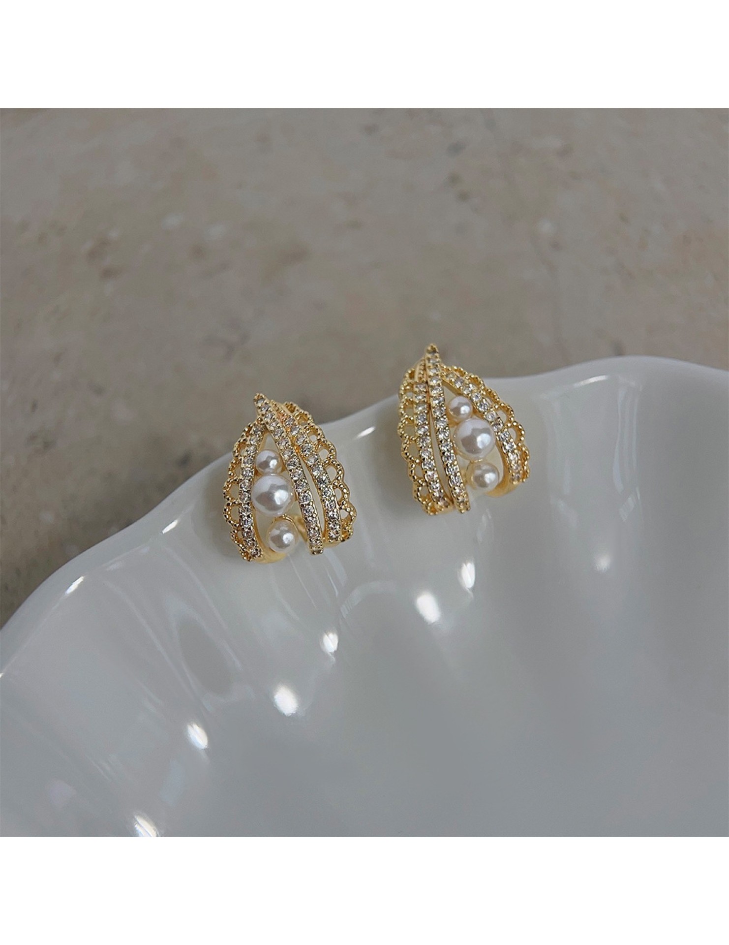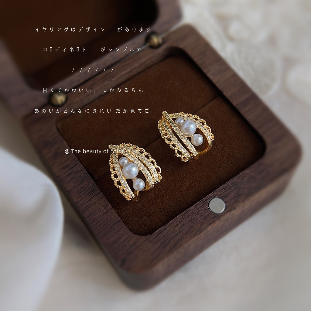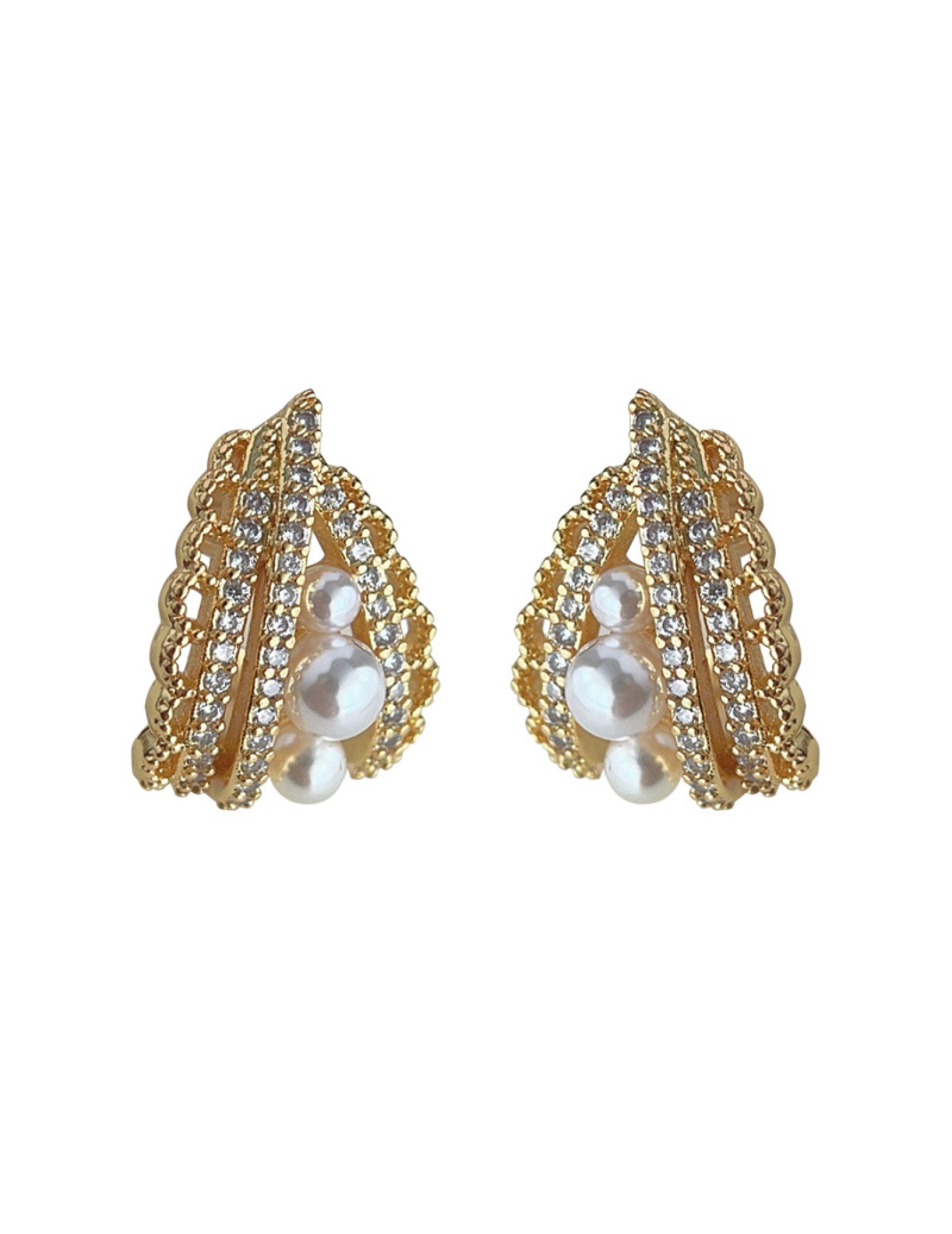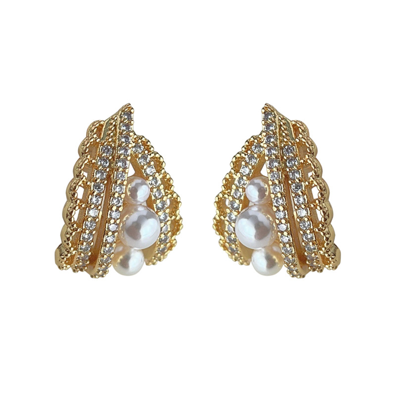 HELN124100320 微鑲鋯石鍍14K法式優雅鏤空蕾絲花邊幾何水滴珍珠耳環女