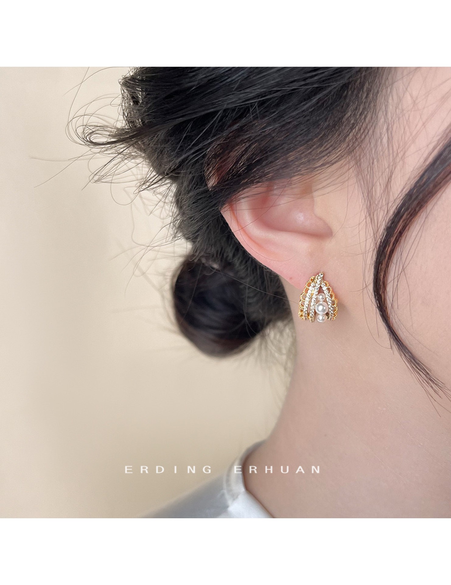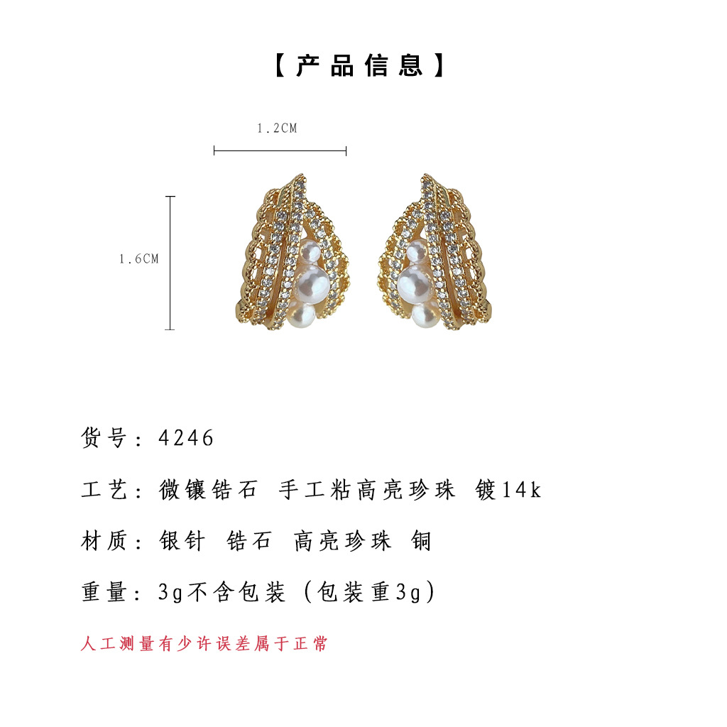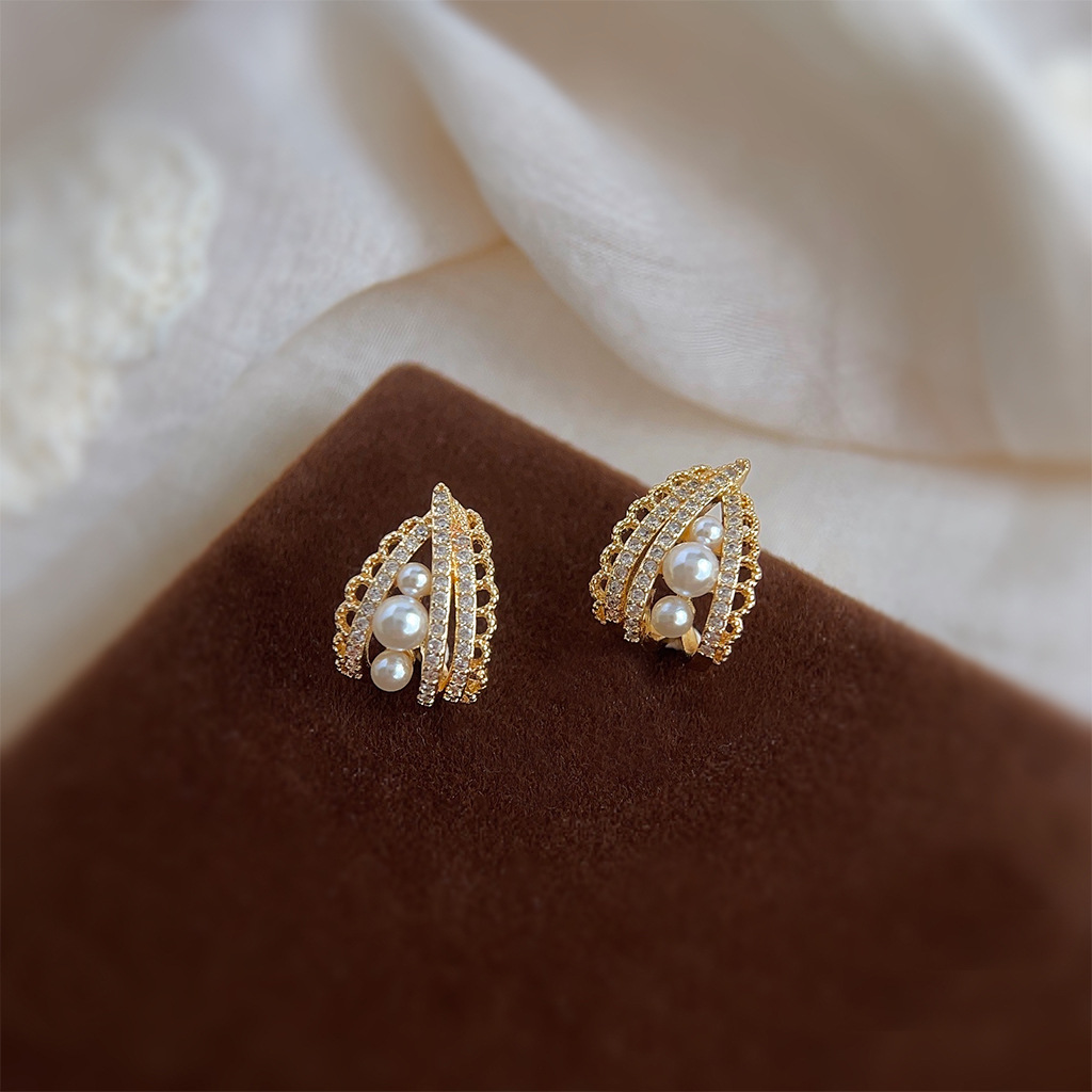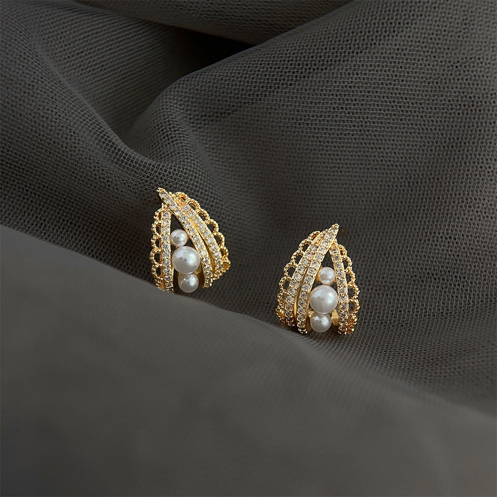 HELN124100320 微鑲鋯石鍍14K法式優雅鏤空蕾絲花邊幾何水滴珍珠耳環女