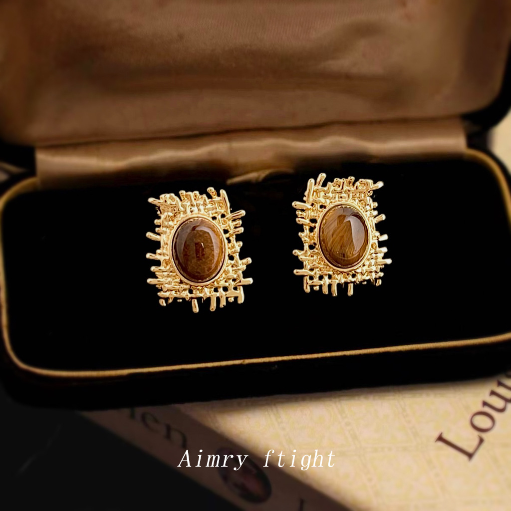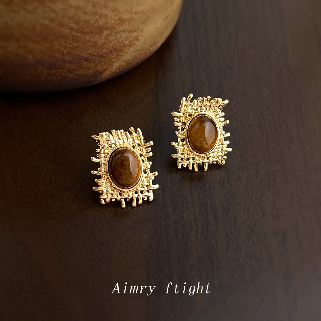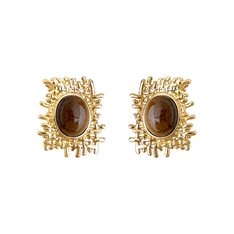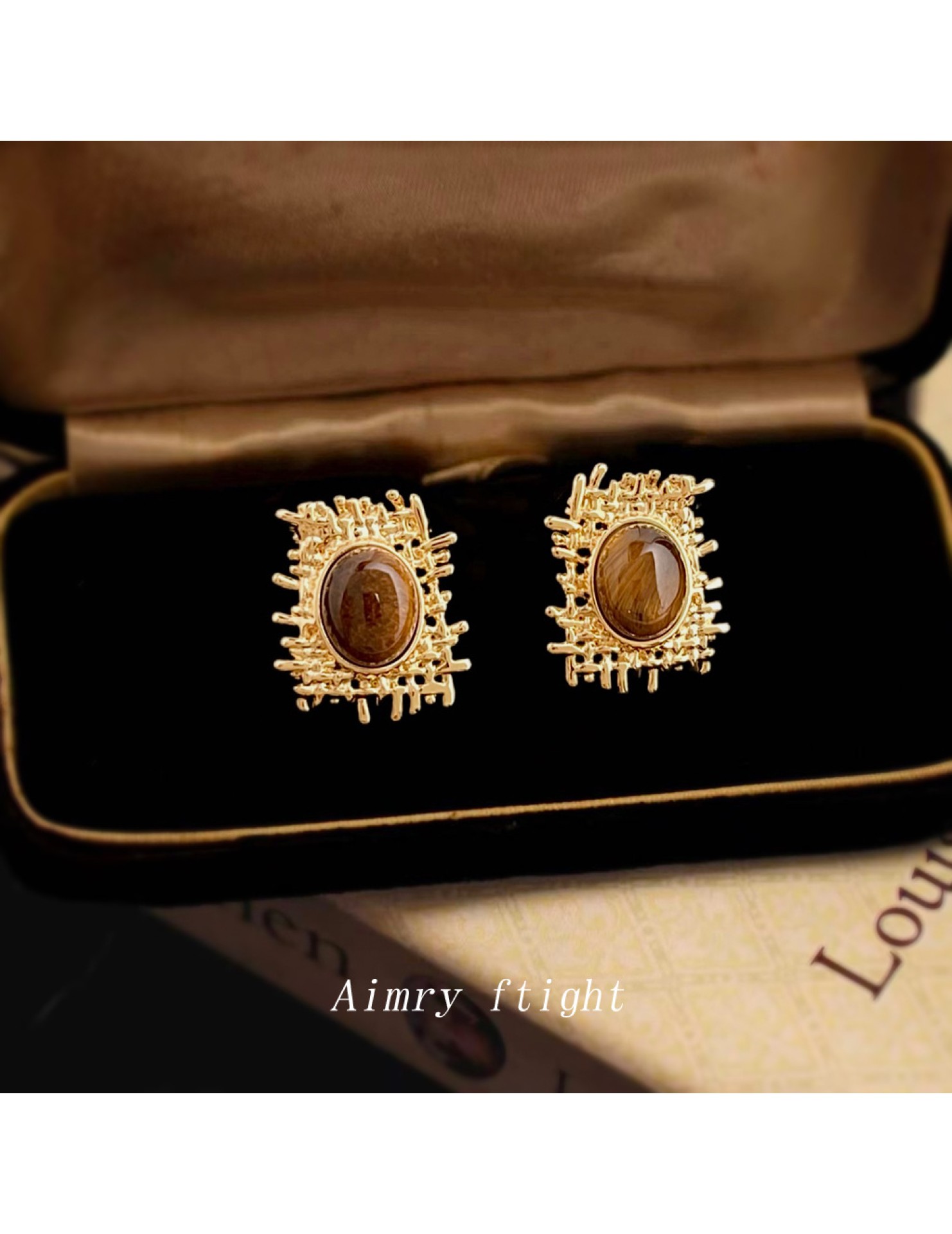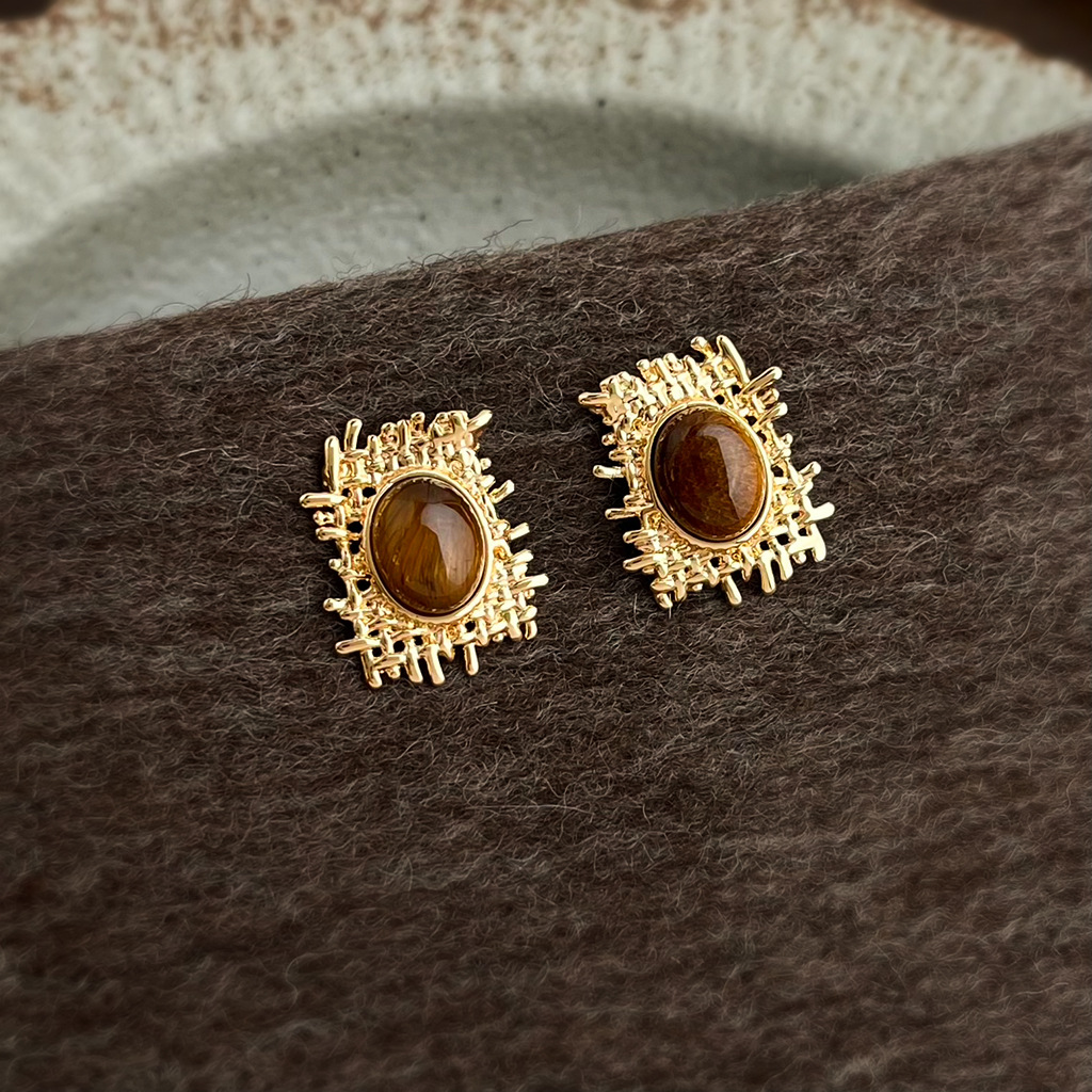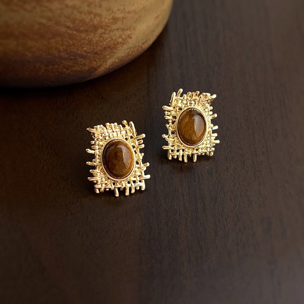 HELN124100326 美拉德風虎眼石天然石設計師款不規則網狀秋冬新款耳環女